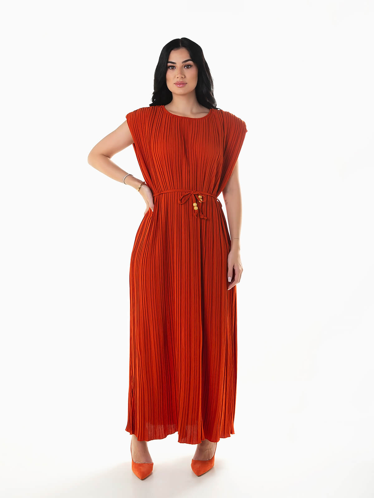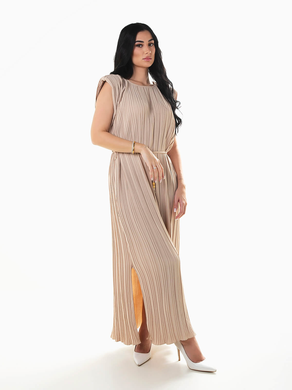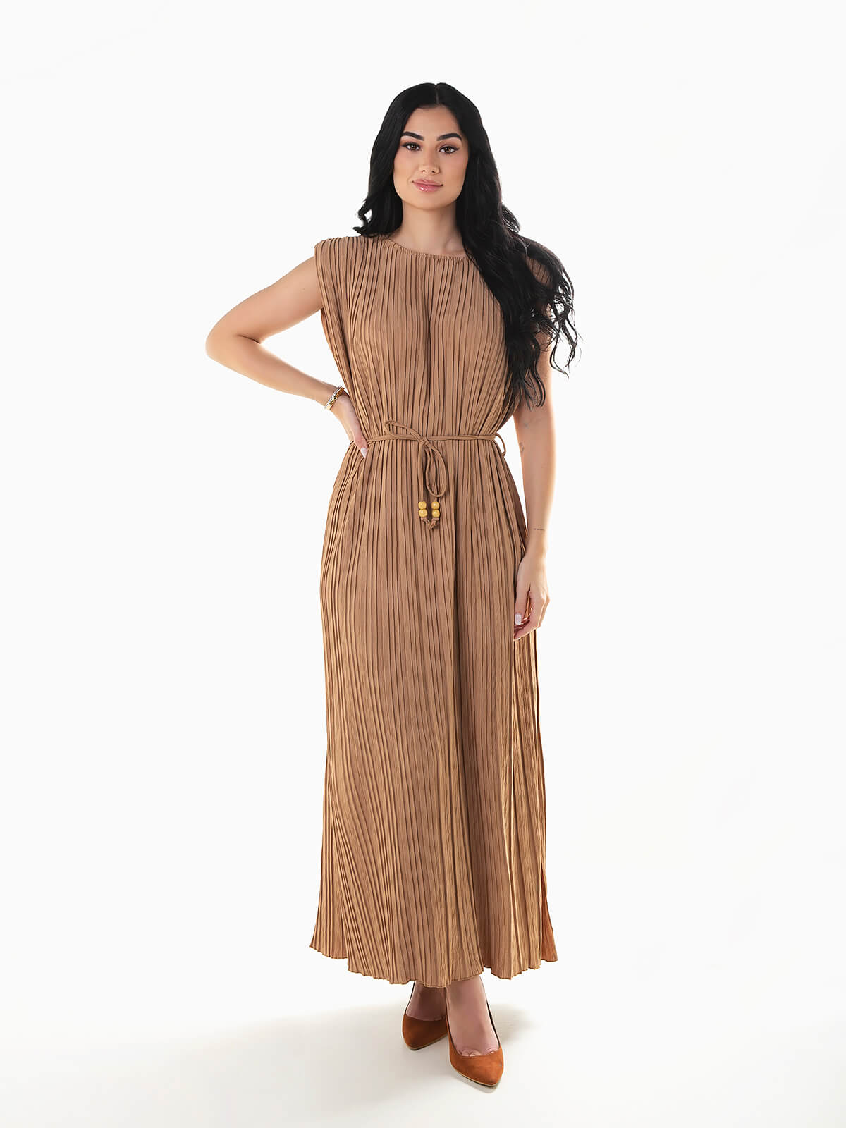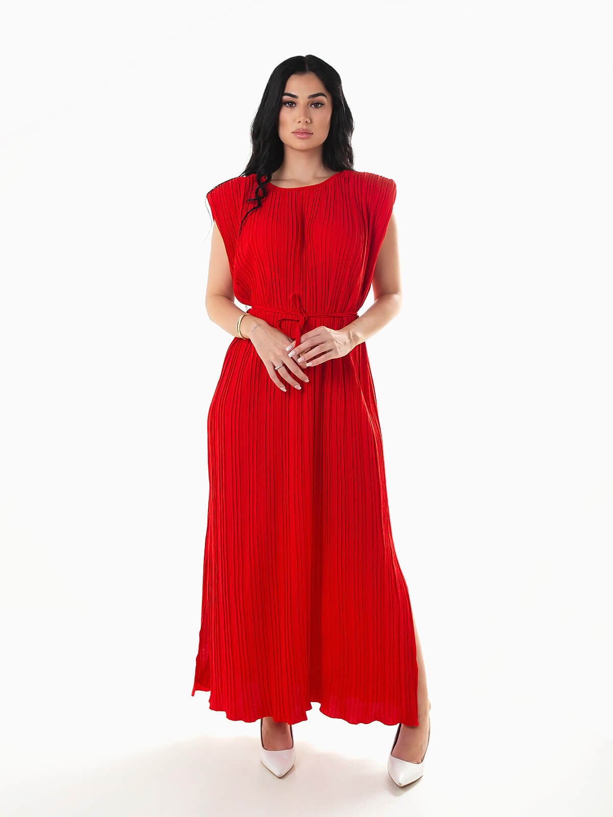 Vestido comprido plissado sem mangas para senhora. Vestido com ombreiras e decote redondo. Cinto para ajustar removível.
