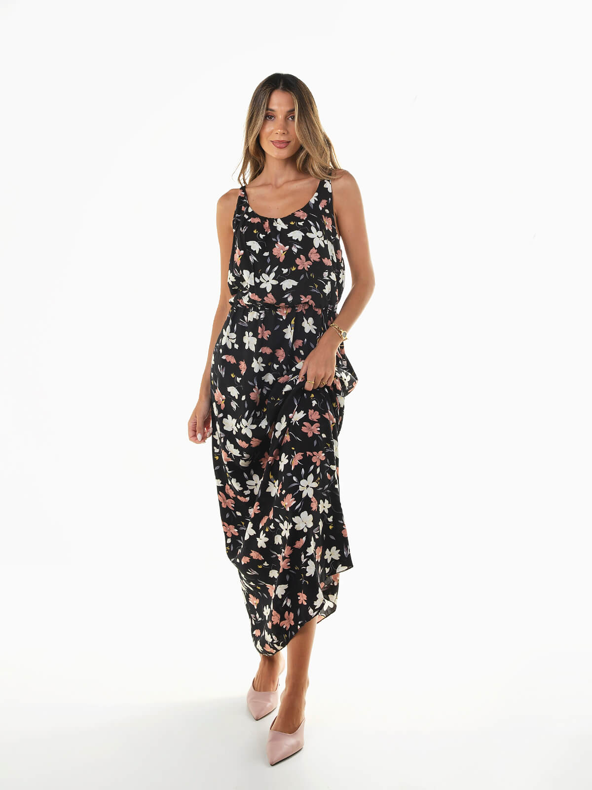 Vestido comprido preto com padrão floral em contraste. Vestido de alças ajustáveis e cintura elástica. Decote redondo. O modelo ideal para os dias de sol: leve, fresco e cheio de cor.