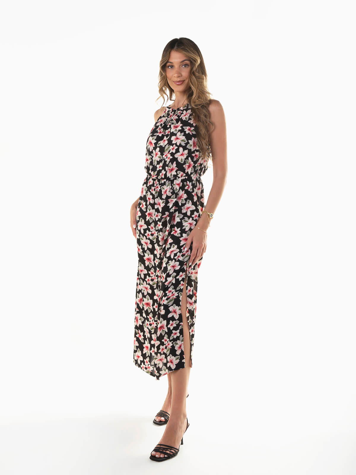 Vestido comprido preto com estampado floral e aberturas laterais. Vestido de alças ajustáveis com decote halter e cintura elástica.