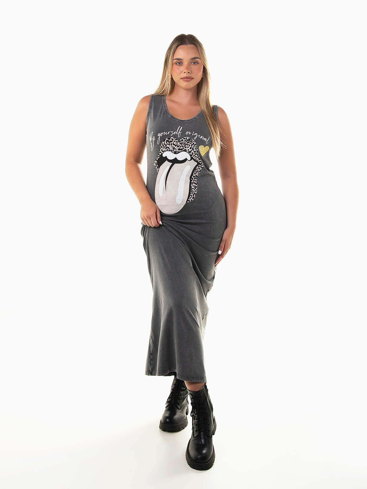 Vestido comprido sem mangas com estampado animal à frente. Vestido malha para senhora com decote redondo.