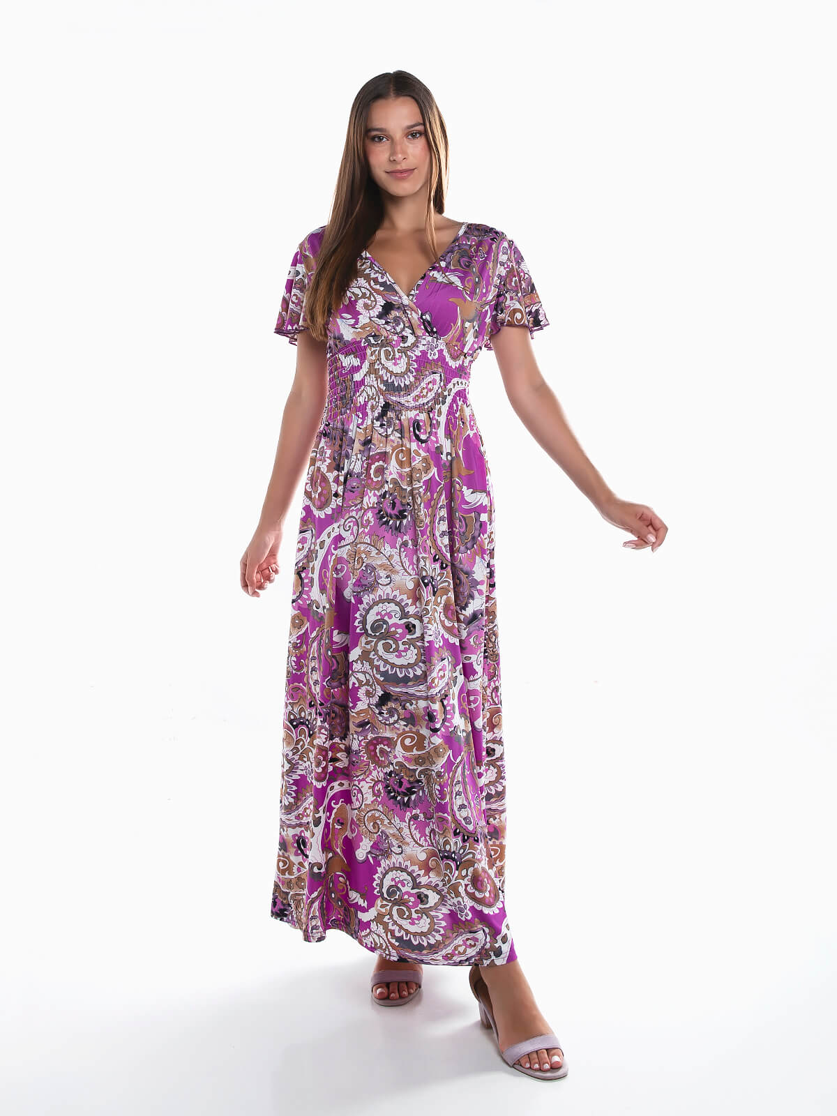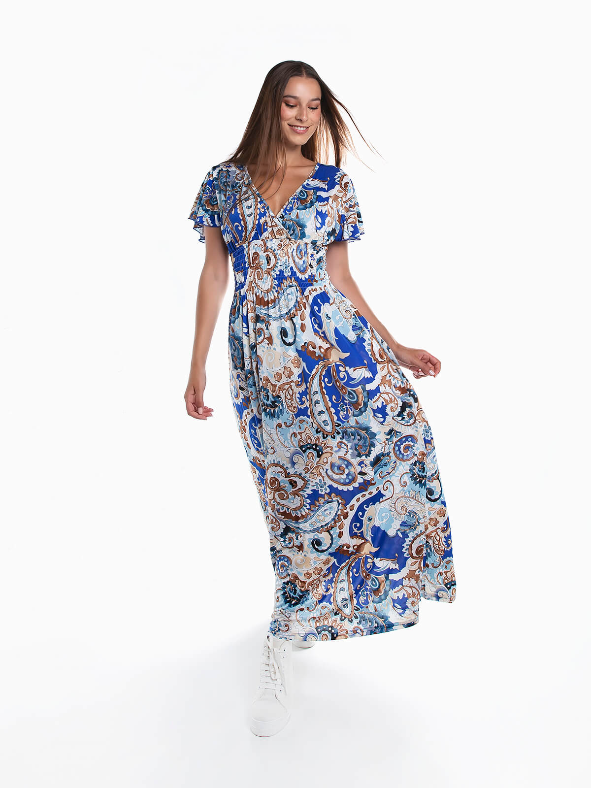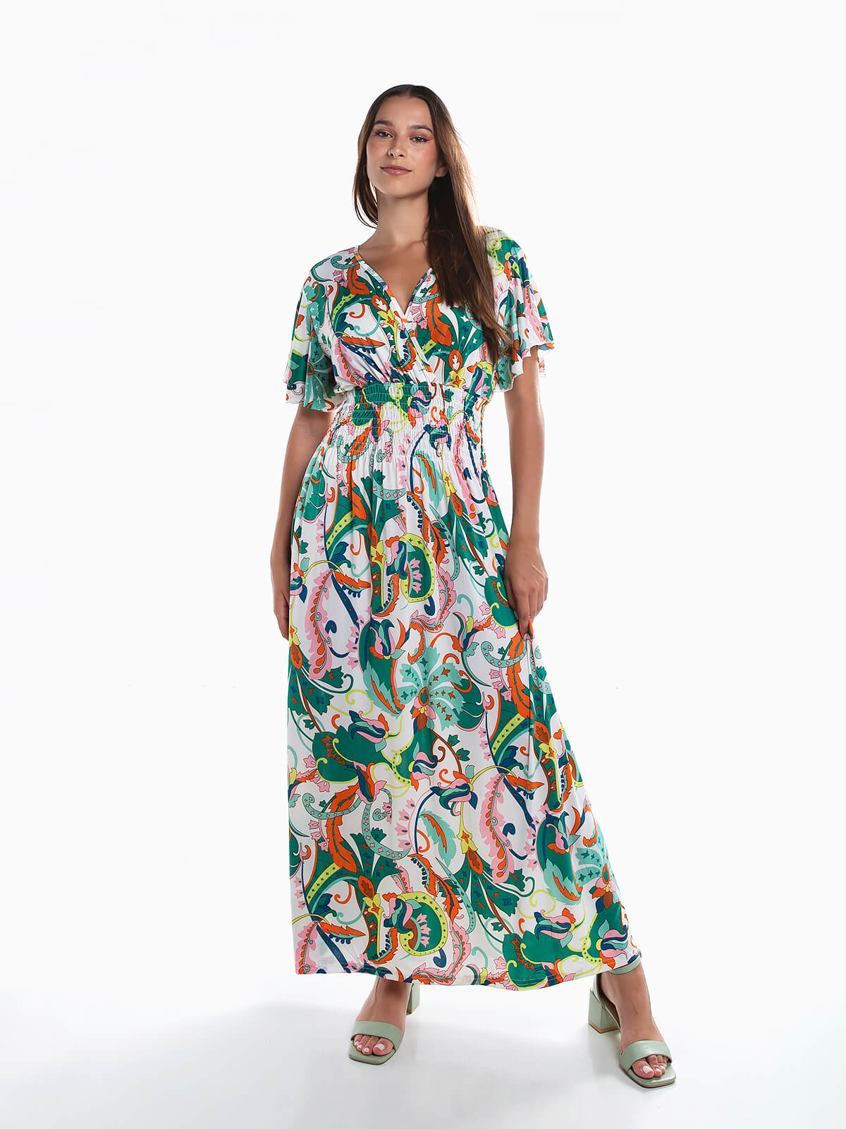 Vestido comprido em tecido leve e fresco com franzido smock na cintura. Estampado abstrato. Vestido fluído sem mangas com encaixe folho na cava e decote cruzado.