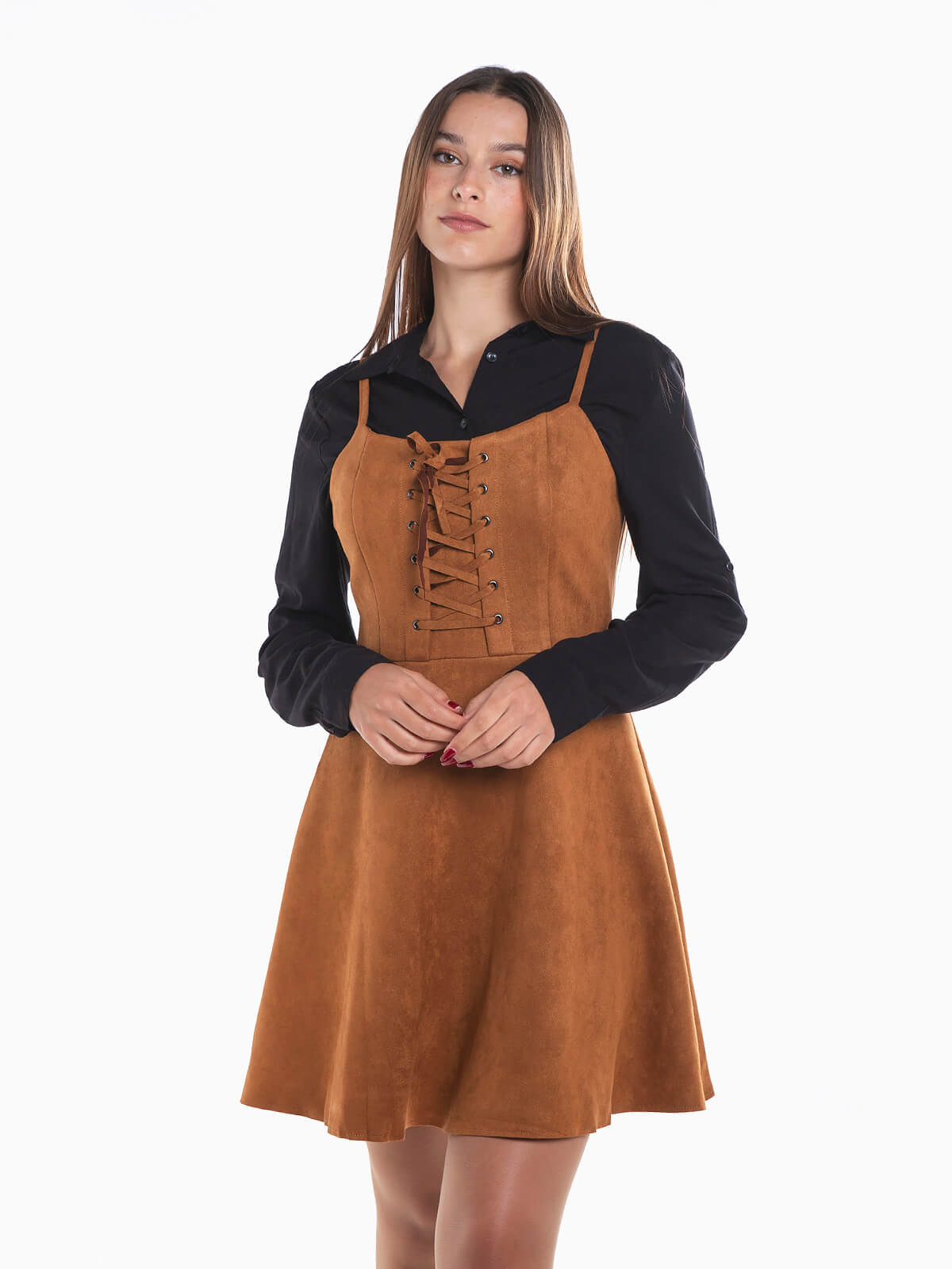 Vestido curto de alças com efeito camurça para senhora. Vestido evasé com decote redondo e cordões para ajustar no peito. Aperto posterior fecho éclair oculto.