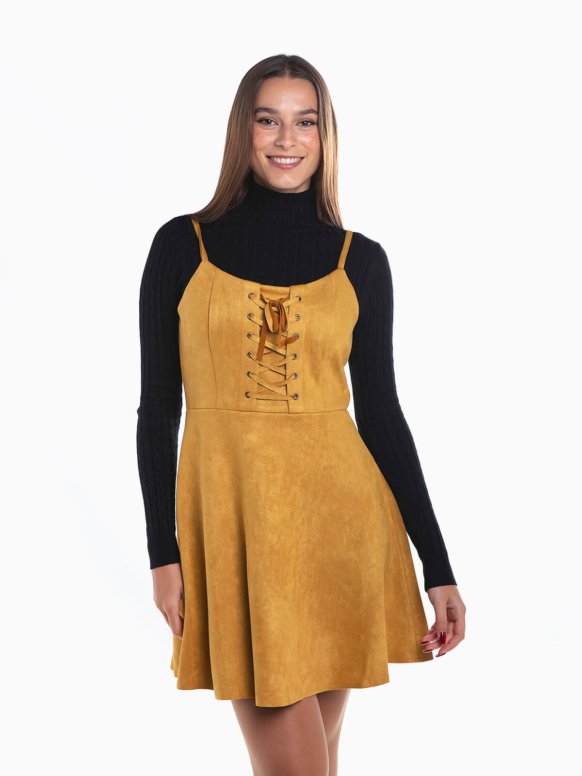 Vestido curto alças efeito camurça