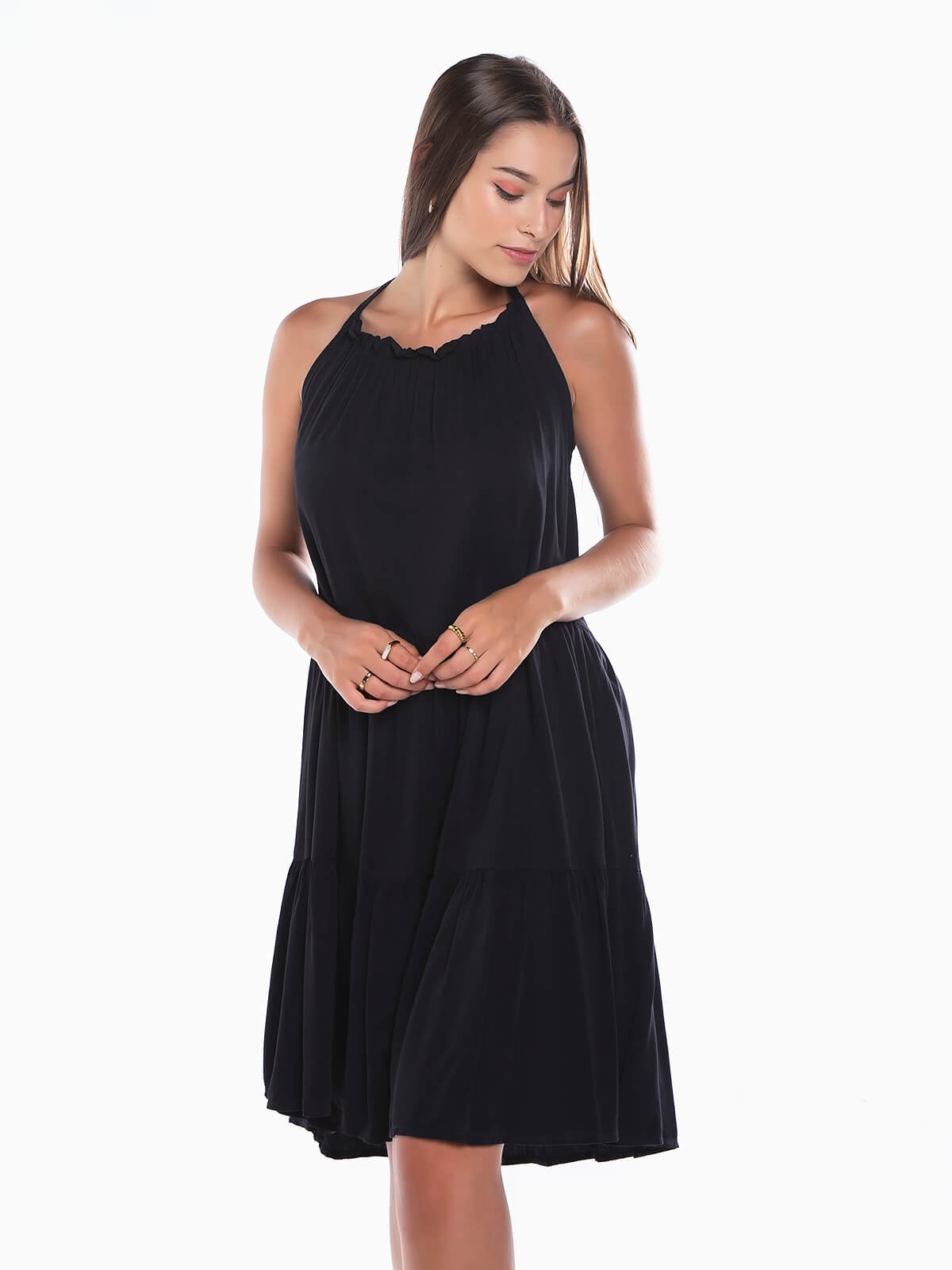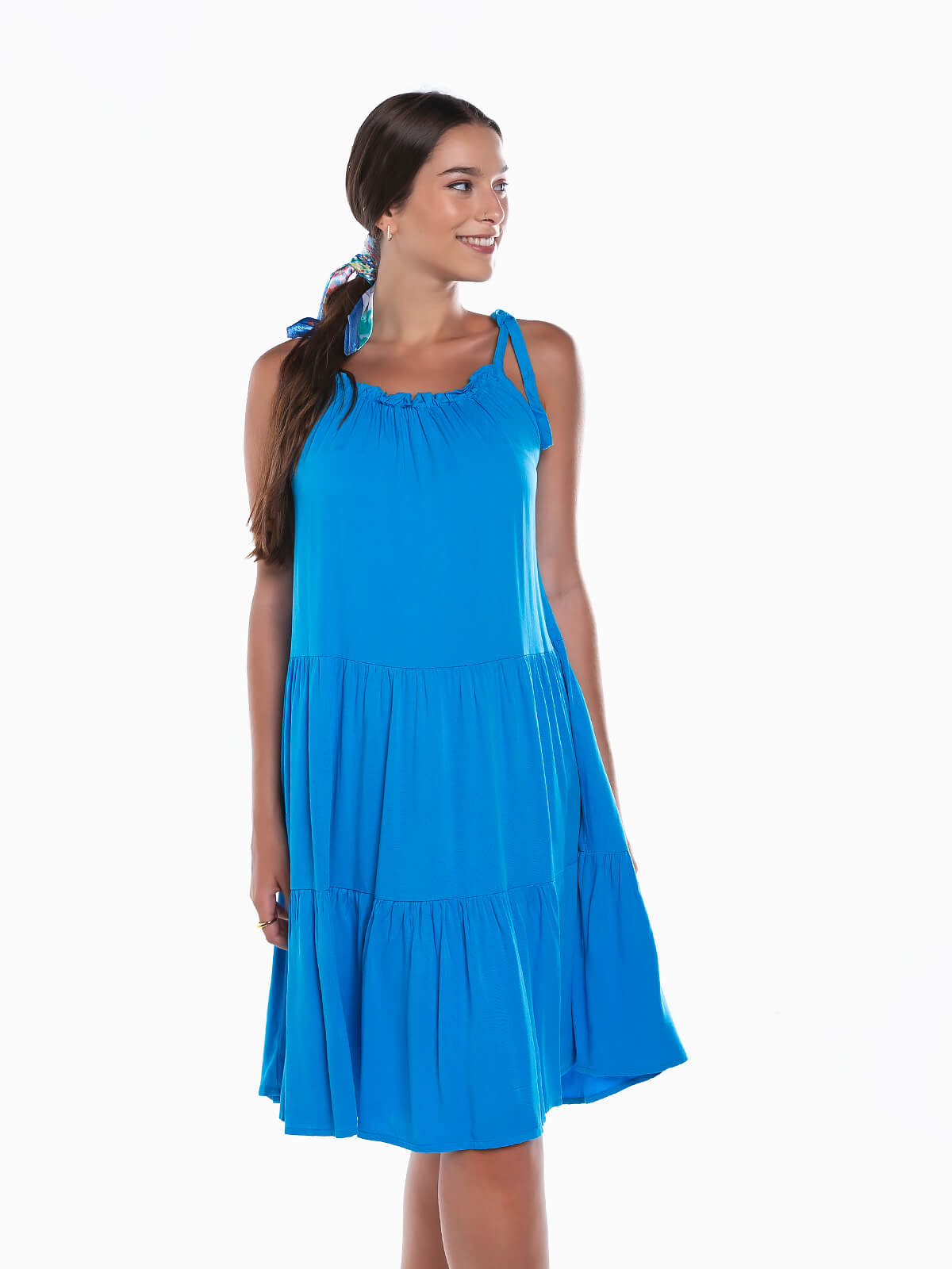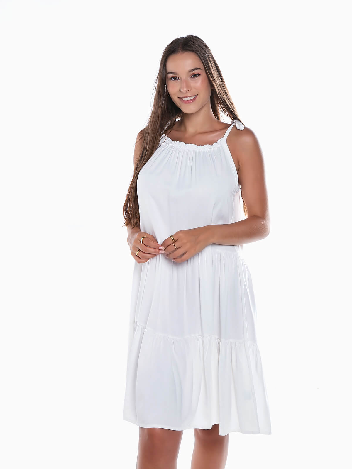 Vestido curto em tecido 100% algodão com encaixe de folhos para senhora. Vestido fluído de alças para laço com decote redondo.
