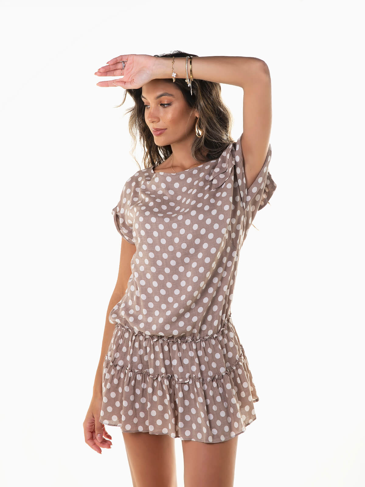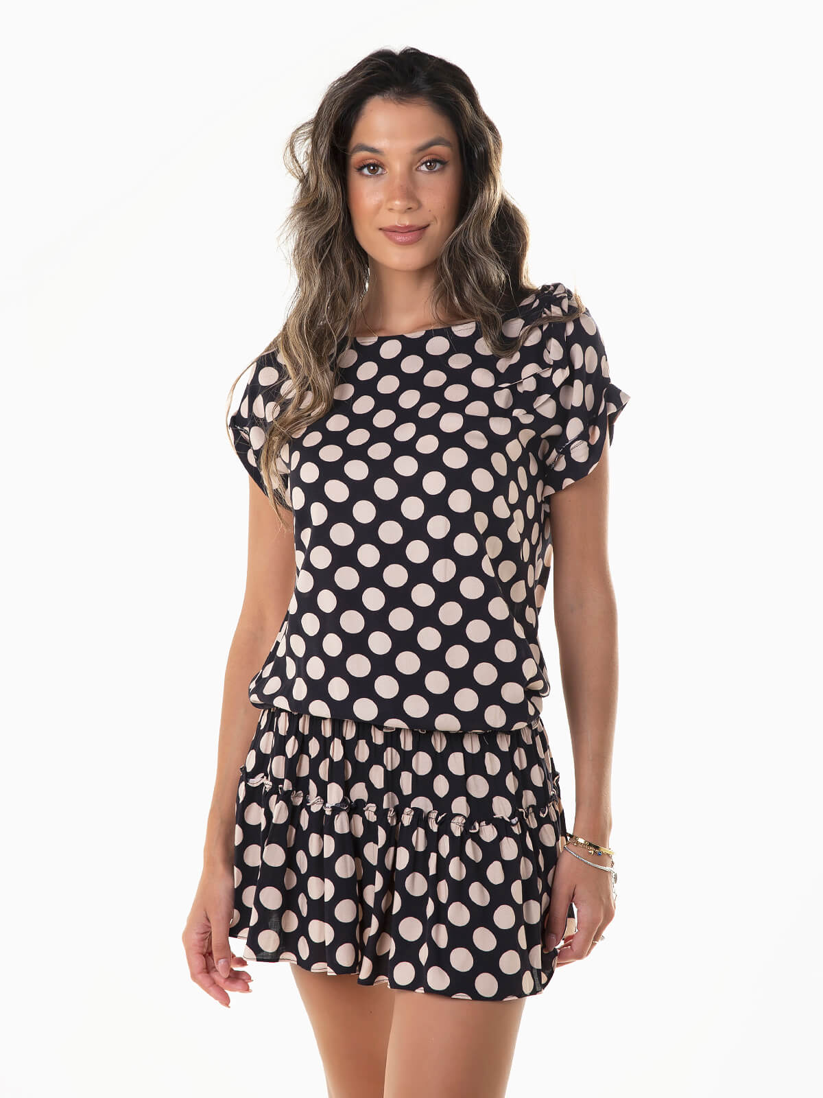 Vestido curto às bolinhas para senhora. Vestido de manga curta com decote barco e pormenor de fivela no ombro. Vestido com encaixe de folho na base e elástico.