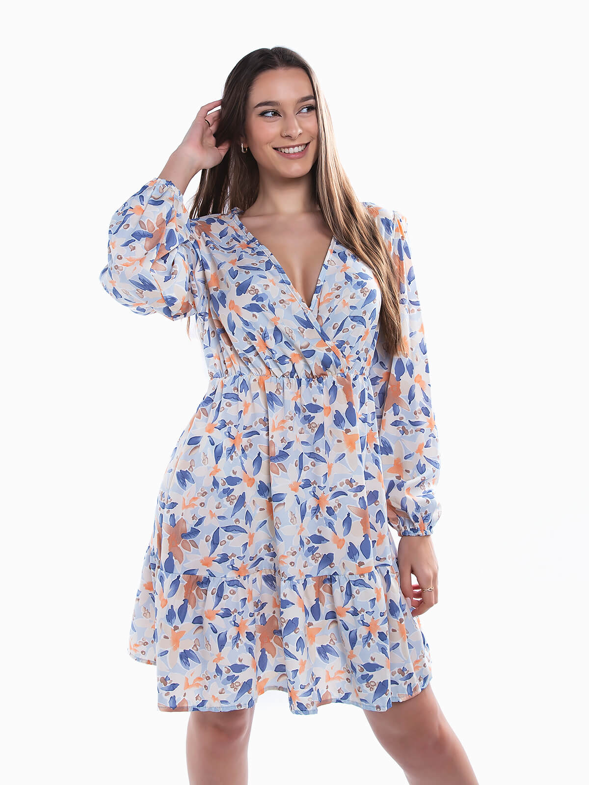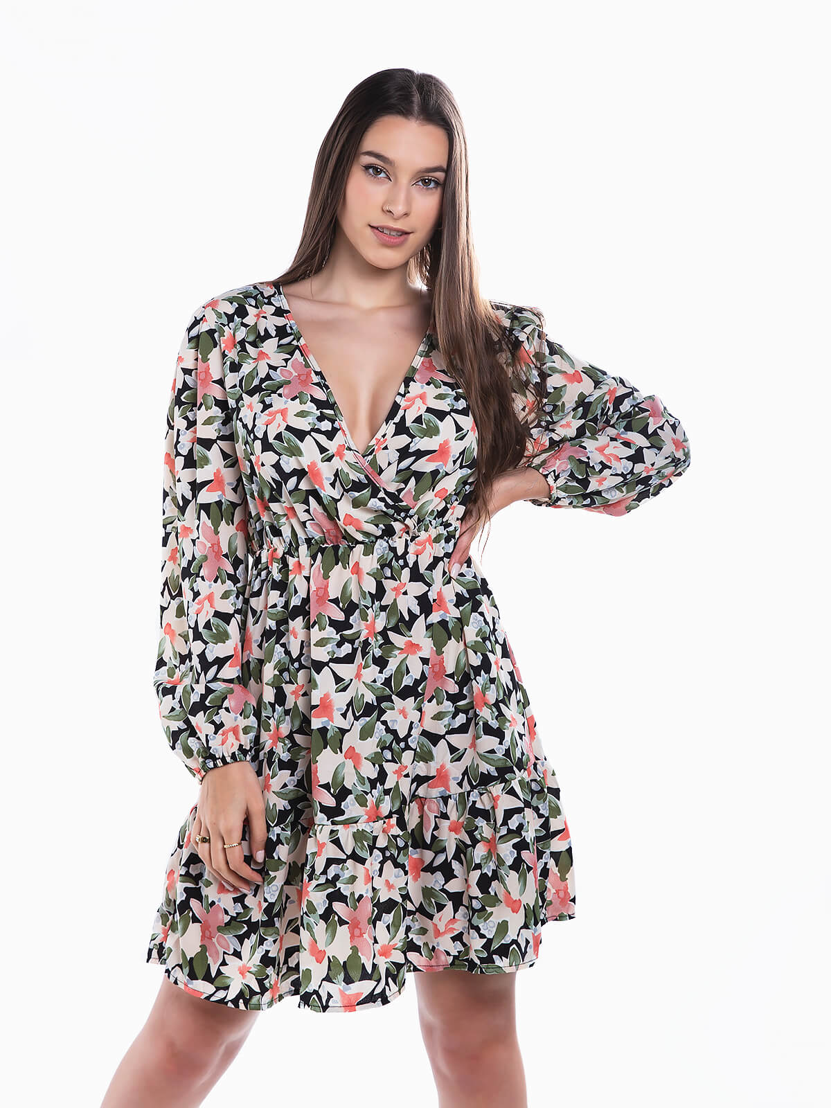 Vestido curto às flores para senhora. Vestido fluído com folhos. Decote de trespasse. Punhos elásticos. Manga comprida.