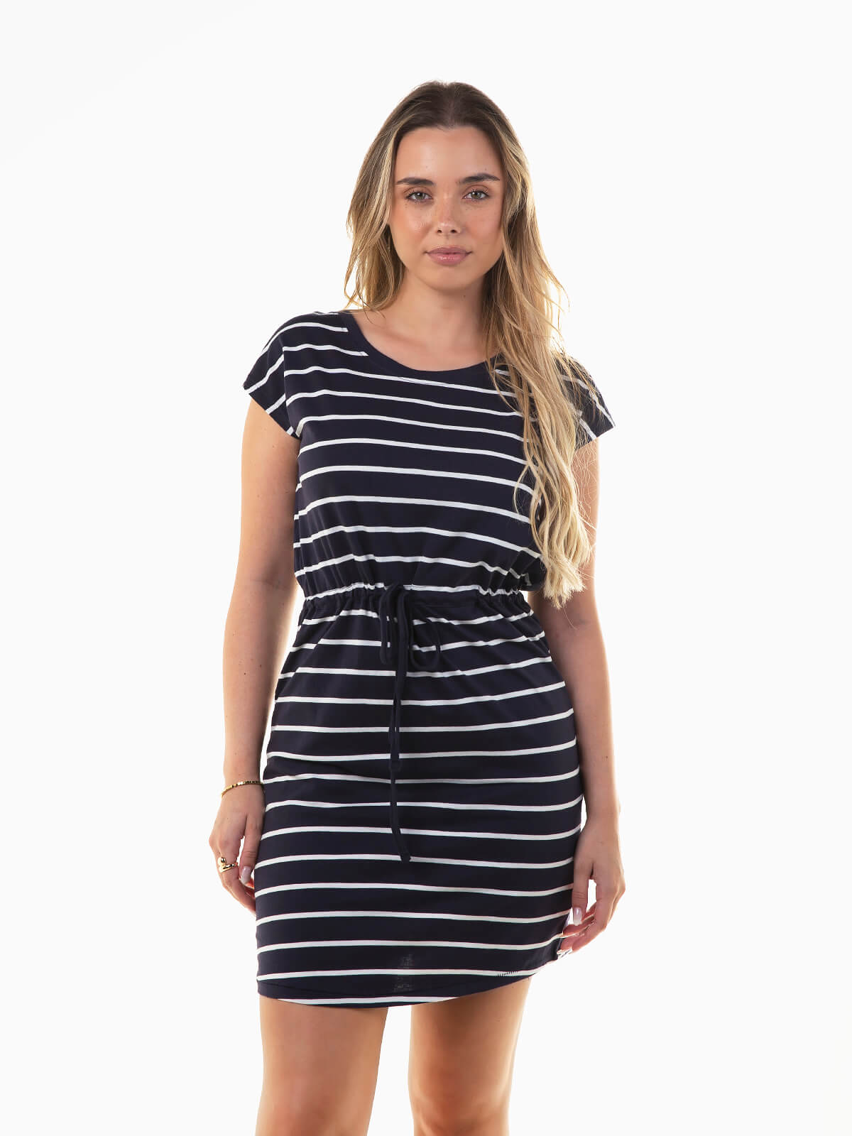 Vestido curto às riscas com cordão na cintura para ajustar. Vestido para mulher com mini manga curta e decote redondo. Prático e confortável, é perfeito para um passeio à beira mar.