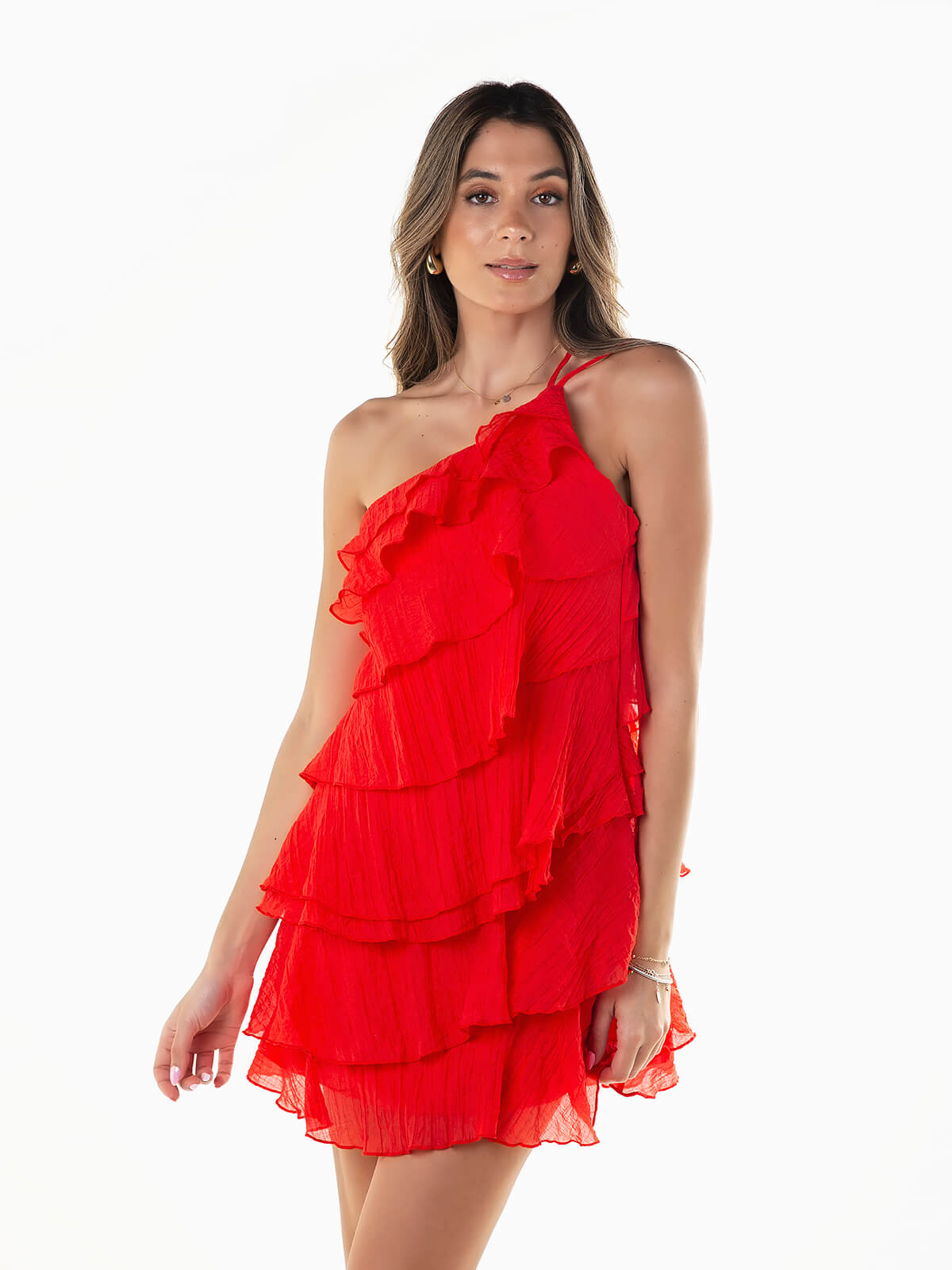 Vestido curto com decote assimétrico e encaixe de folhos. Vestido em tecido com textura. Interior forrado. Dupla alça ajustável e costas descobertas. Aperto fecho éclair oculto na costura.