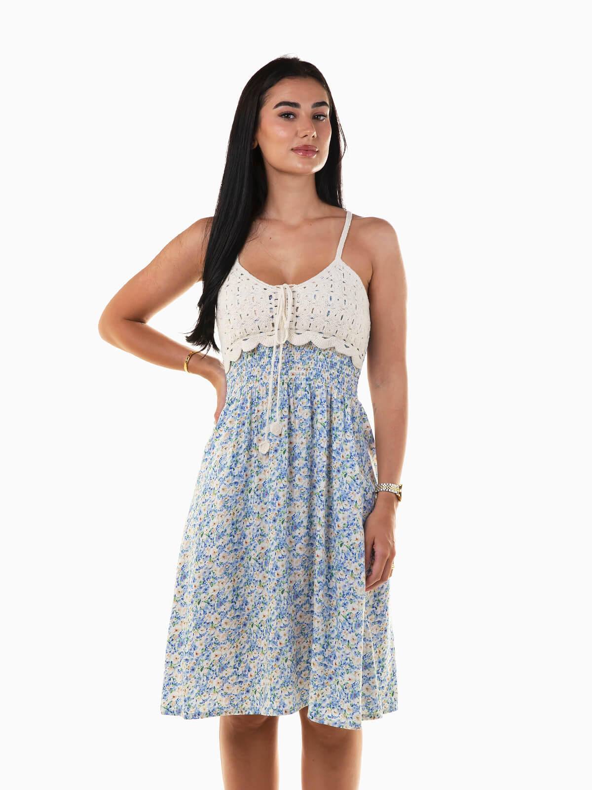 Vestido curto fluído azul com padrão floral em contraste. Vestido de alças com parte superior em crochet e franzido smock. Decote em bico e cordão para laço.