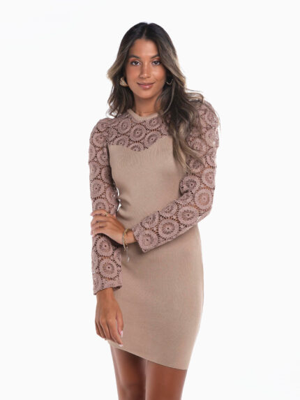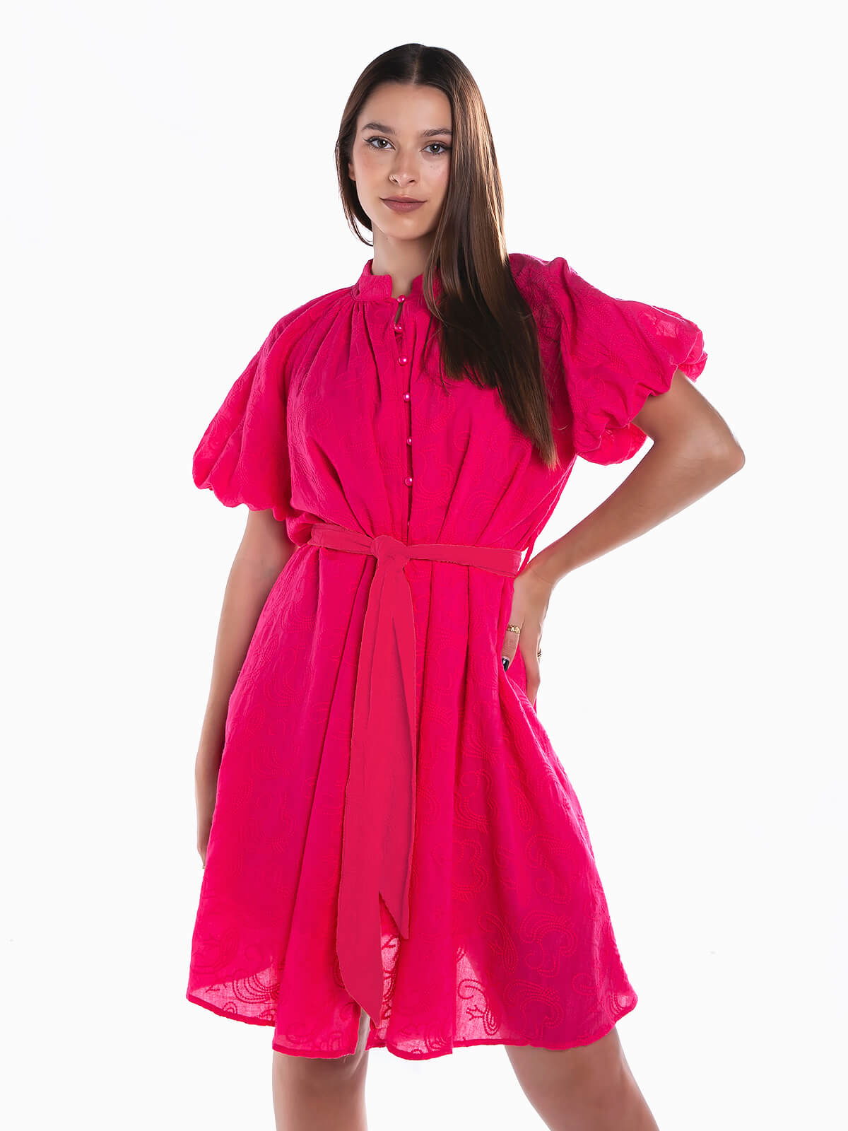 Vestido curto com pormenor de bordados à cor para senhora. Vestido de manga curta abalonada acabada em elástico e interior forrado. Gola mao. Cinto para ajustar. Aperto frontal de botões.