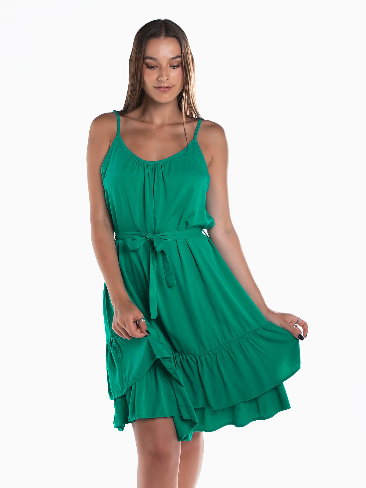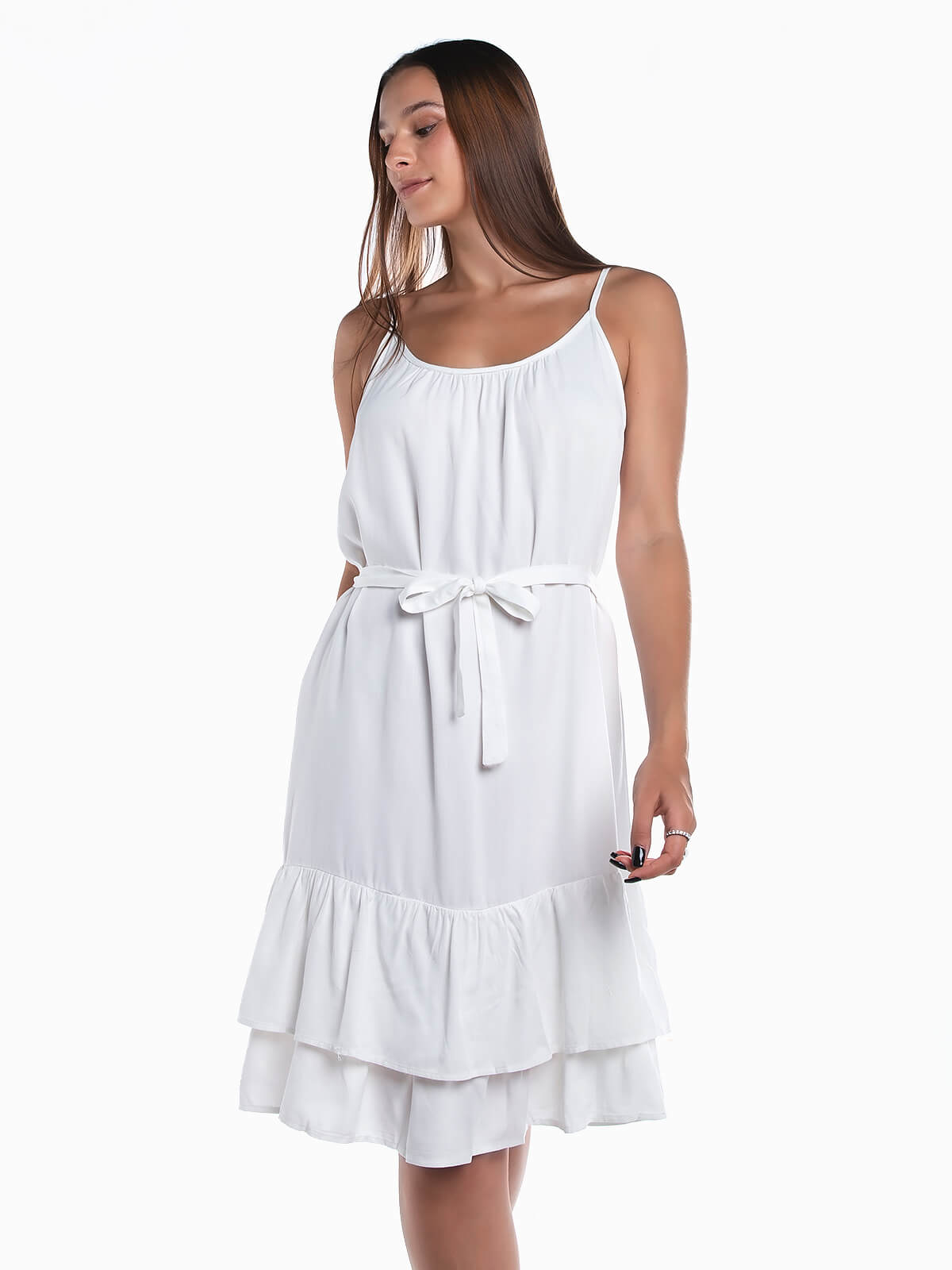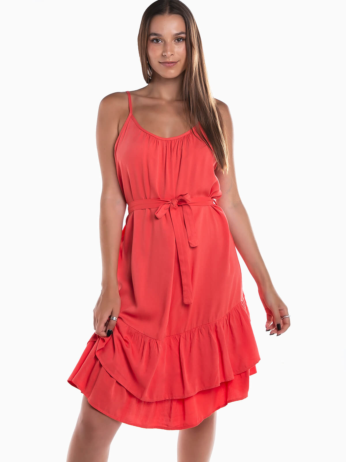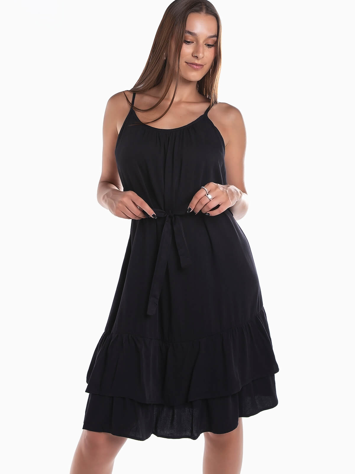 Vestido curto com cinto no mesmo tecido para ajustar e encaixe de folhos na base. Vestido de alças reguláveis e decote redondo.