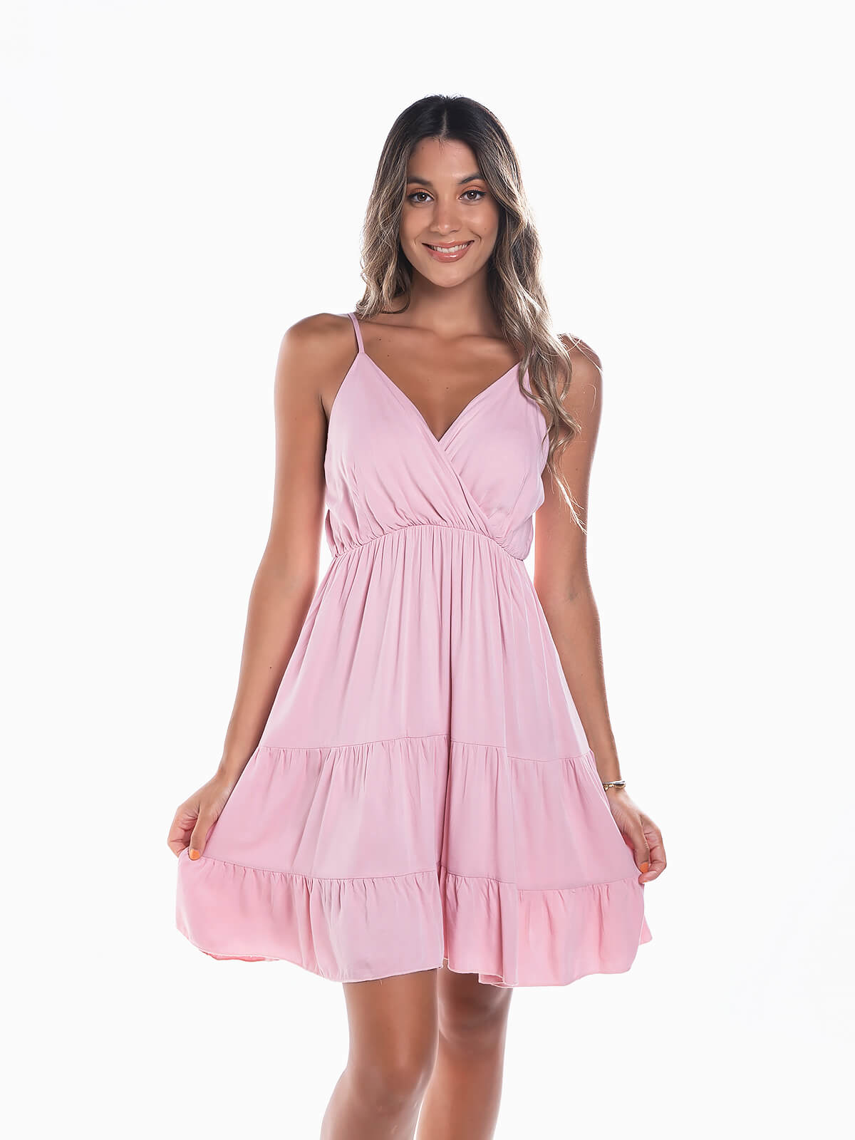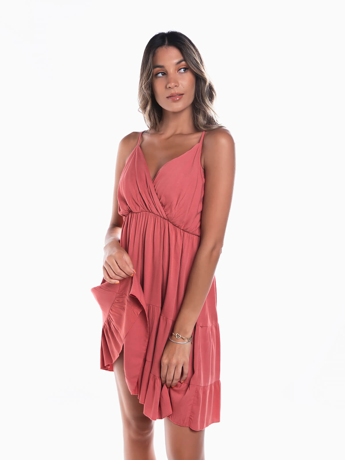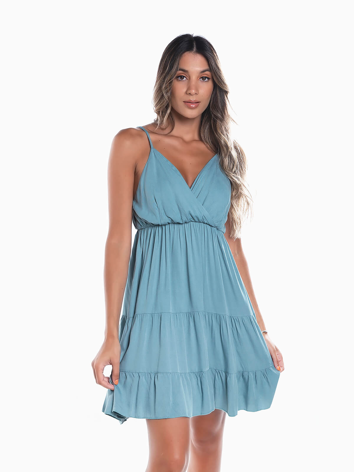 Vestido curto com encaixe de folhos para senhora. Vestido em tecido 100% algodão com decote cruzado. Alças finas reguláveis.
