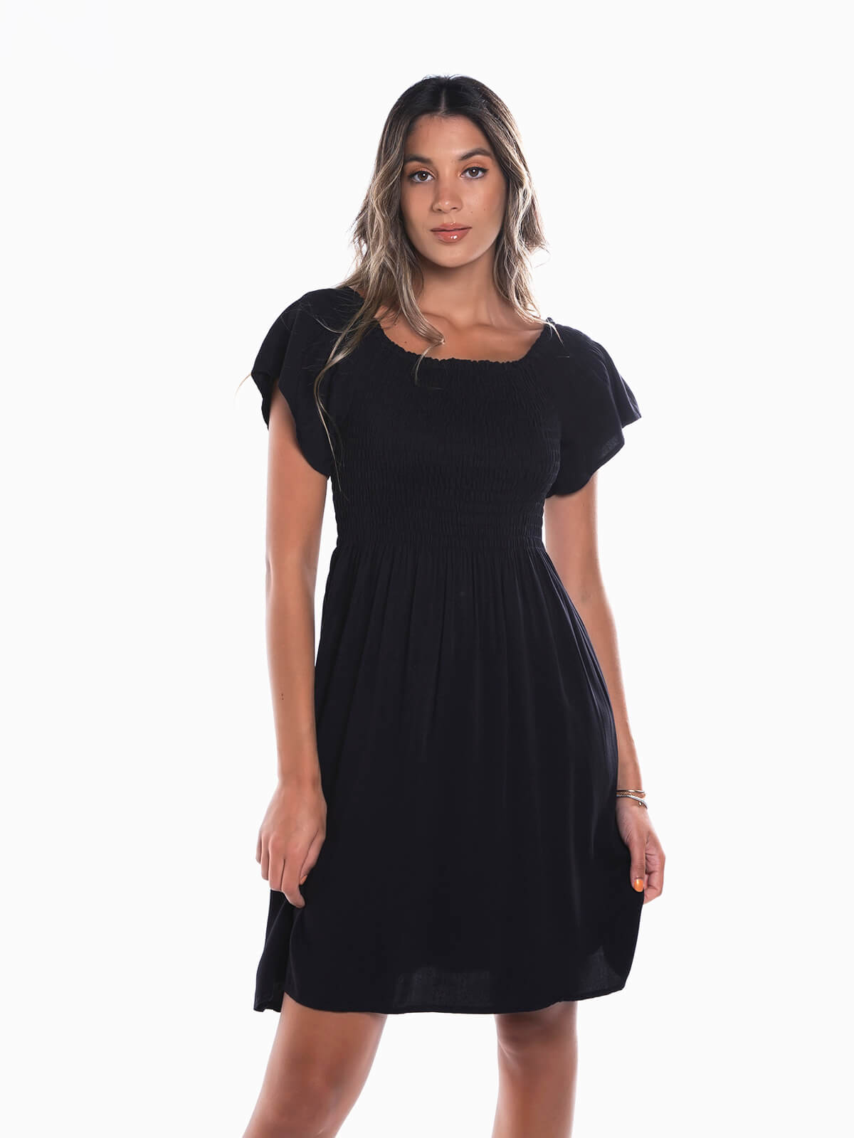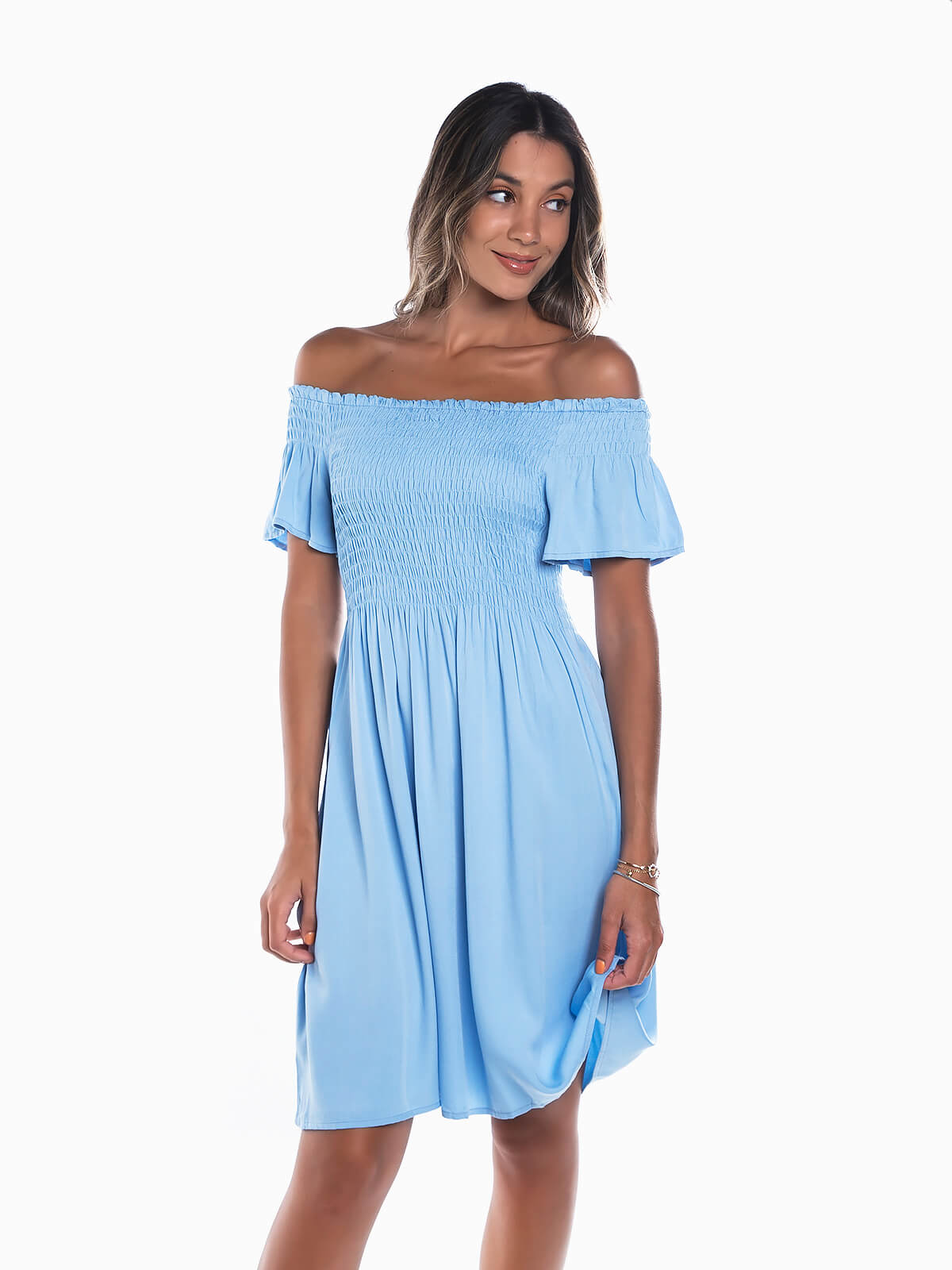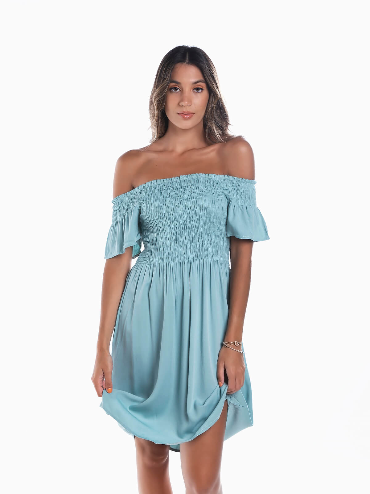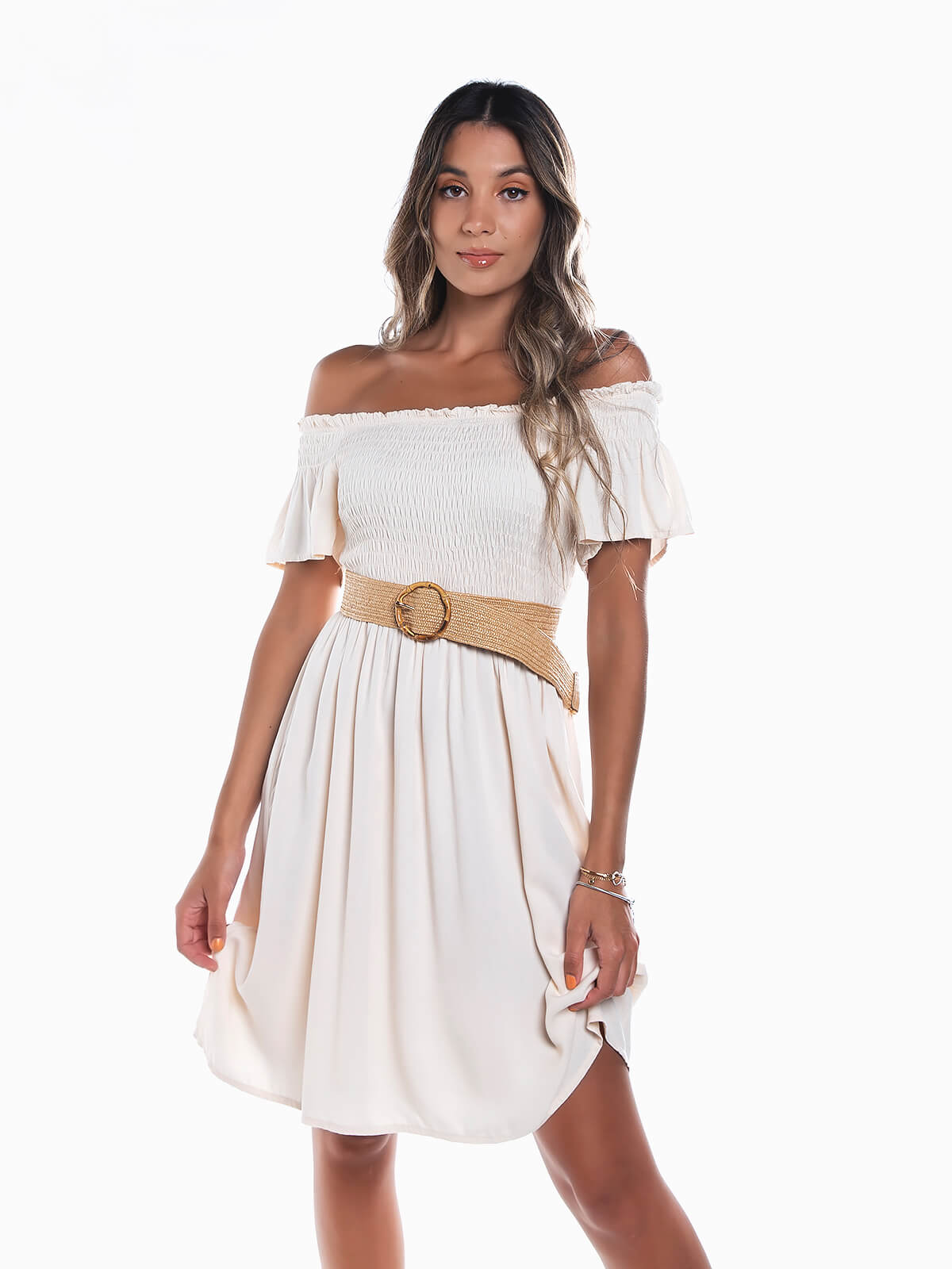 Vestido curto com peito em franzido smock. Vestido de ombros descobertos em tecido leve e fresco com manga curta.