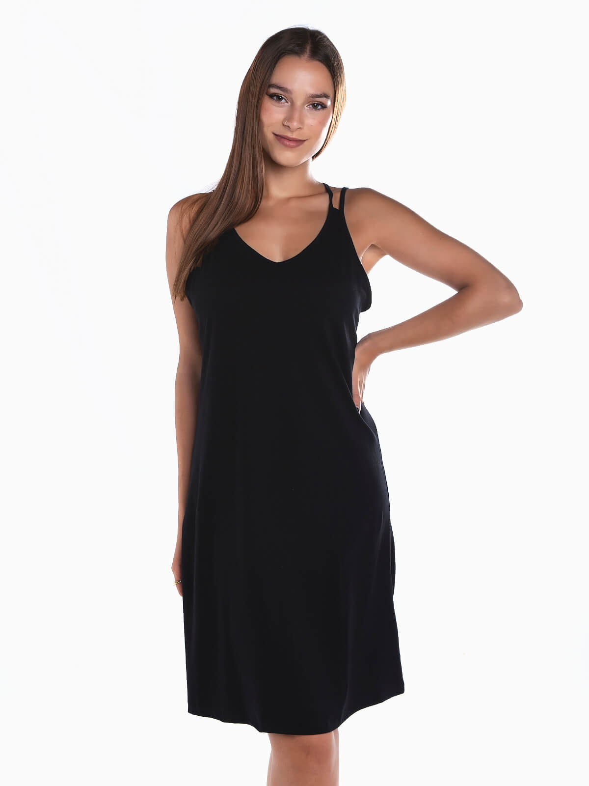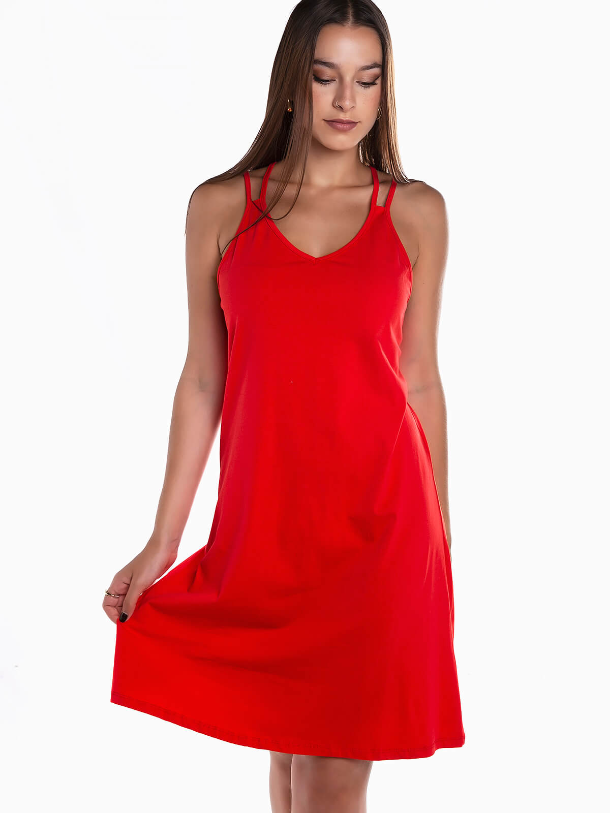 Vestido curto com alças cruzadas na parte posterior. Vestido básico em tecido algodão com decote em bico.