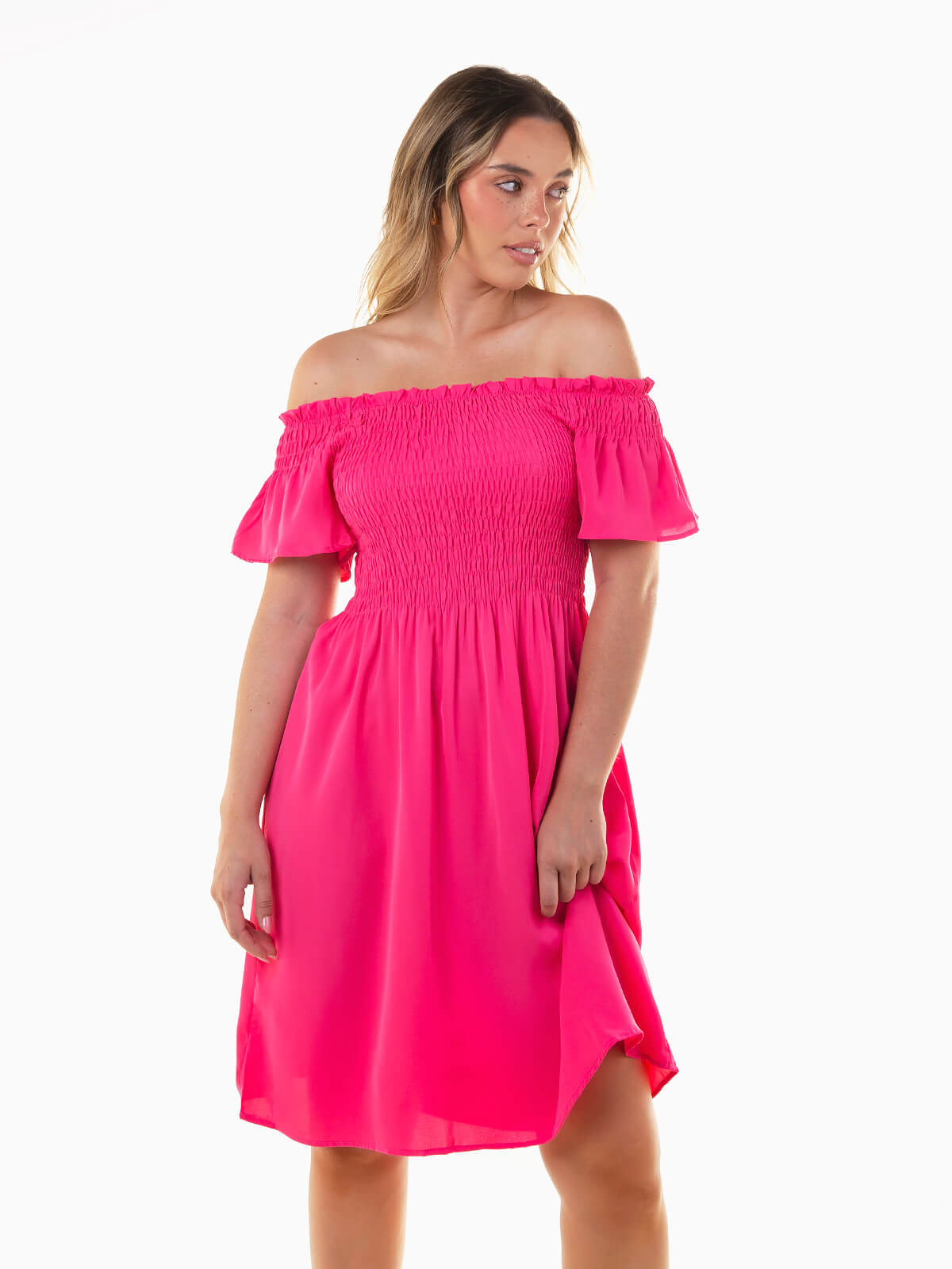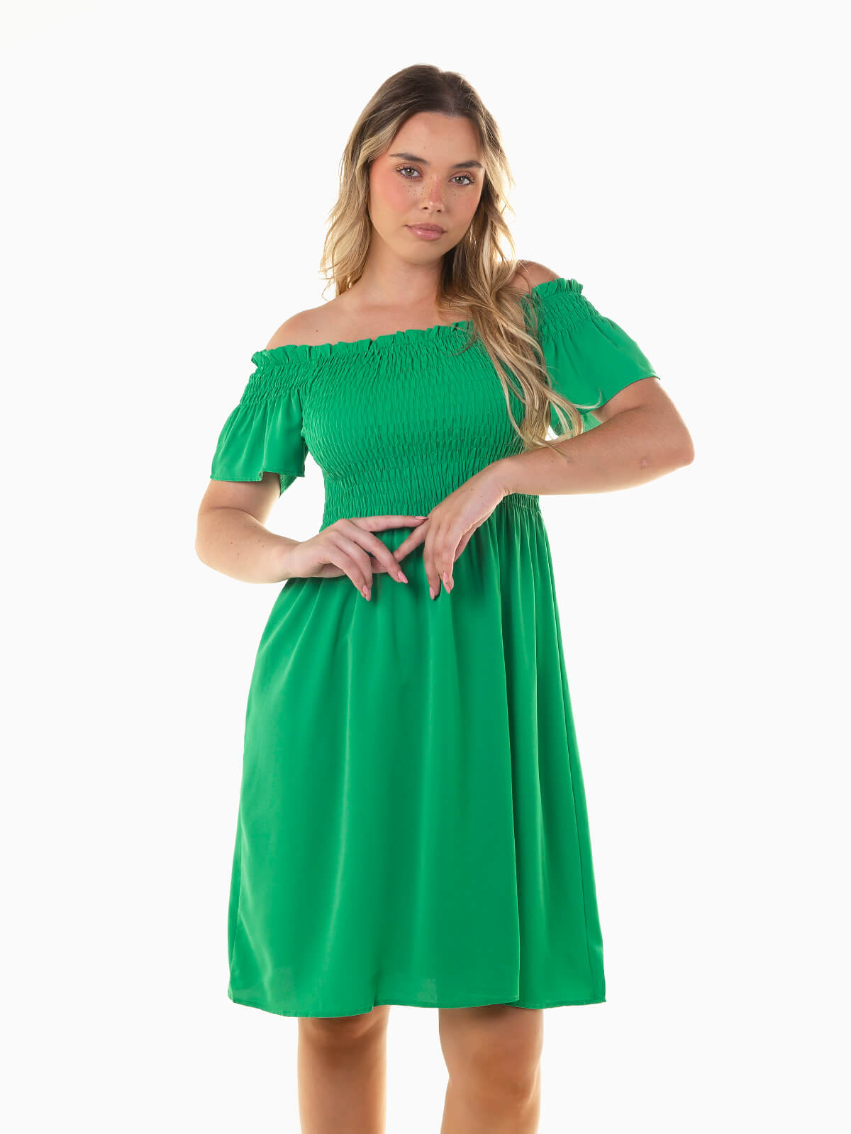 Vestido curto com decote barco e manga curta, em tecido fluído que proporciona conforto e leveza. O peito apresenta franzido smock que acrescenta detalhe e feminilidade à peça, ideal para um look casual e cheio de charme.