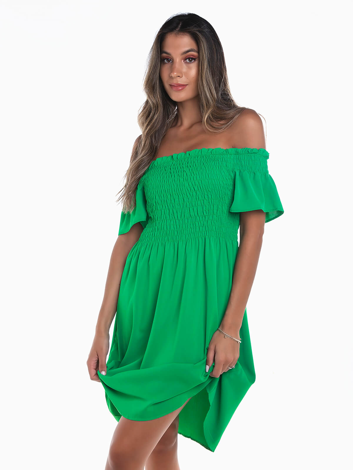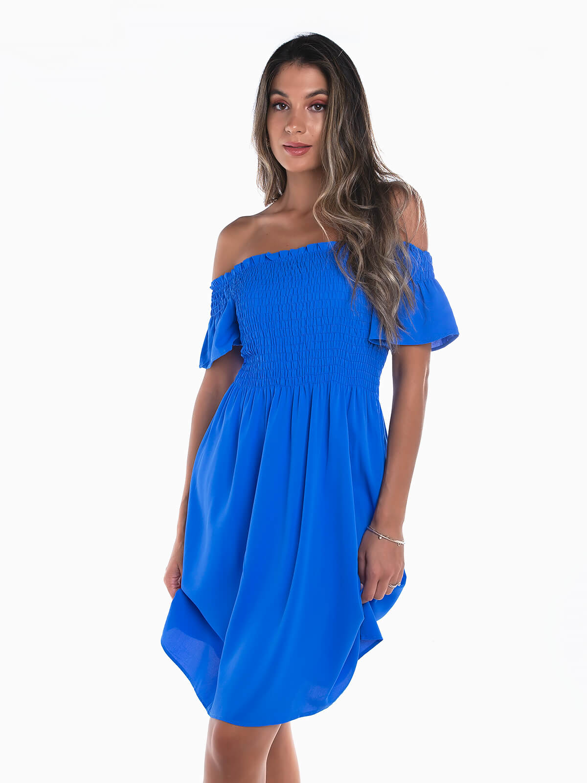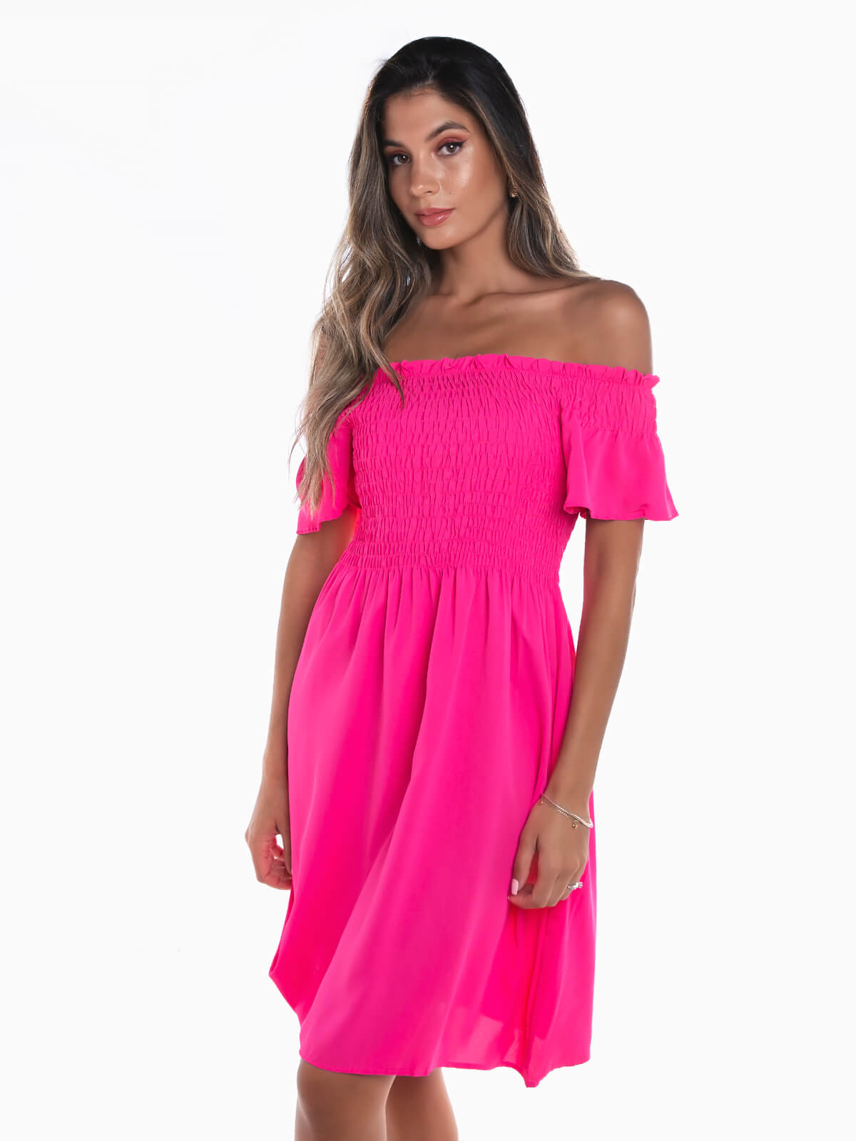 Vestido curto com decote barco e manga curta. Vestido fluído com peito em franzido smock.