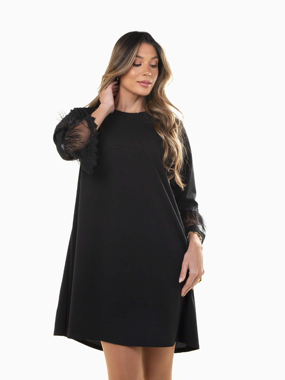 Vestido curto em malha com mangas 3/4 e aplicação de plumas e renda no punho. Silhueta fluida, confortável e perfeita para jantares, festas ou eventos onde queres um look simples mas marcante.