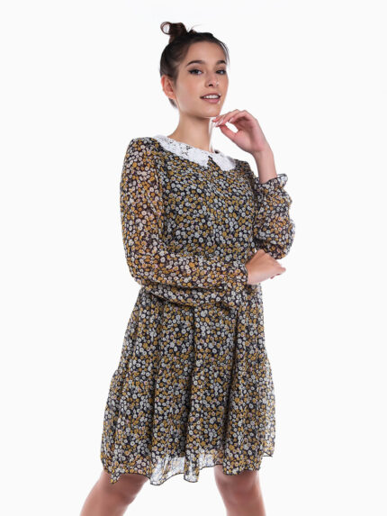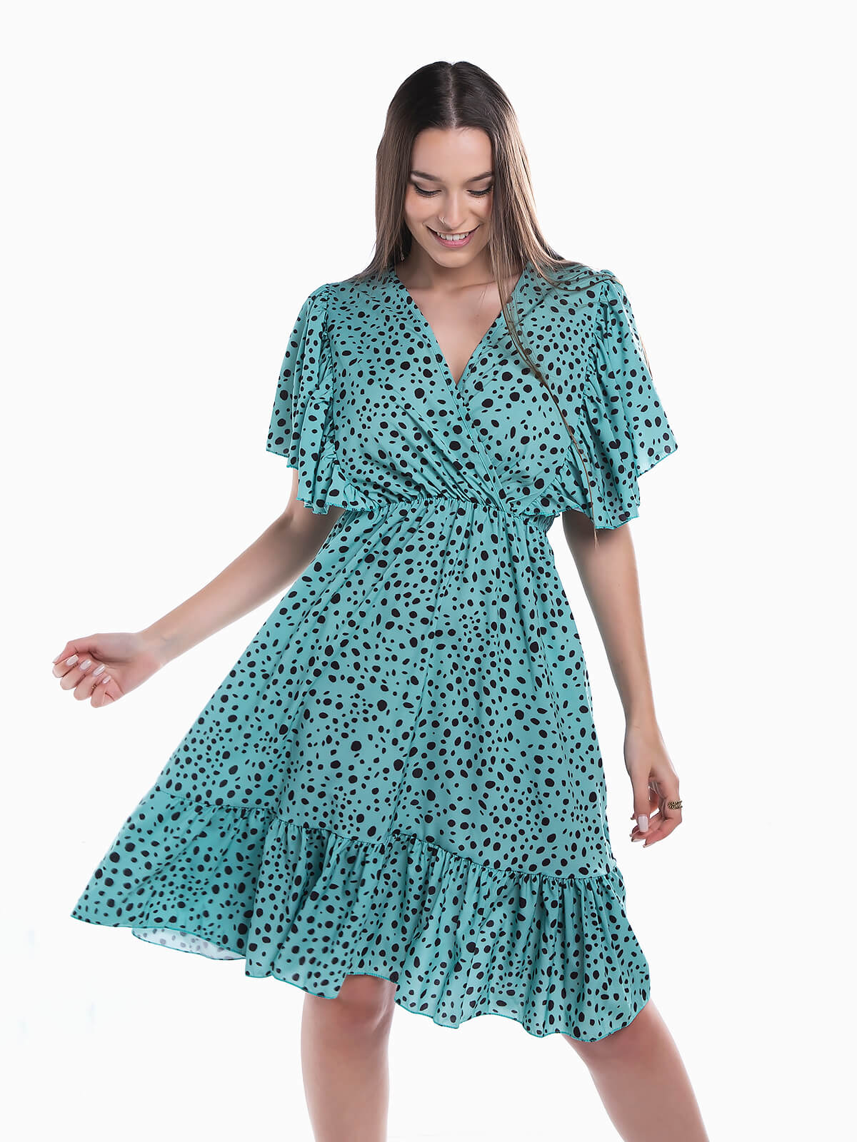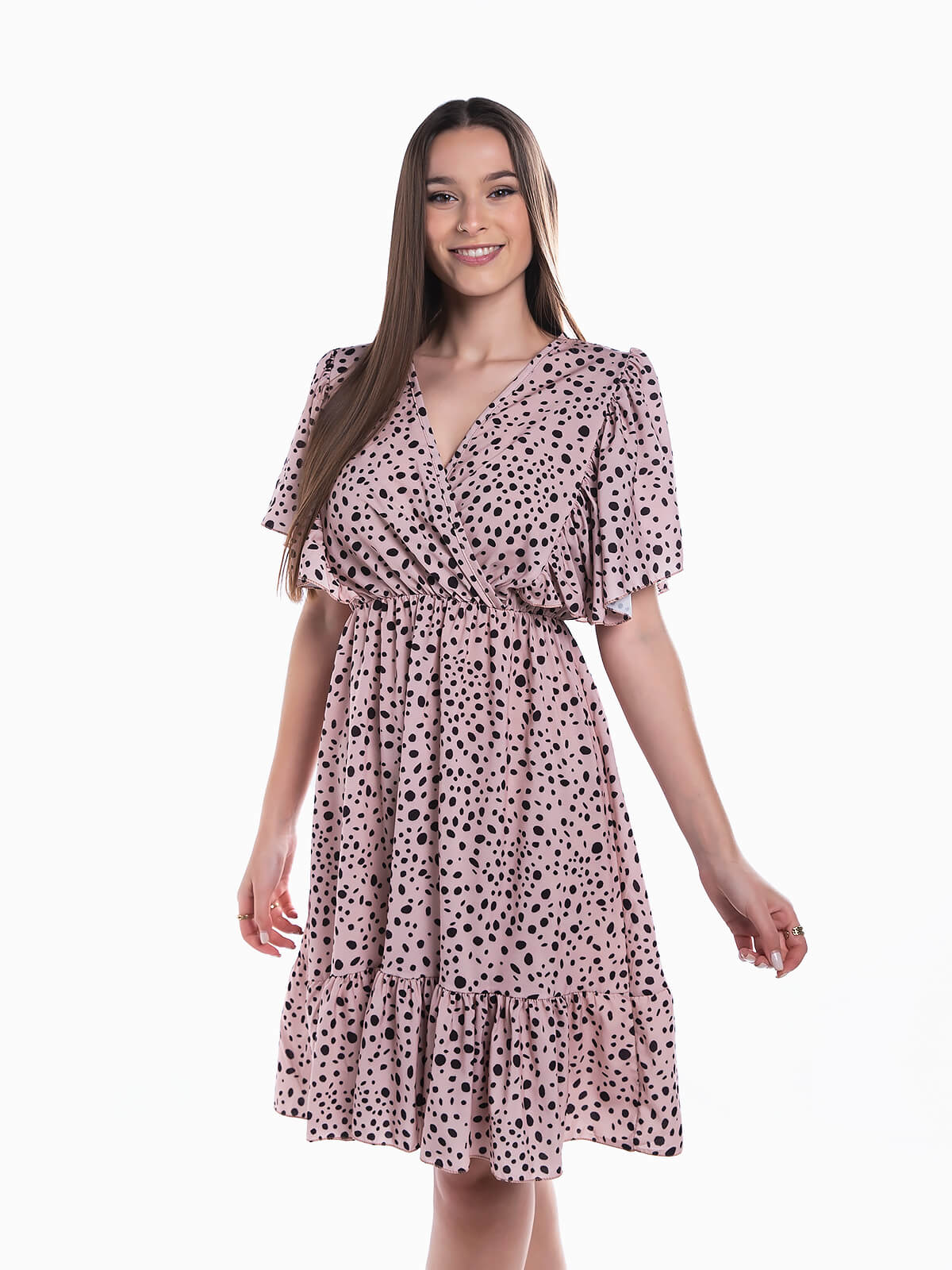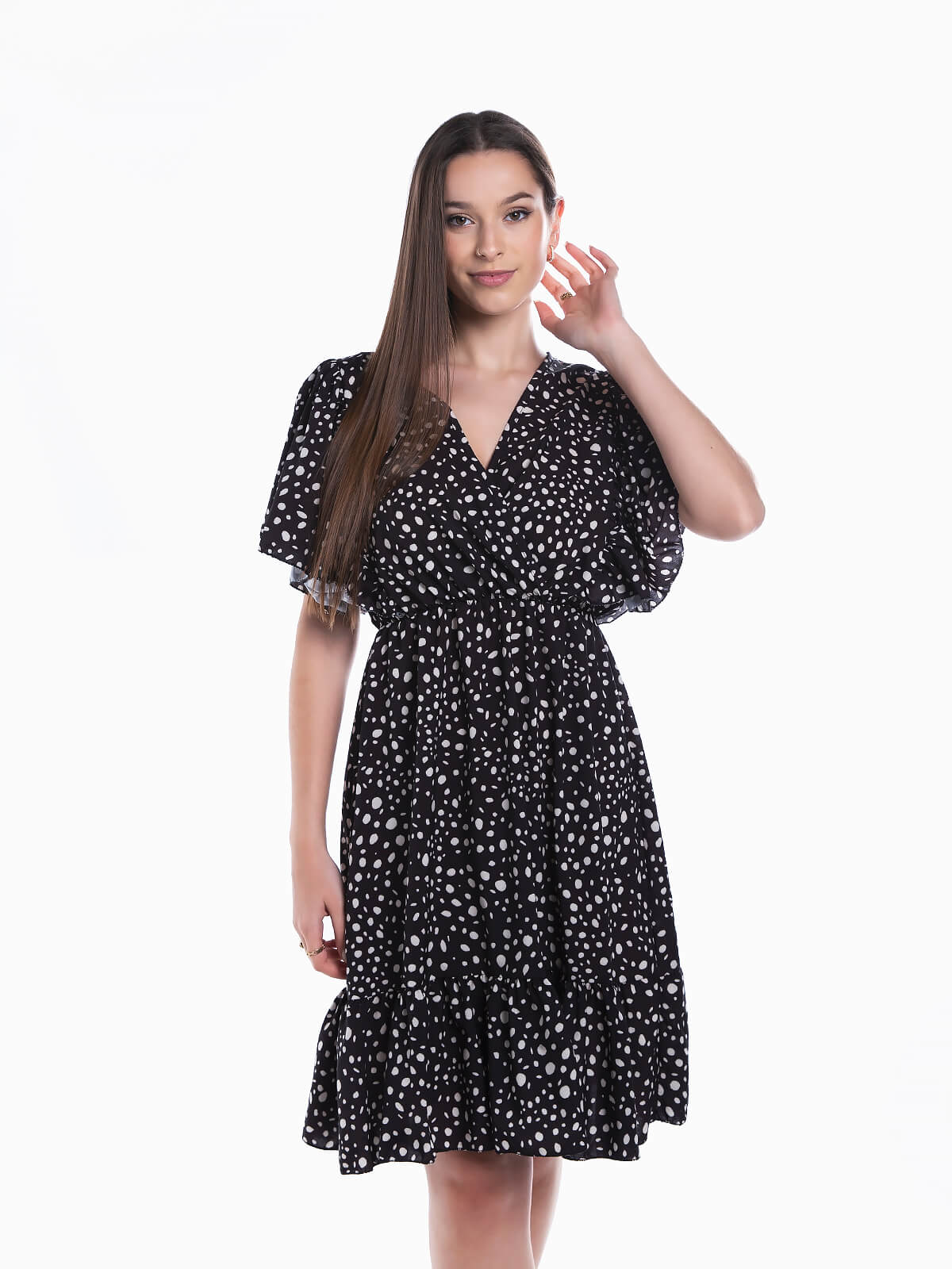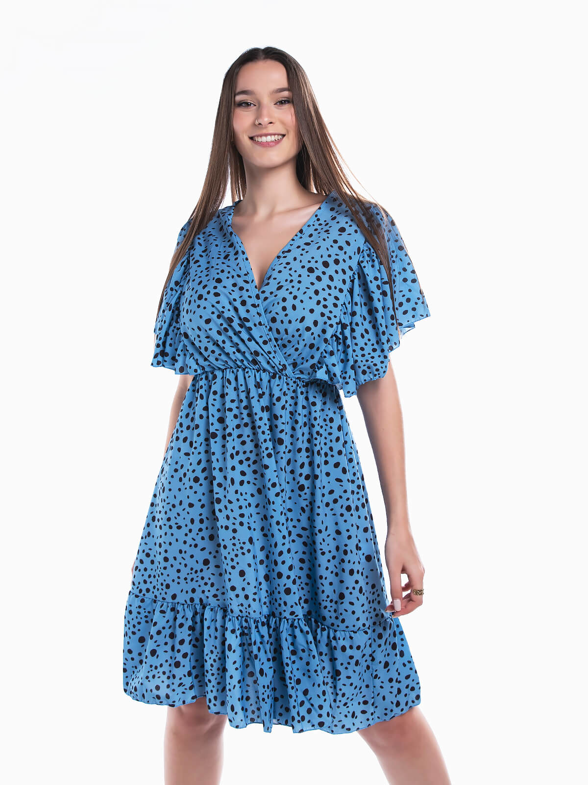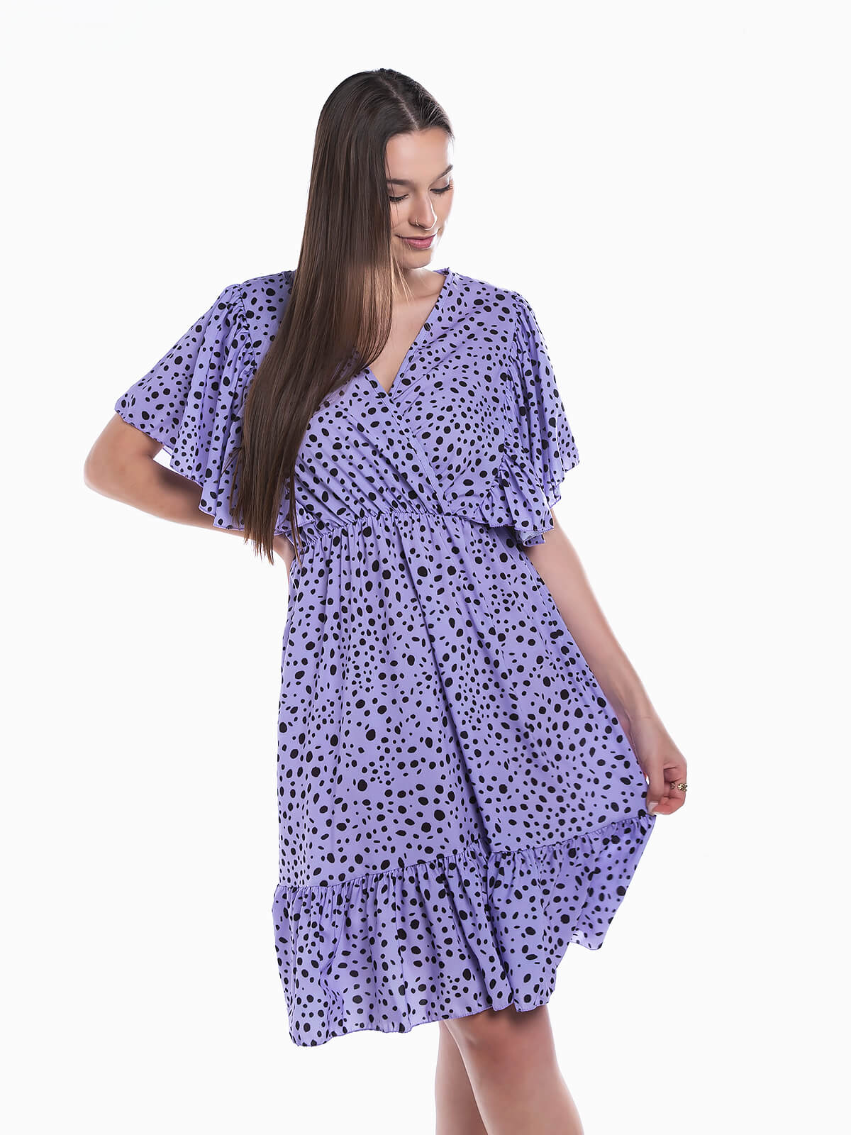 Vestido curto com estampado de bolas para senhora. Vestido em tecido fluido com mangas de folhos. Decote de trespasse. Cintura com elástico.