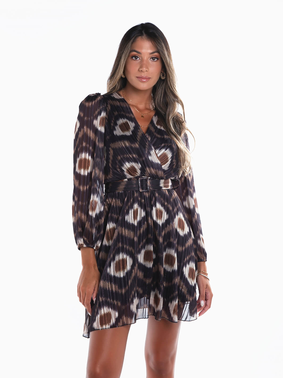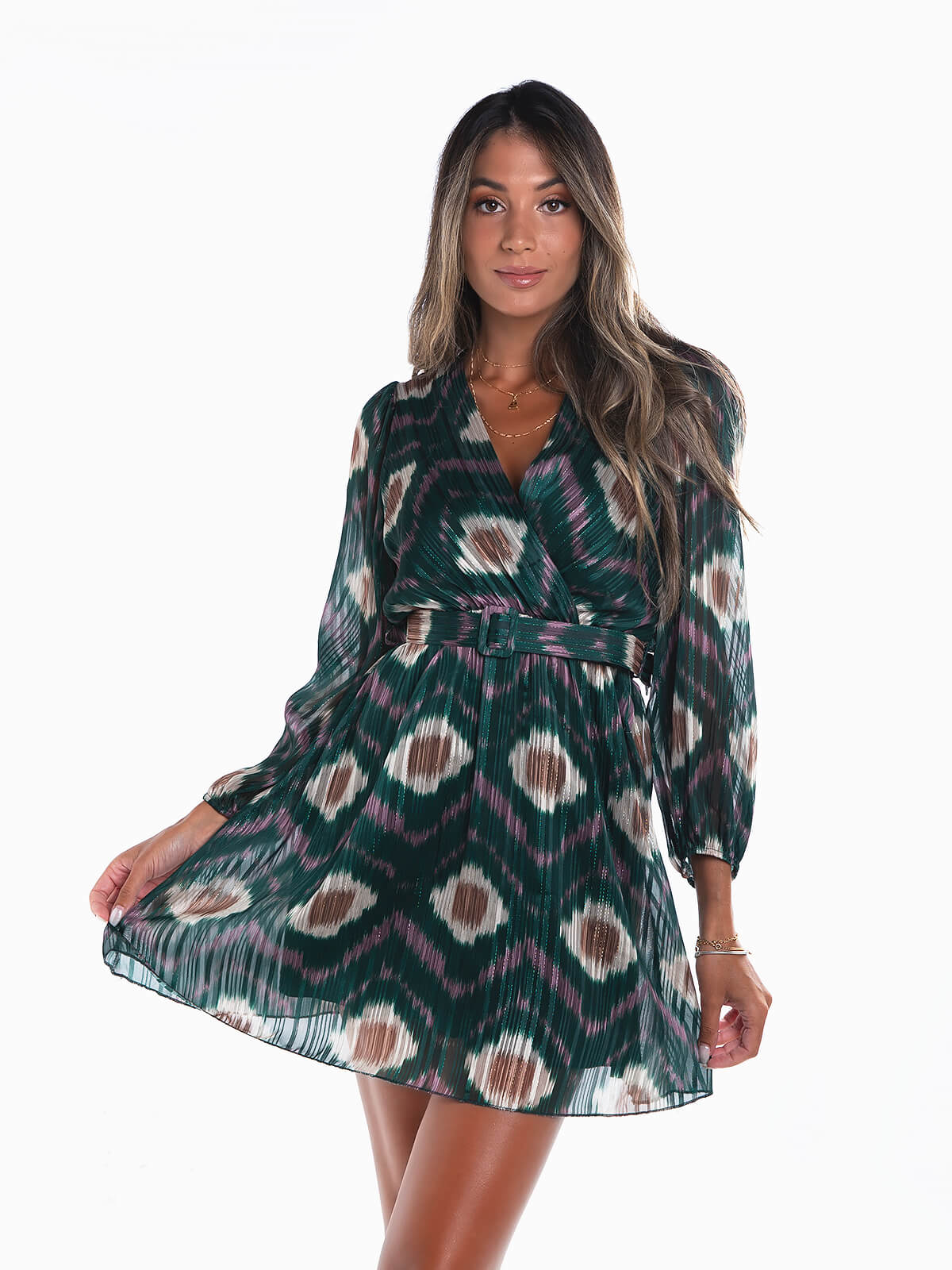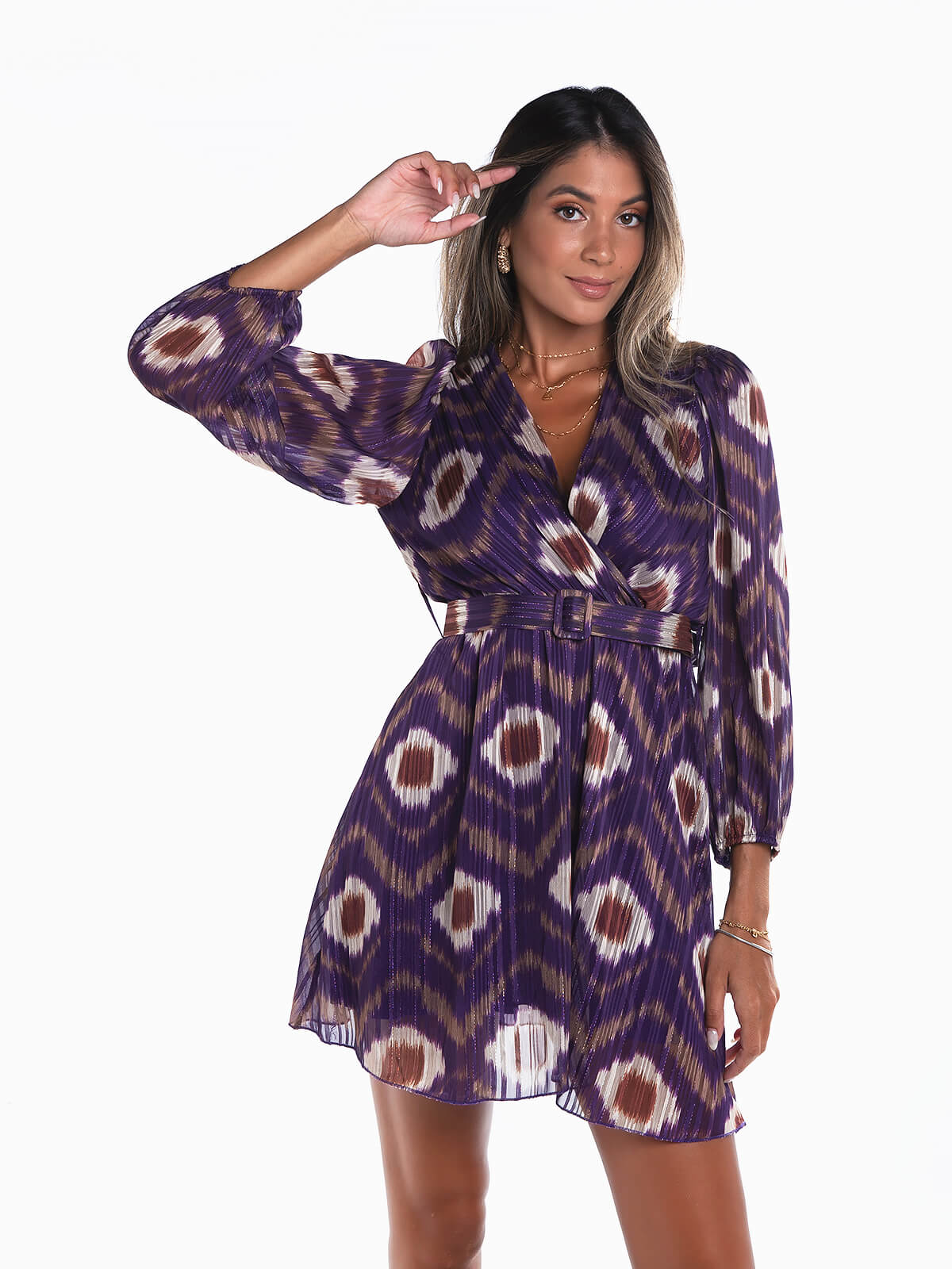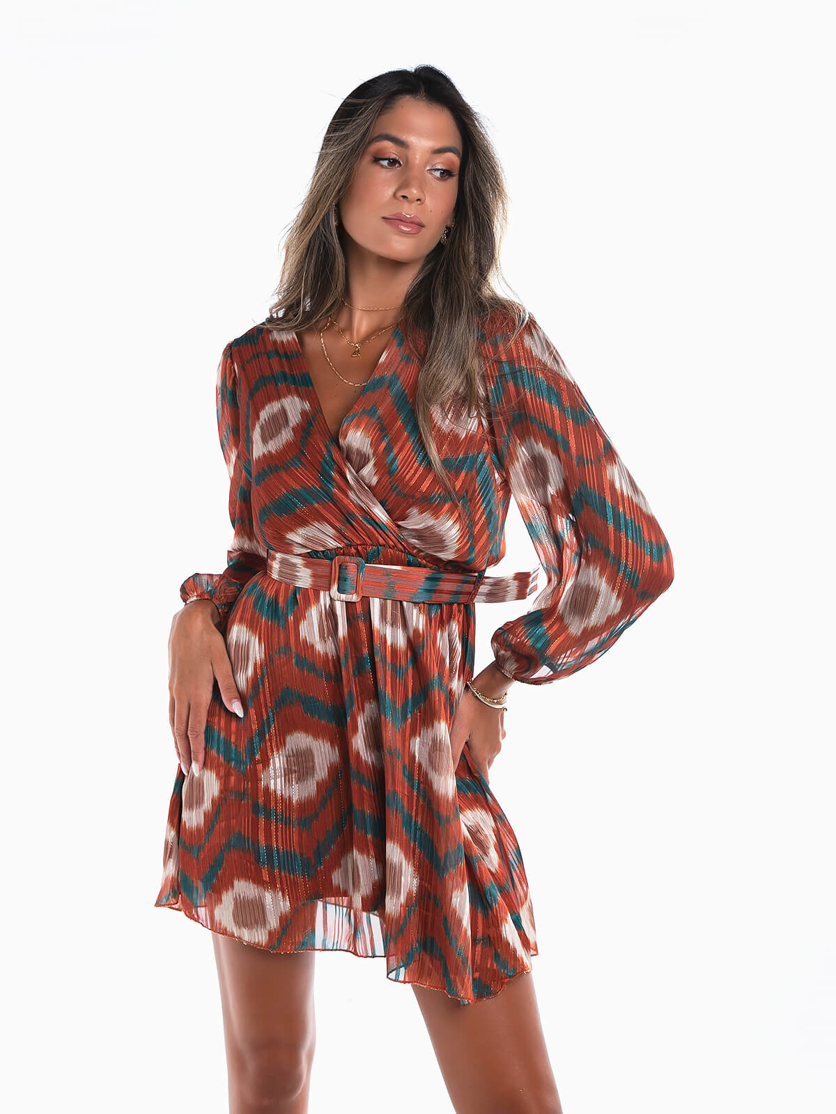 Vestido curto com estampado geométrico e cinto para ajustar. Vestido manga comprida em tecido semitransparente com punhos elásticos e decote cruzado. Cintura elástica. Interior forrado. Pormenores brilhantes.