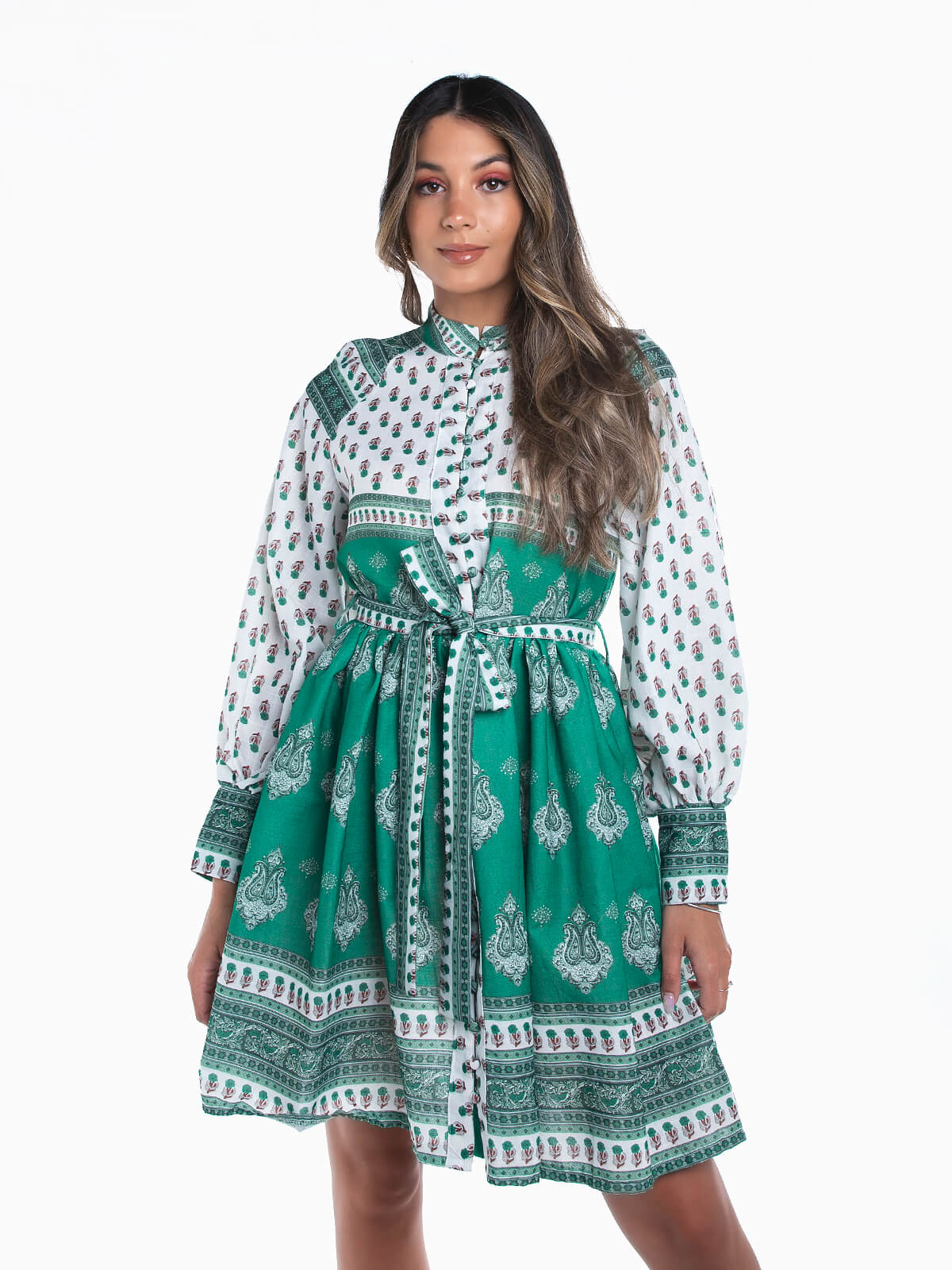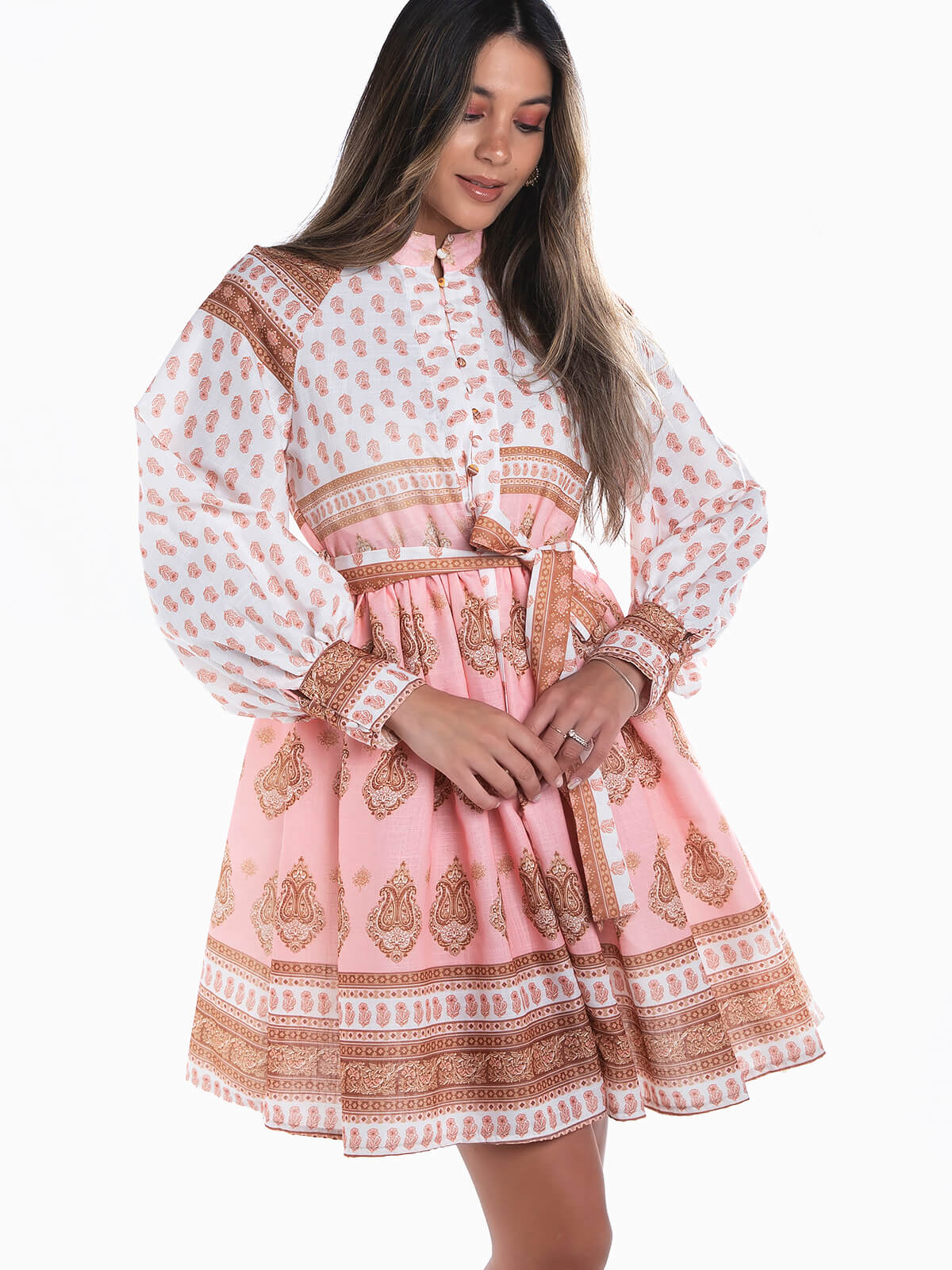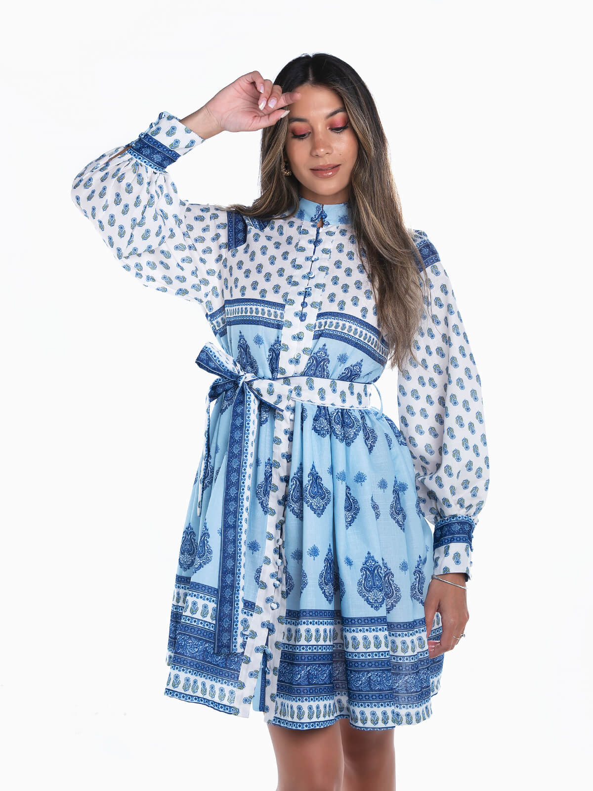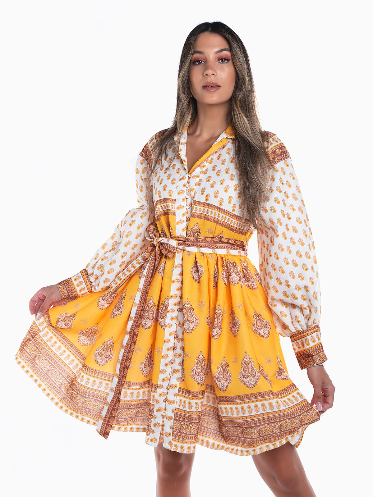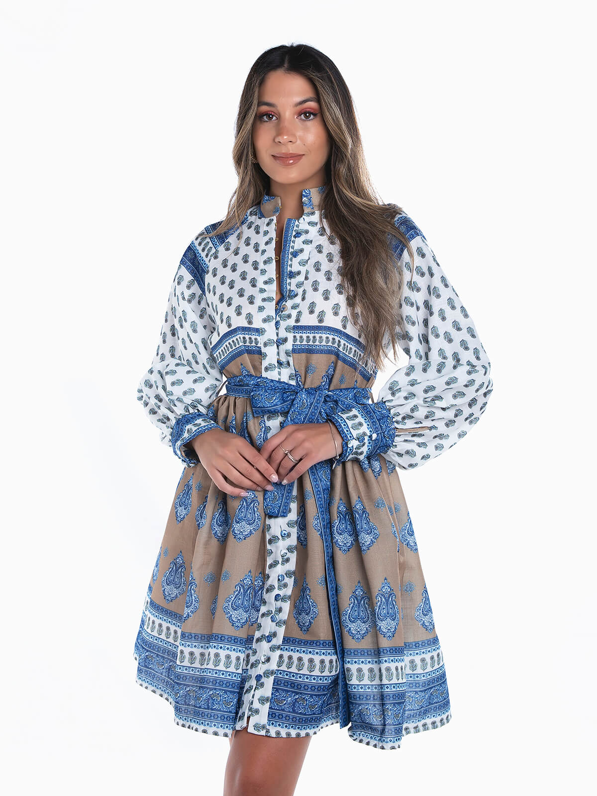 Vestido curto com estampado étnico e cinto para ajustar. Vestido de manga comprida abalonada em linho sintético com gola subida e punhos abotoados. Aperto frontal de botões forrados.