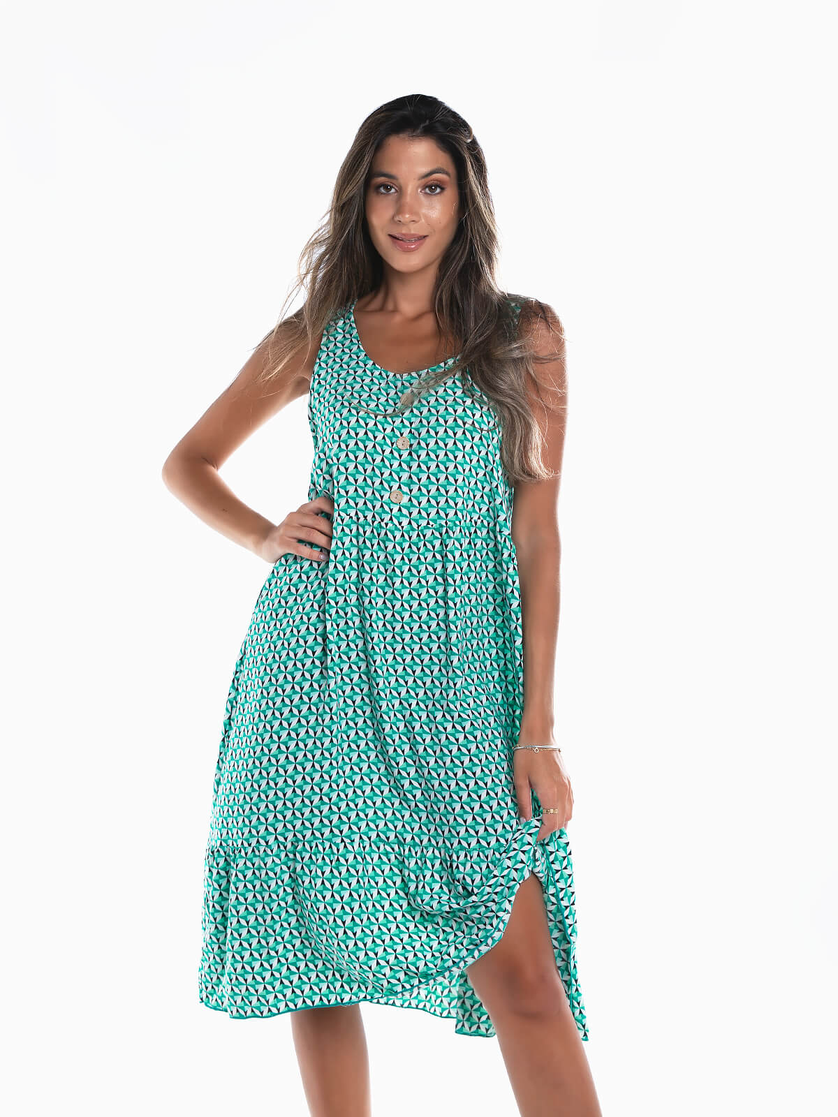 Vestido curto com estampado geométrico e encaixe de folho na base. Vestido largo de alças 100% algodão com decote redondo. Botões decorativos.
