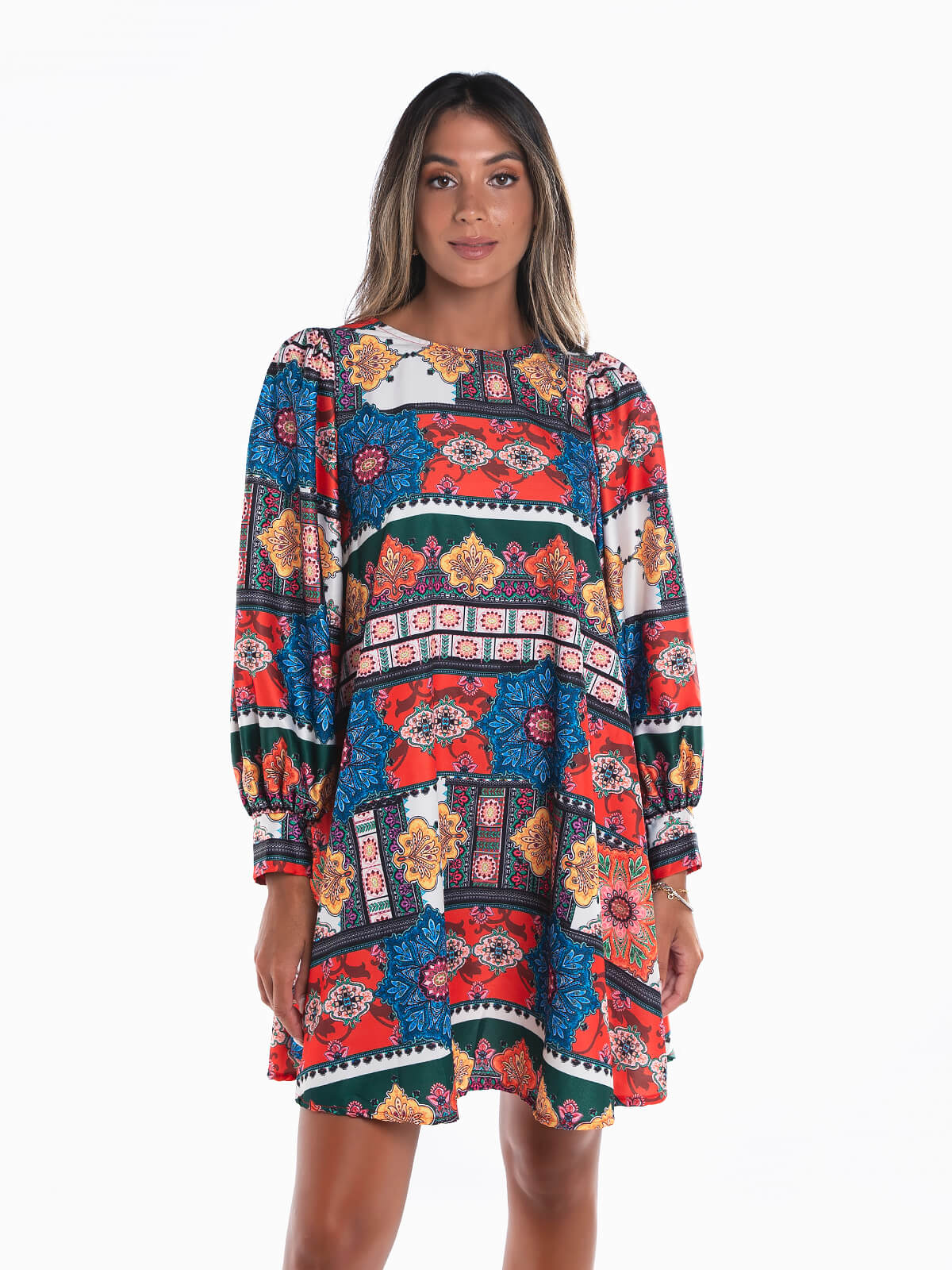 Vestido curto corte evasé com estampado étnico. Vestido fluído acetinado com manga abalonada e decote redondo. Aperto posterior de botão.