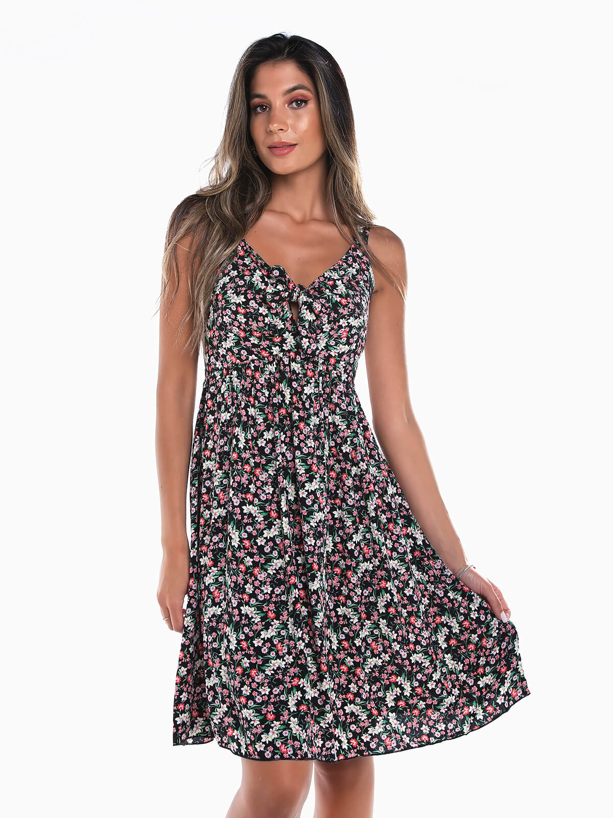 Vestido curto estampado floral com nó para laço no peito. Vestido fluído de alças com decote em bico e parte posterior elástica.