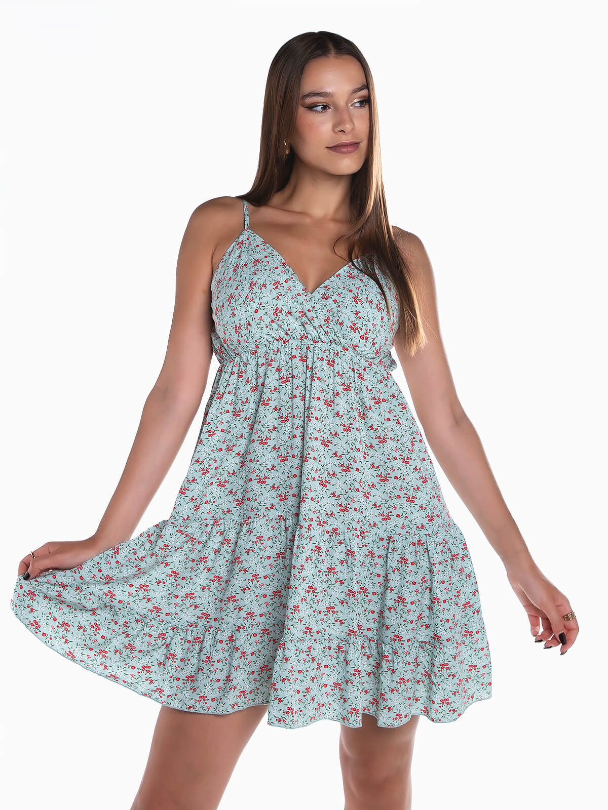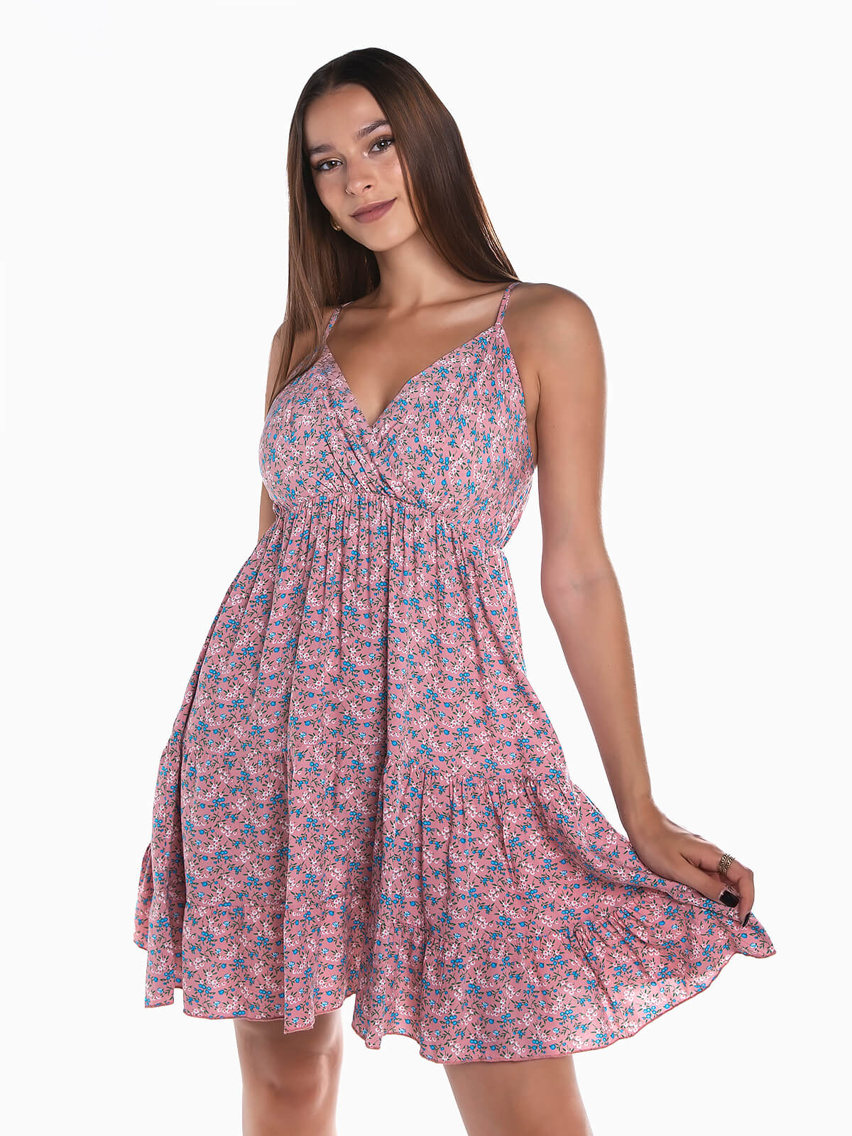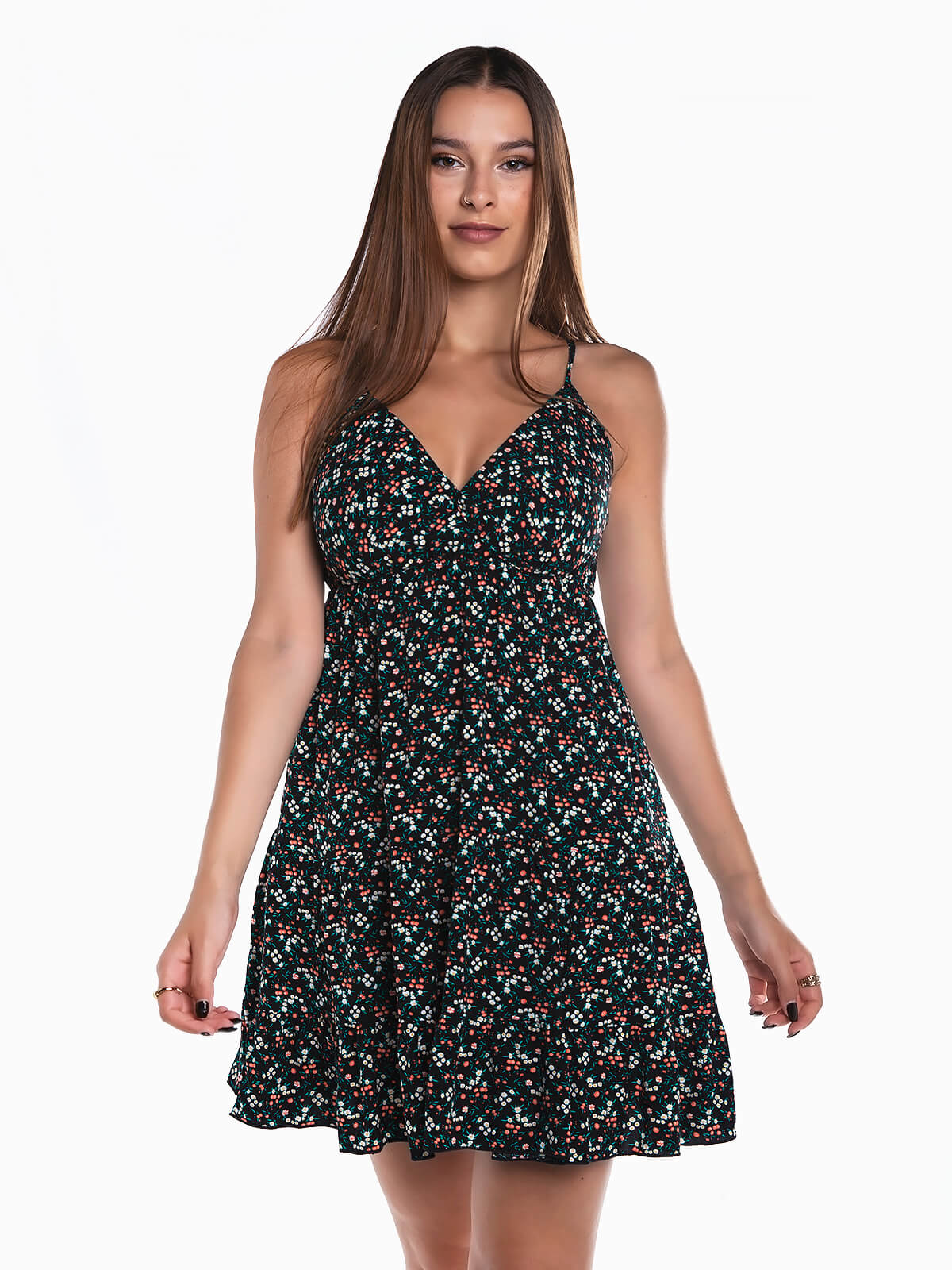 Vestido curto estampado floral com encaixe folhos. Vestido fluído com alças reguláveis e decote cruzado.