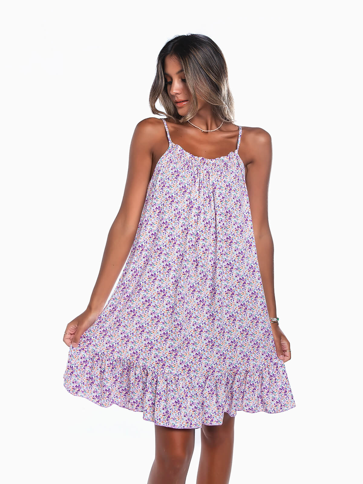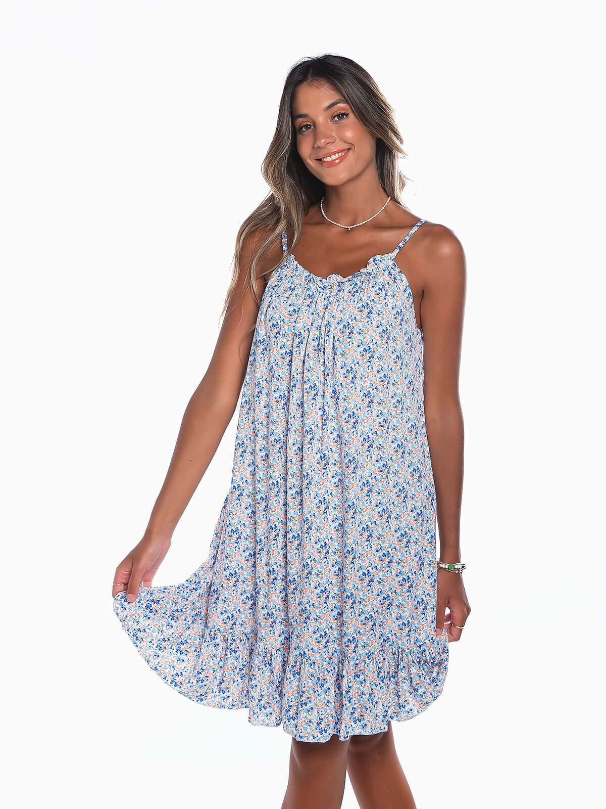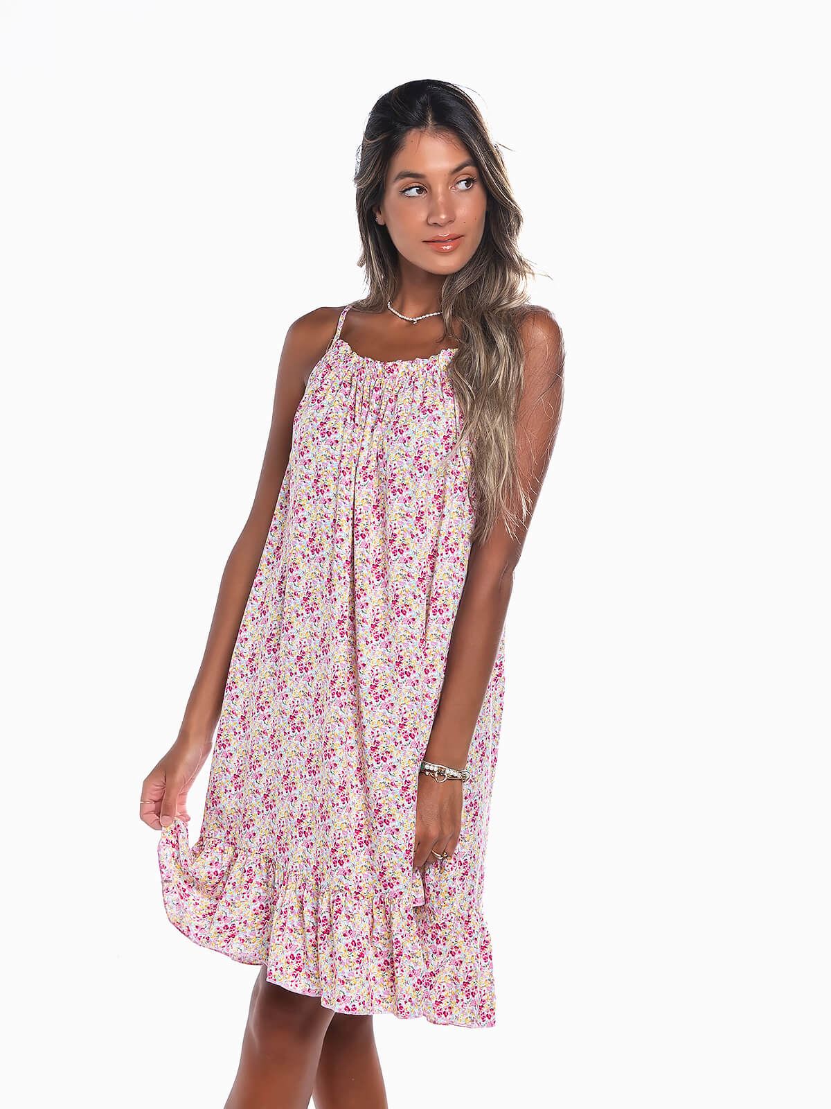 Vestido curto com estampado floral e encaixe de folho na base. Vestido de alças finas fluído em 100% algodão com decote redondo.