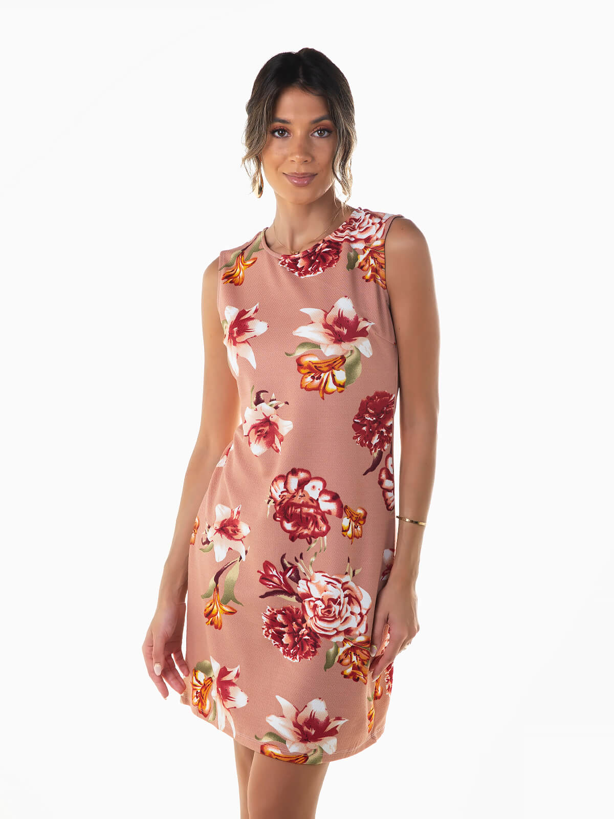 Vestido curto sem mangas com estampado floral. Vestido para senhora em tecido com textura e decote redondo.