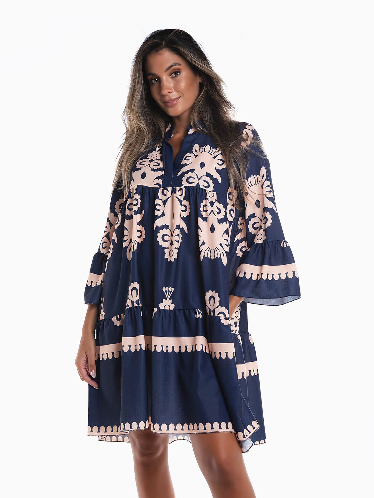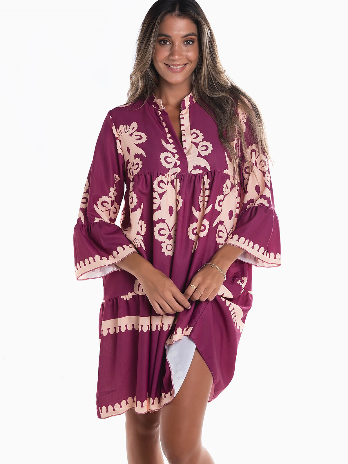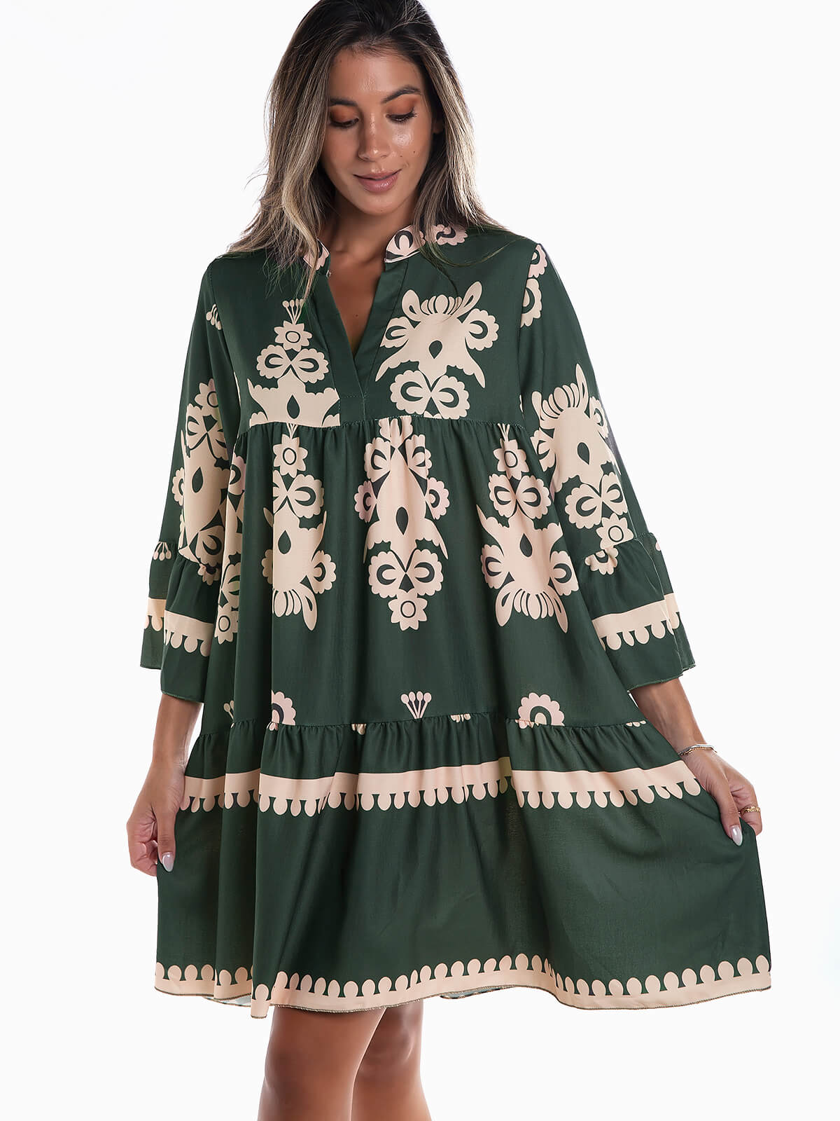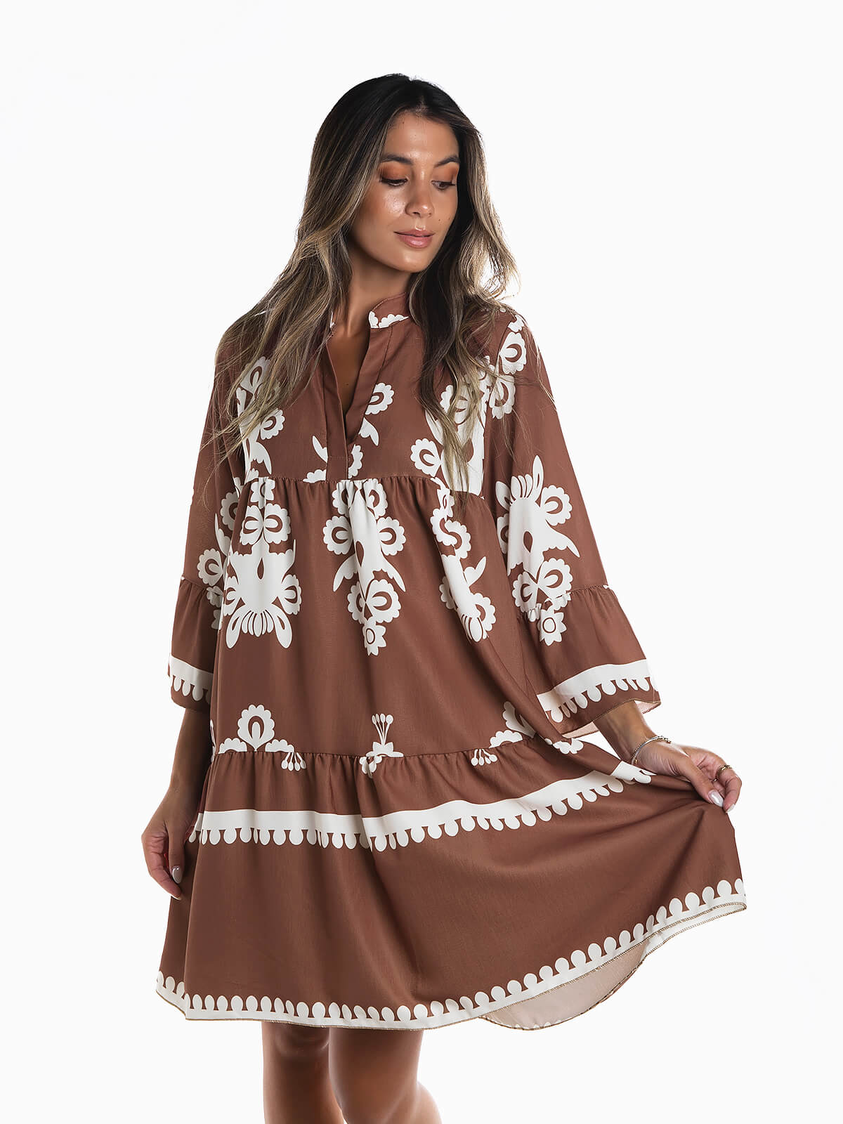 Vestido curto fluído com estampado étnico para senhora. Vestido manga 3/4 com encaixe de folho. Decote em bico.