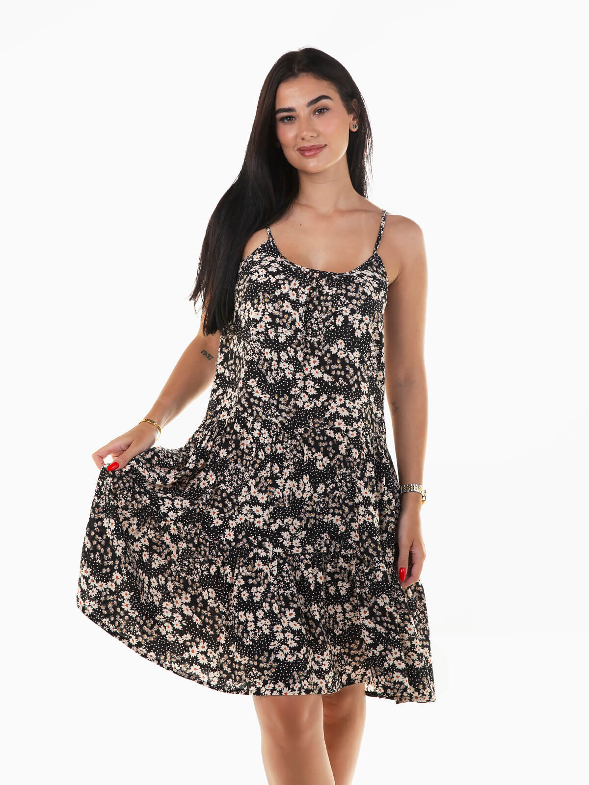 Vestido curto fluído preto com padrão floral e encaixe de painéis. Vestido alças finas ajustáveis com decote redondo. Um essencial fresco da estação.