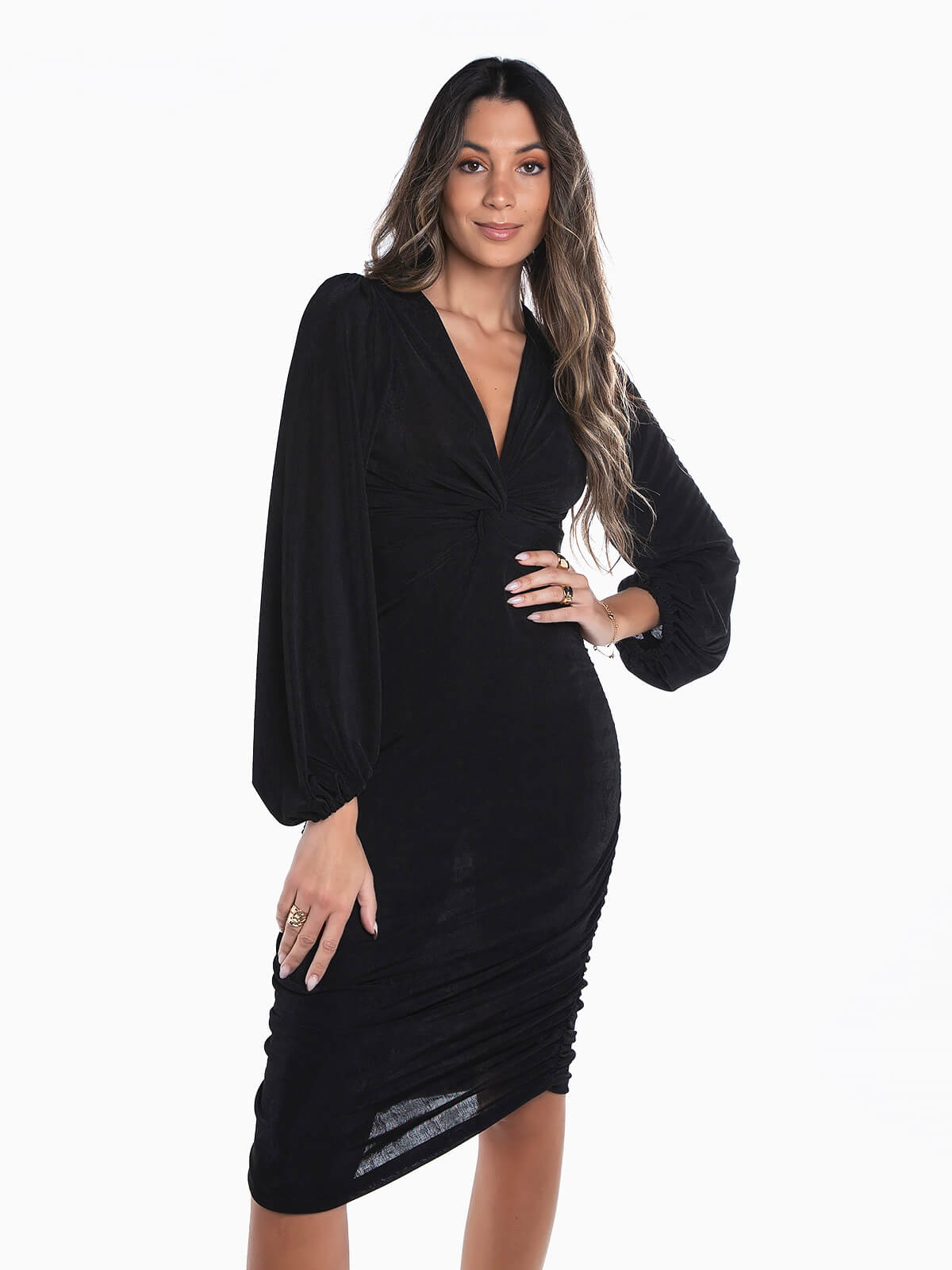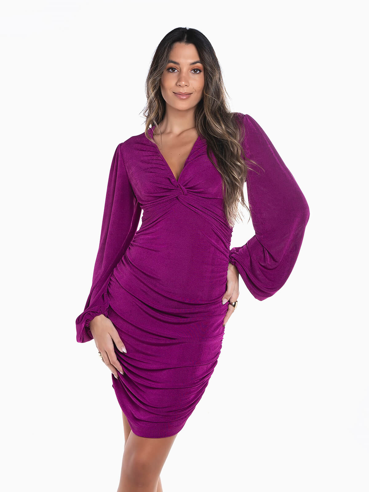 Vestido curto com franzidos e decote em V para senhora. Vestido lycra justo de manga comprida abalonada com punho elástico.