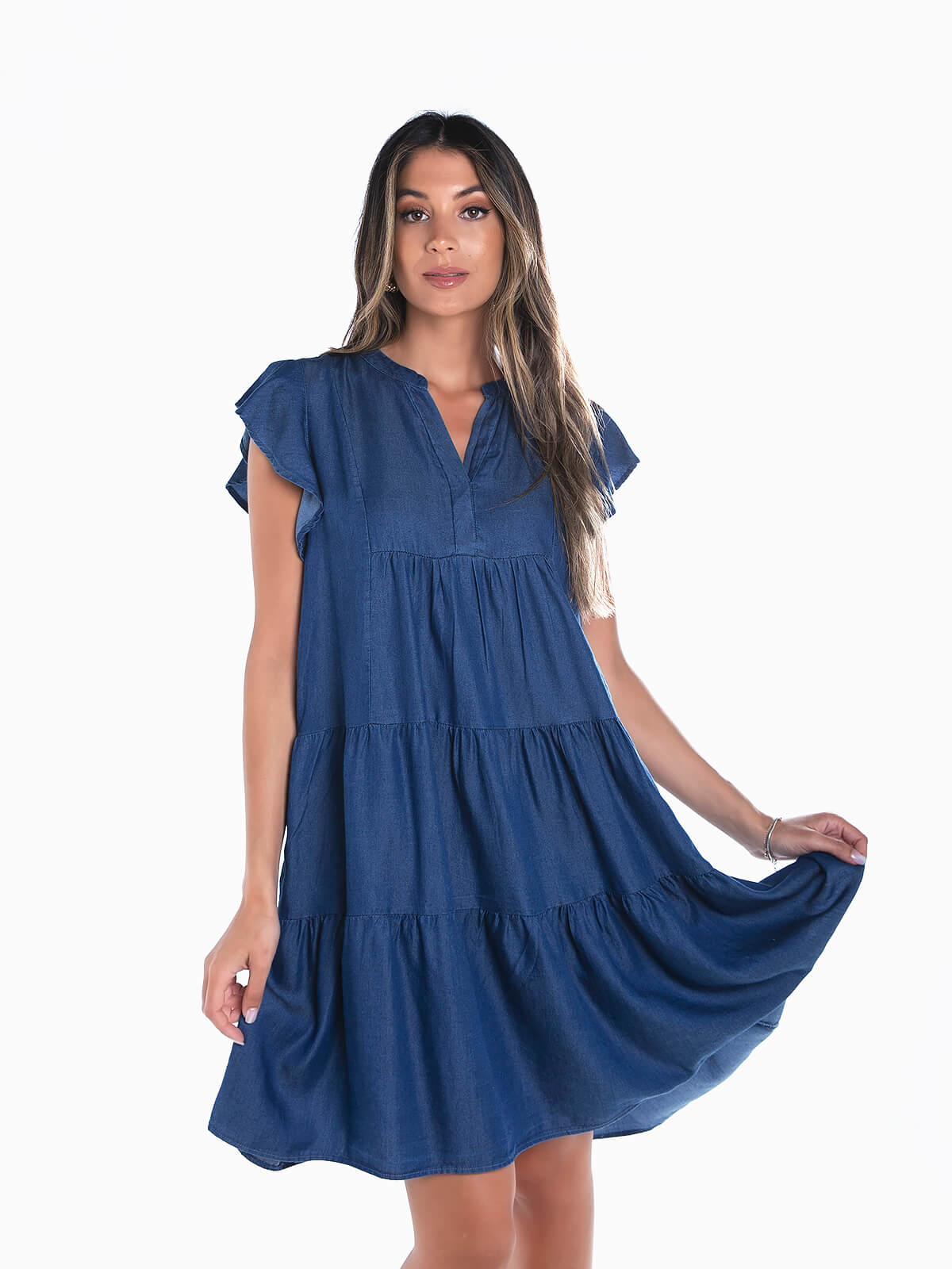 Início Mulher Vestidos Vestidos Curtos Vestido curto ganga com folhos