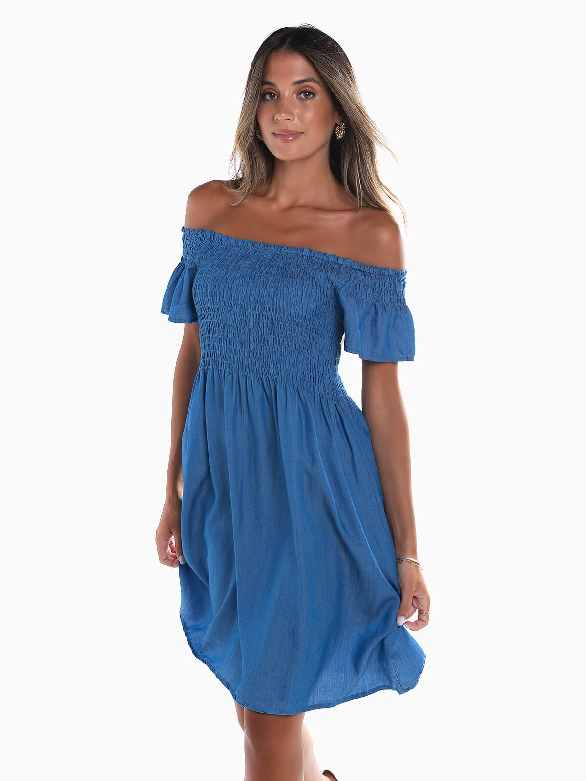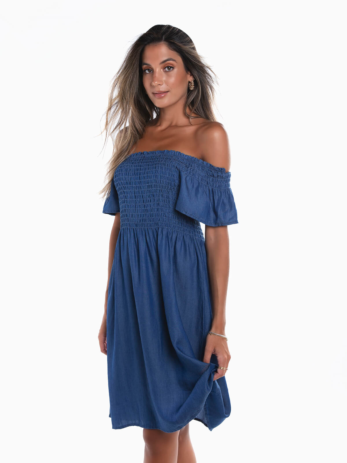 Vestido curto ganga com decote barco e manga curta. Vestido 100% algodão com peito em franzido smock.