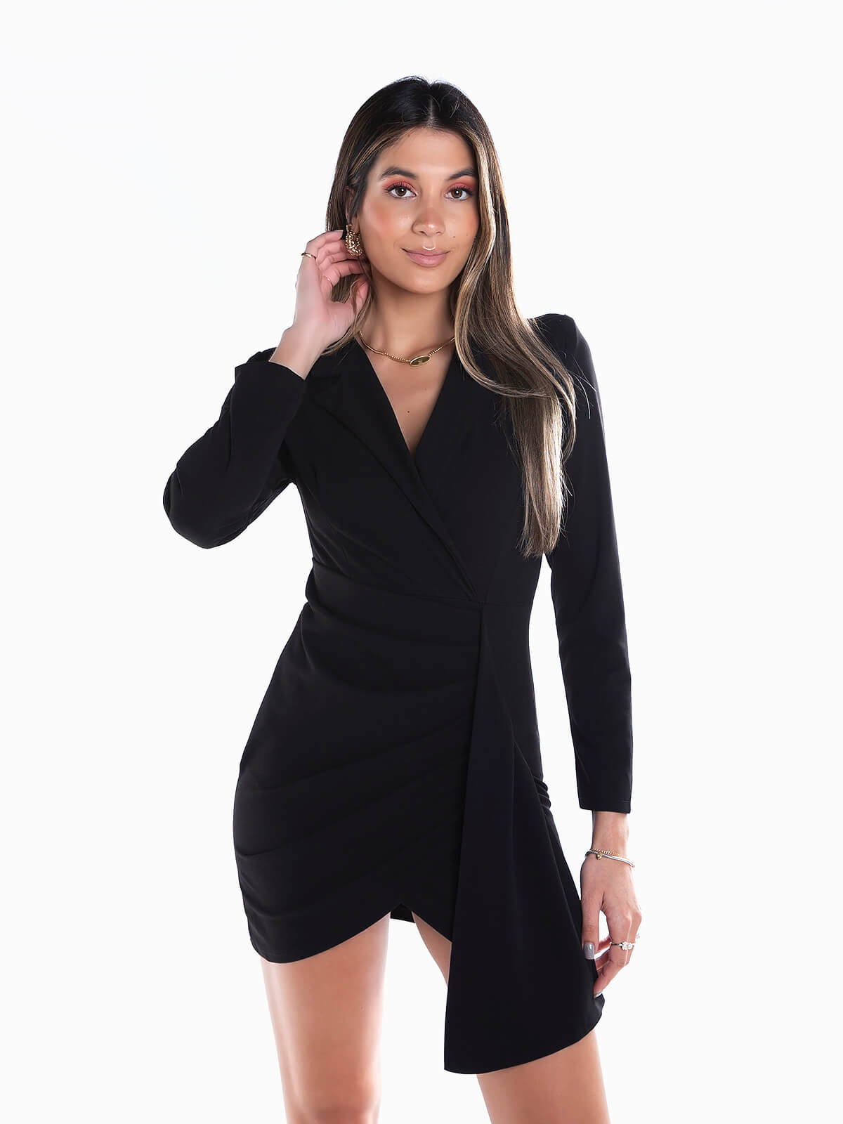 Vestido curto justo com efeito drapeado. Vestido cintado de manga comprida com ombreiras aplicadas. Decote cruzado com abas e lapelas.