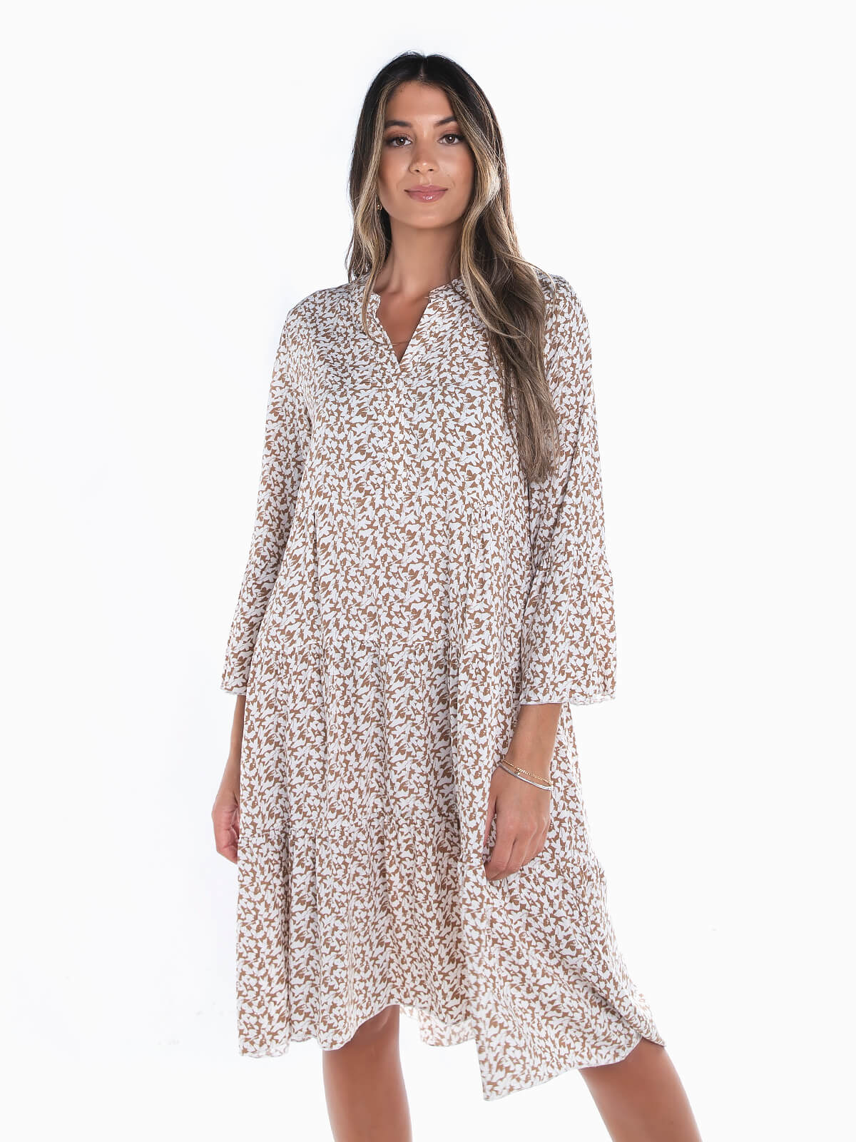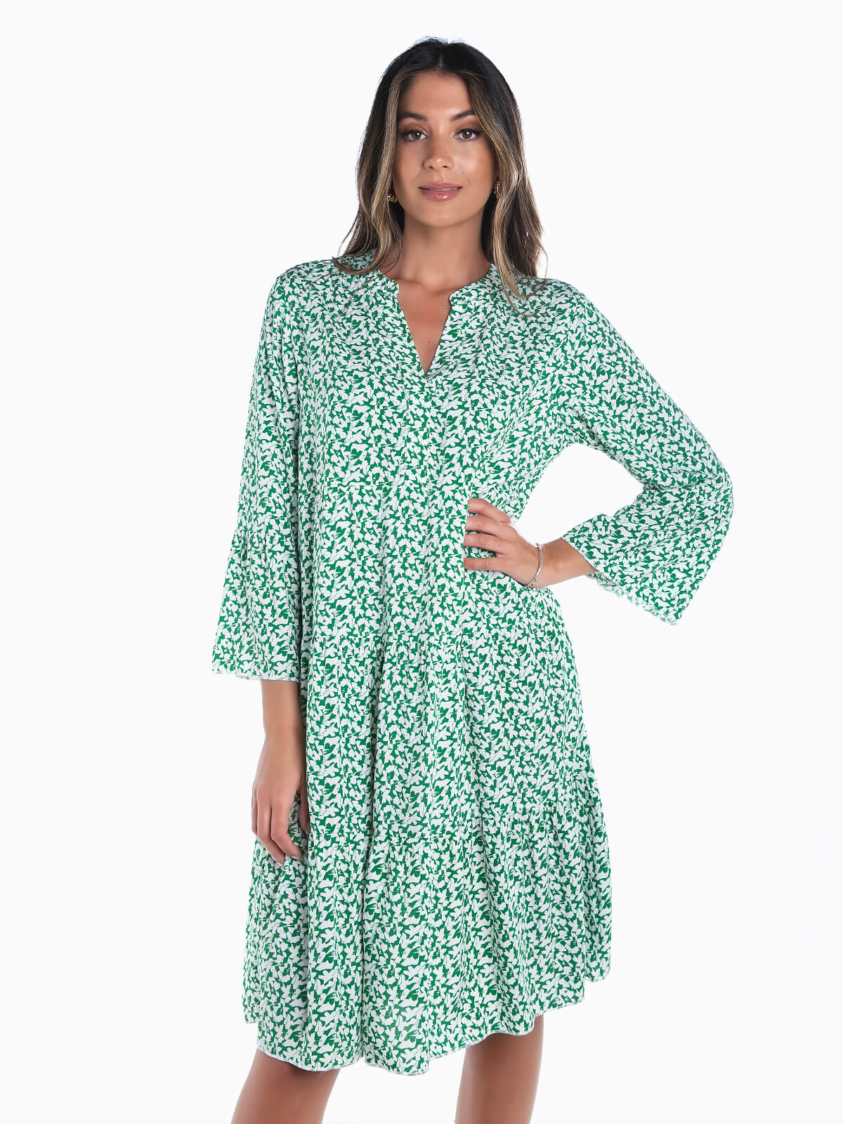 Vestido curto largo com estampado floral abstrato. Vestido com manga 3/4 e decote em bico. Encaixe de folhos.