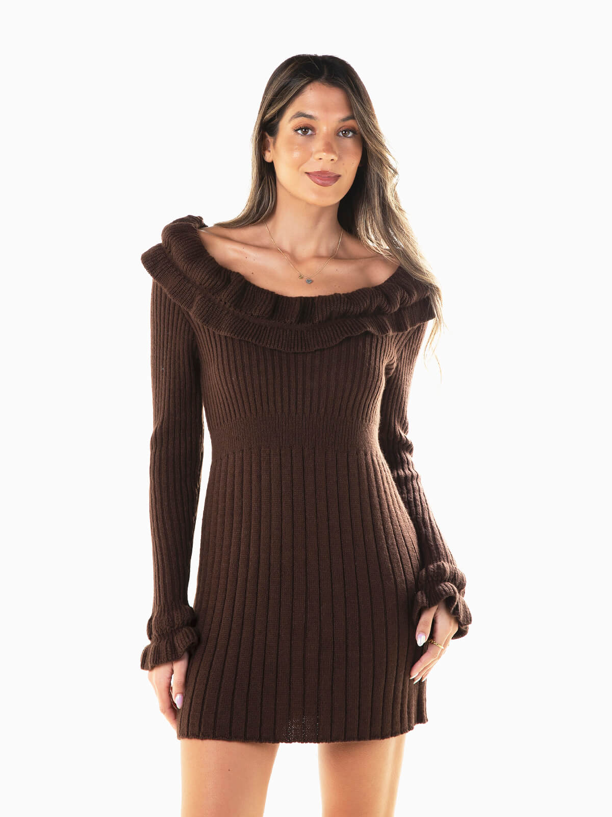 Vestido curto de malha canelada com folhos aplicados no decote e punhos. Vestido cintado de manga comprida com decote barco.