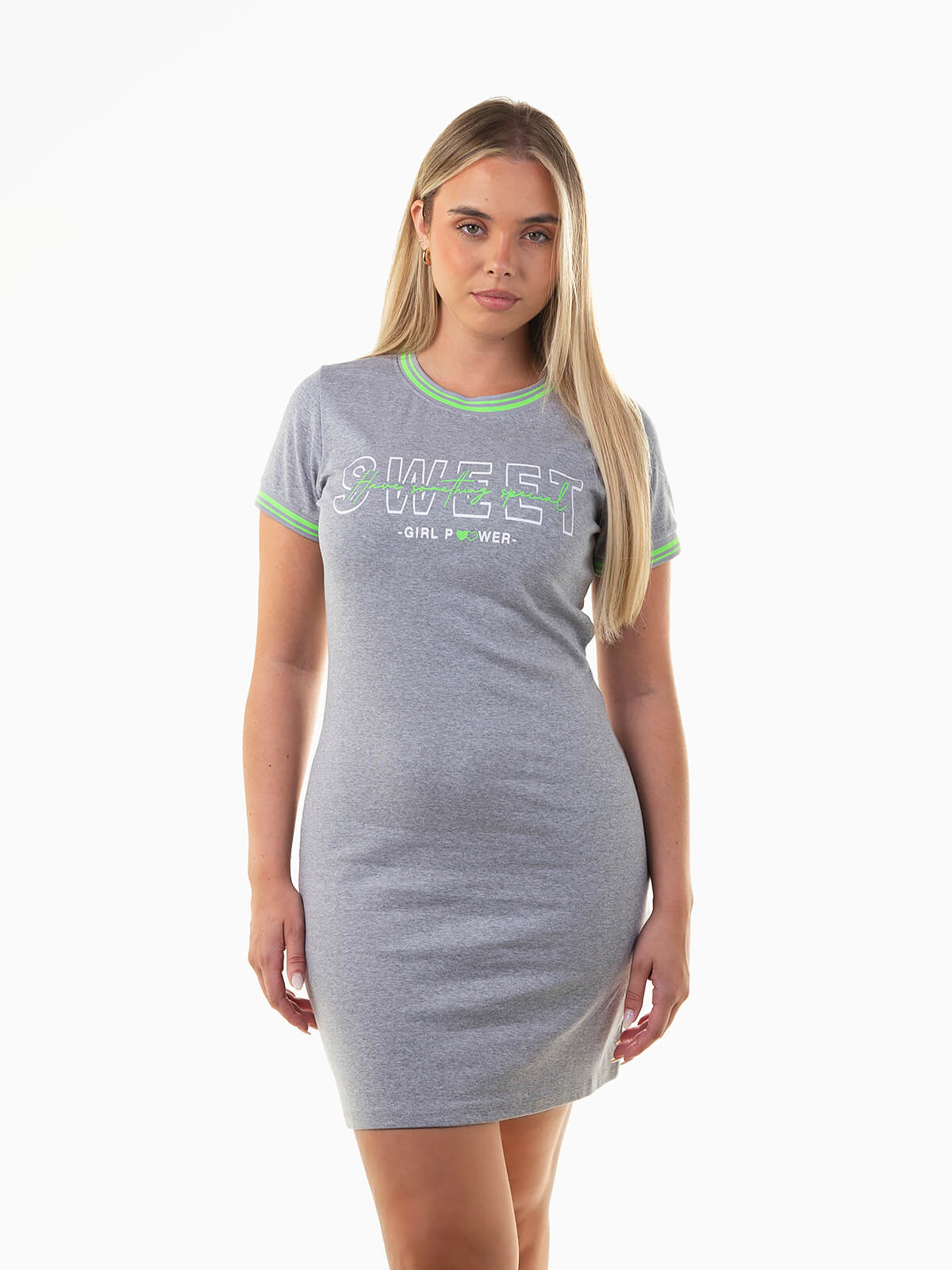 Vestido curto em malha de algodão com lettering no peito. Modelo justo e confortável com manga curta e decote redondo acabado com cor em contraste. Ideal para usar com sapatilhas para um look urbano e descontraído.