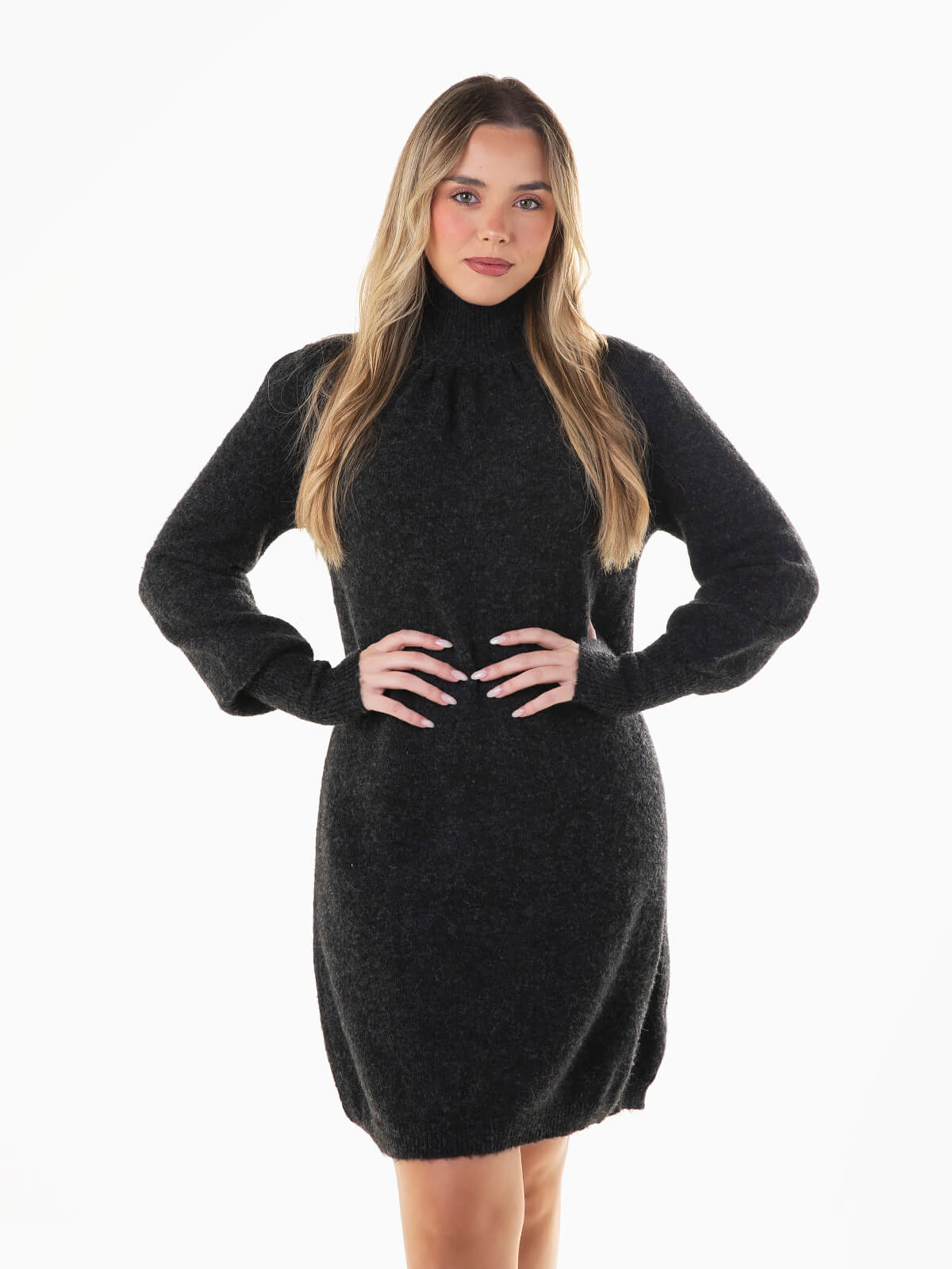 Vestido curto em malha mesclada com mistura de lã para maior conforto térmico. Vestido manga comprida com gola alta e punhos justos. Acabamentos canelados.