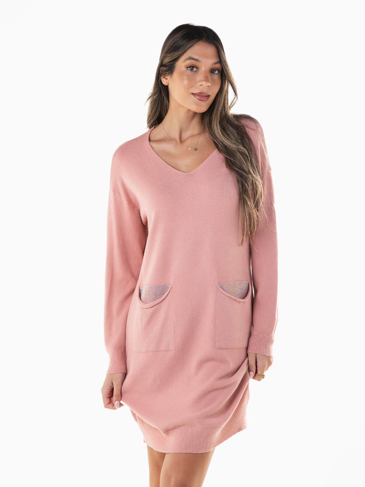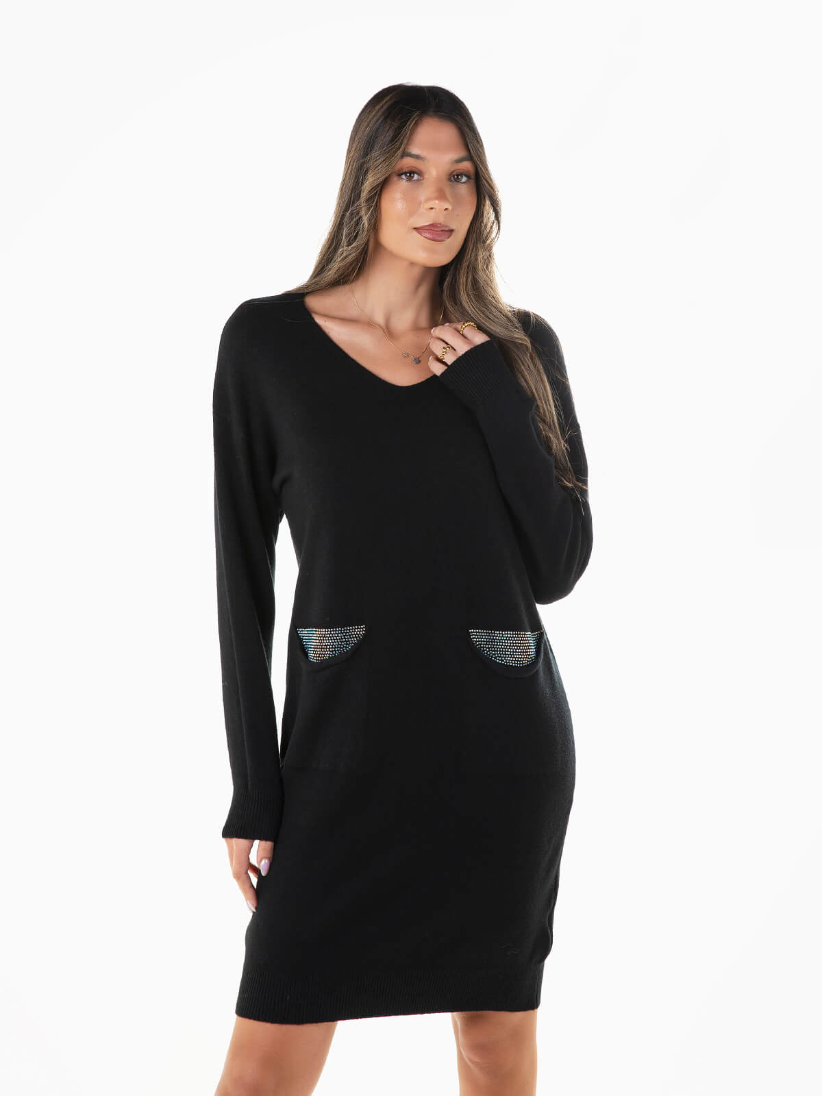 Vestido malha curto com strass aplicado nos bolsos. Vestido de manga comprida com decote em V e acabamentos canelados. 2 bolsos.