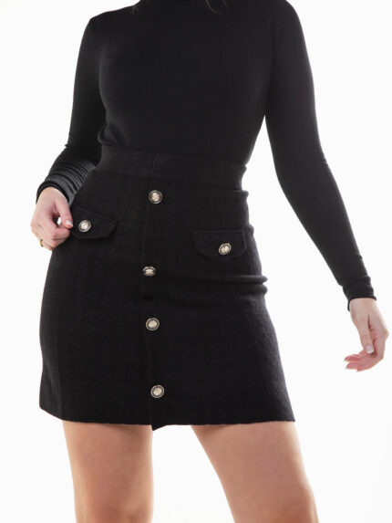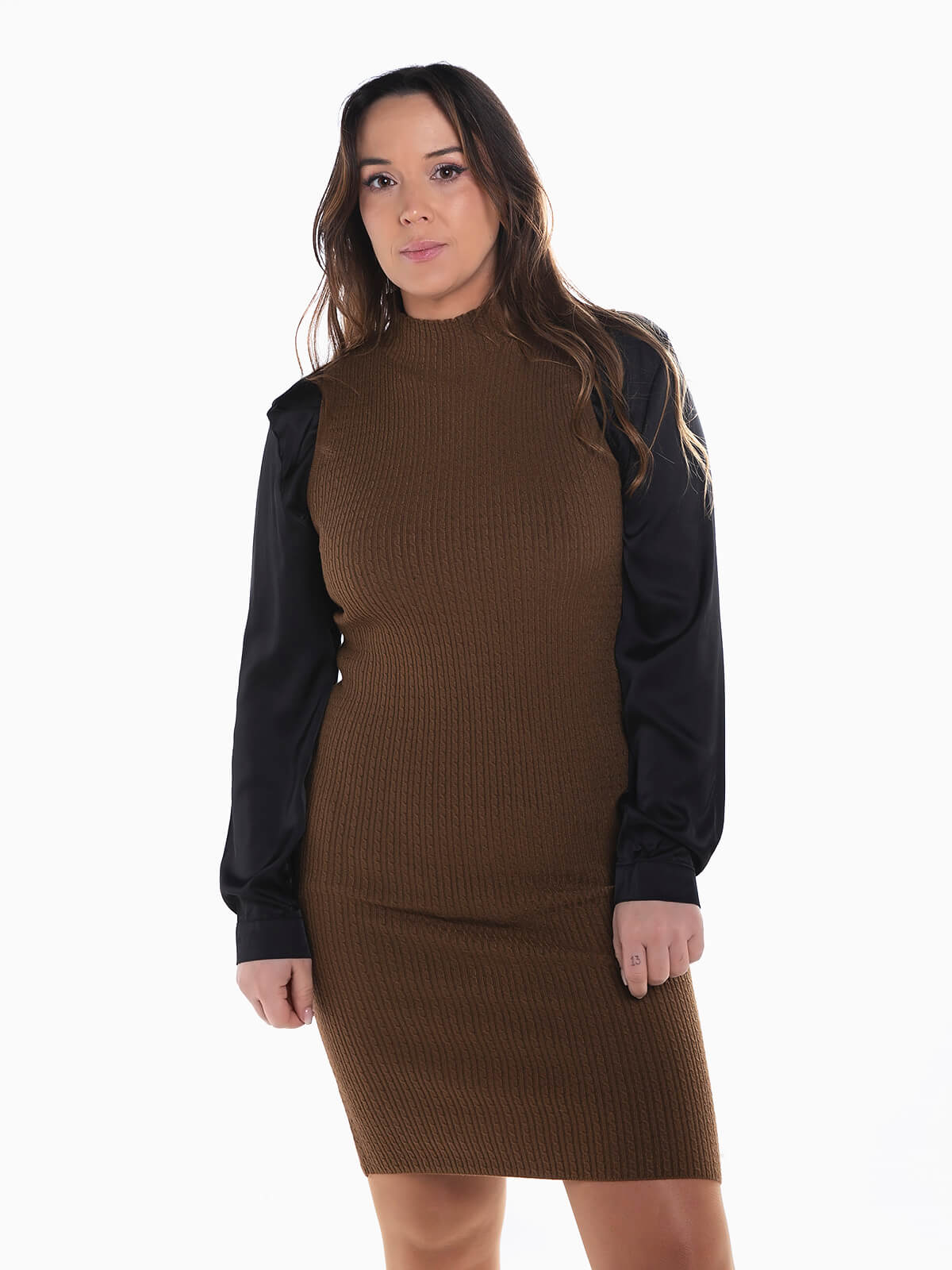 Vestido curto em malha de cabo para senhora. Vestido justo de manga cava com gola perkins.