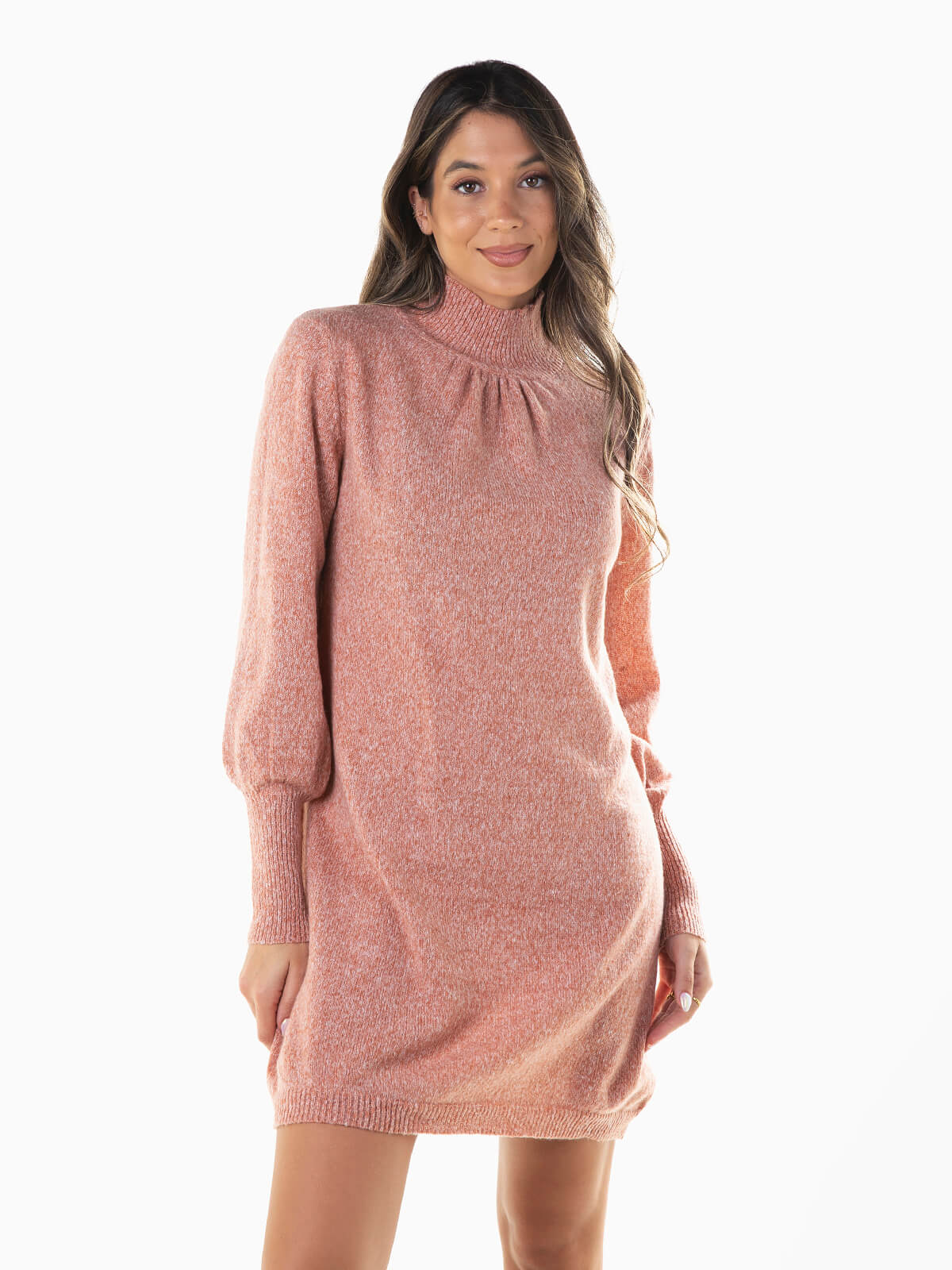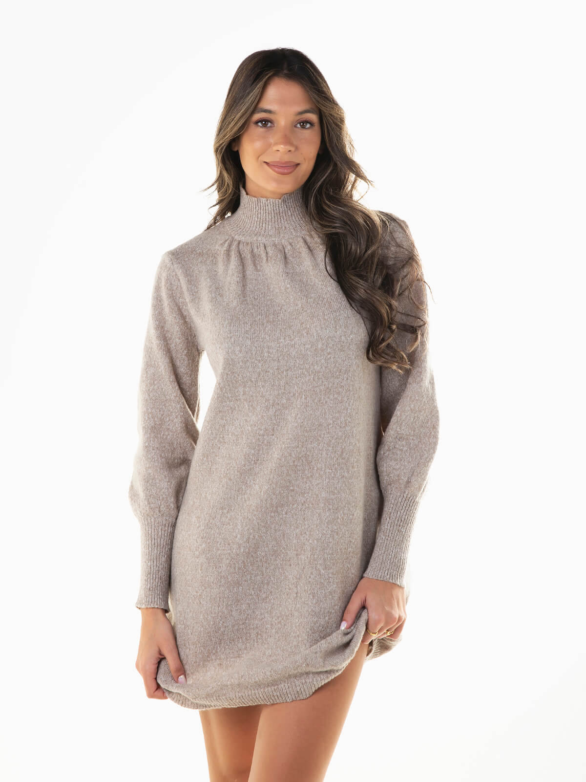 Vestido curto em malha mesclada com mistura de lã para maior conforto térmico. Vestido de manga comprida com gola alta e punhos justos. Acabamentos canelados.
