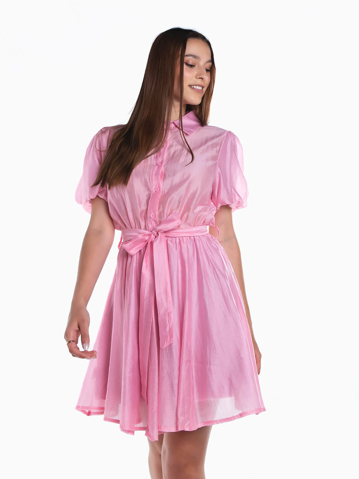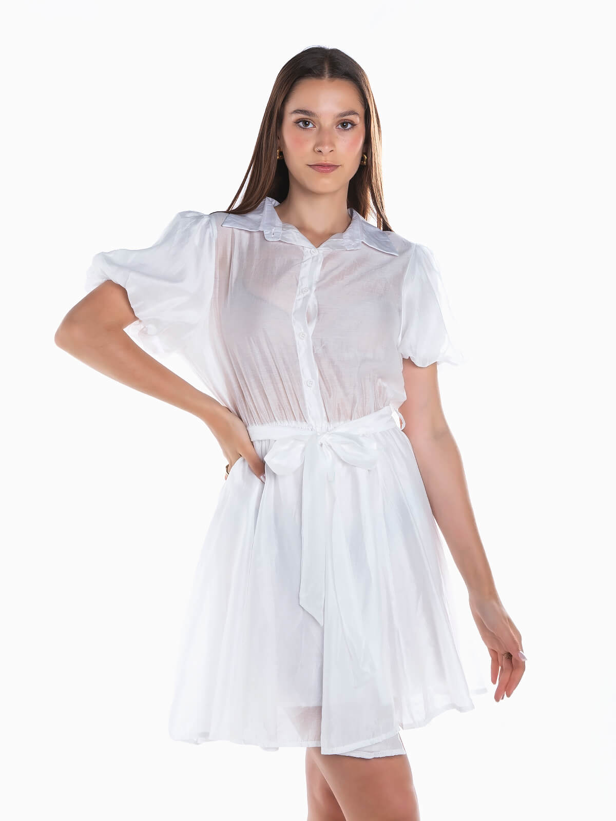 Vestido curto com manga abalonada para senhora. Vestido em tecido com transparência e cinto para laço. Gola de abas. Interior forrado. Aperto frontal de botões.