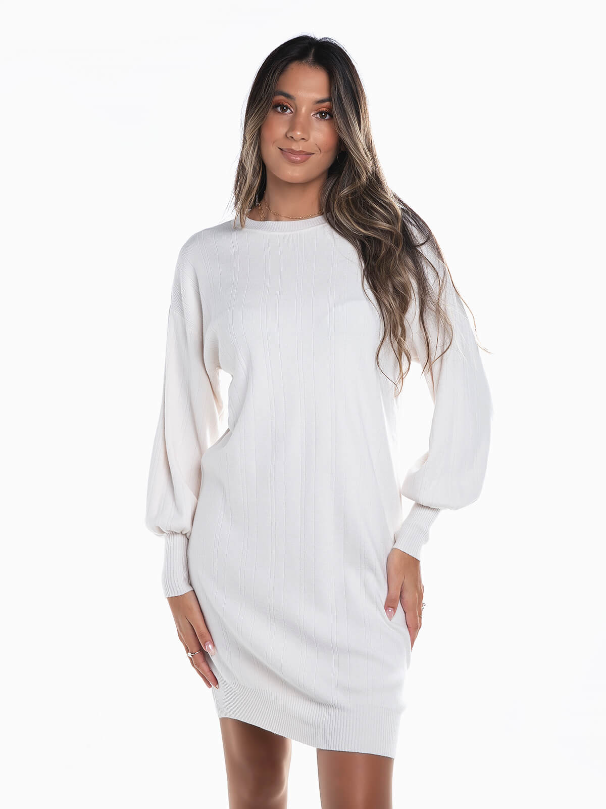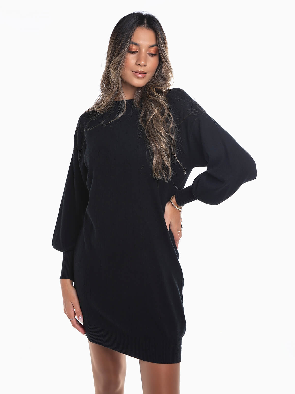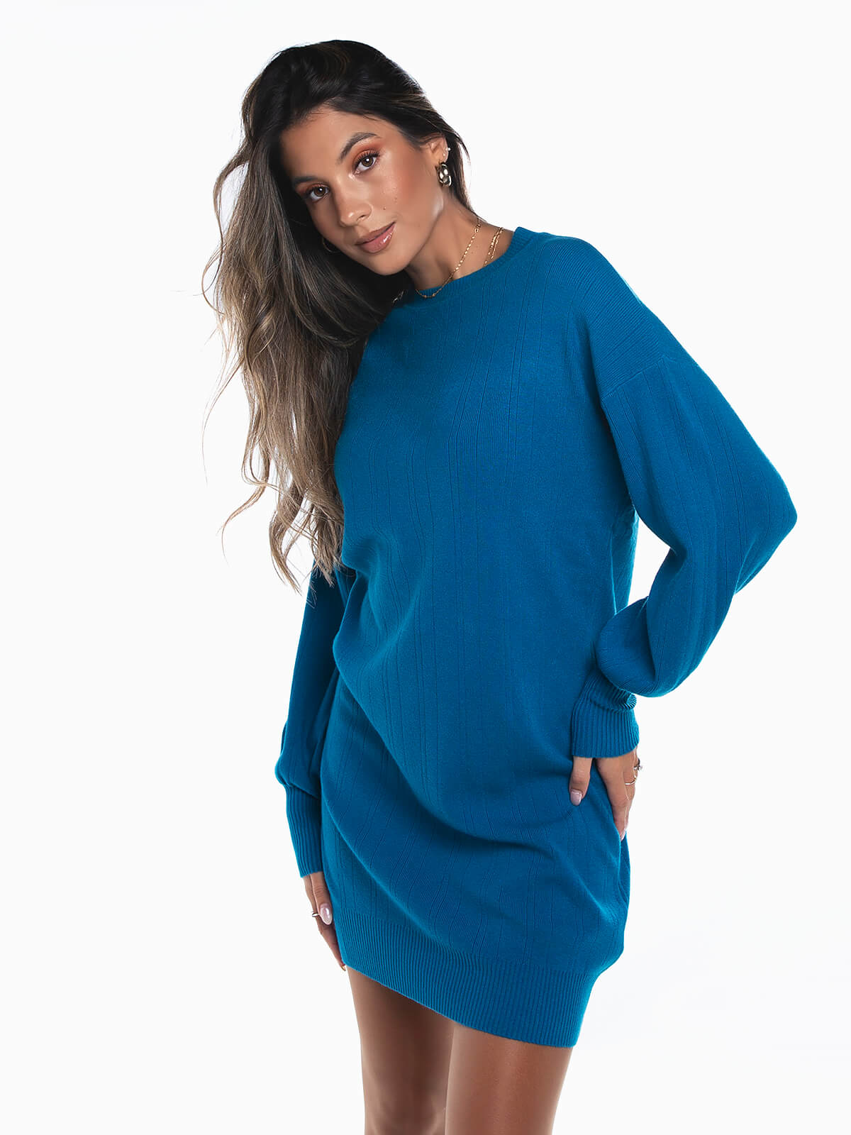 Vestido curto oversize em malha com textura. Vestido manga comprida com decote redondo e acabamentos canelados.