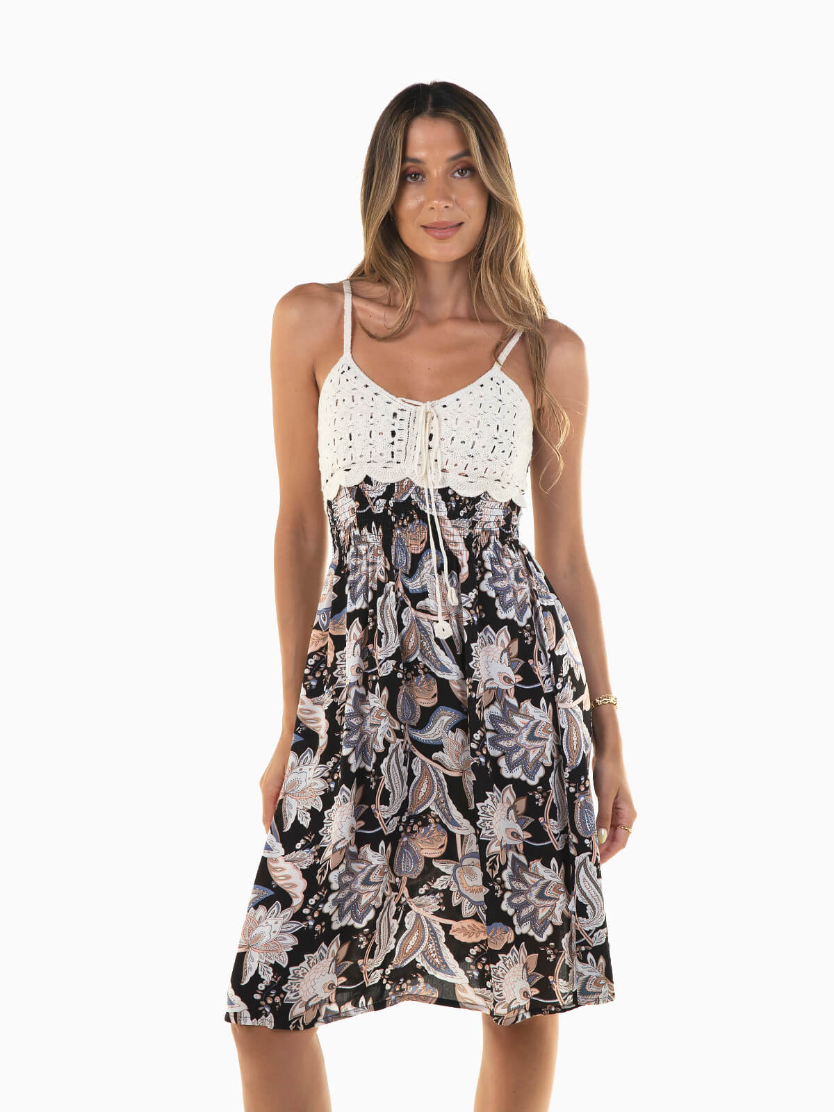 Vestido curto fluído preto com padrão floral em contraste. Vestido de alças com parte superior em crochet e franzido smock. Decote em bico e cordão para laço.