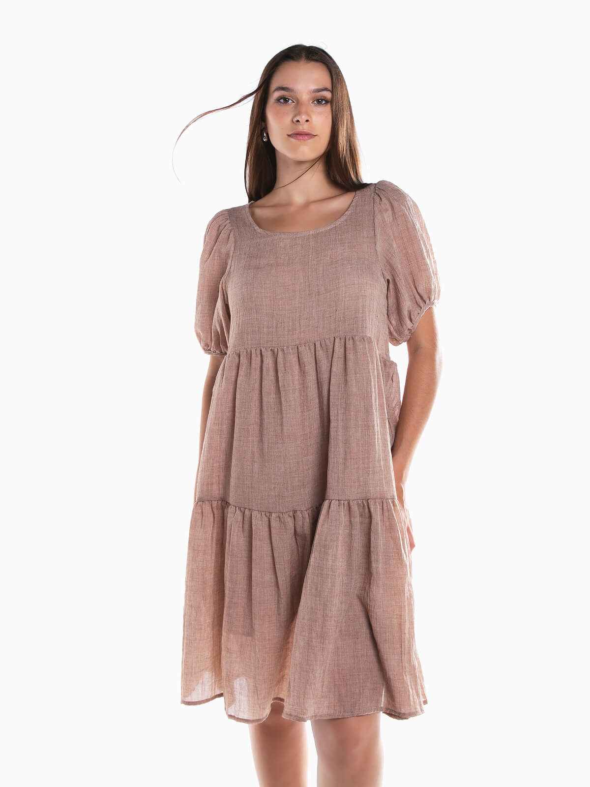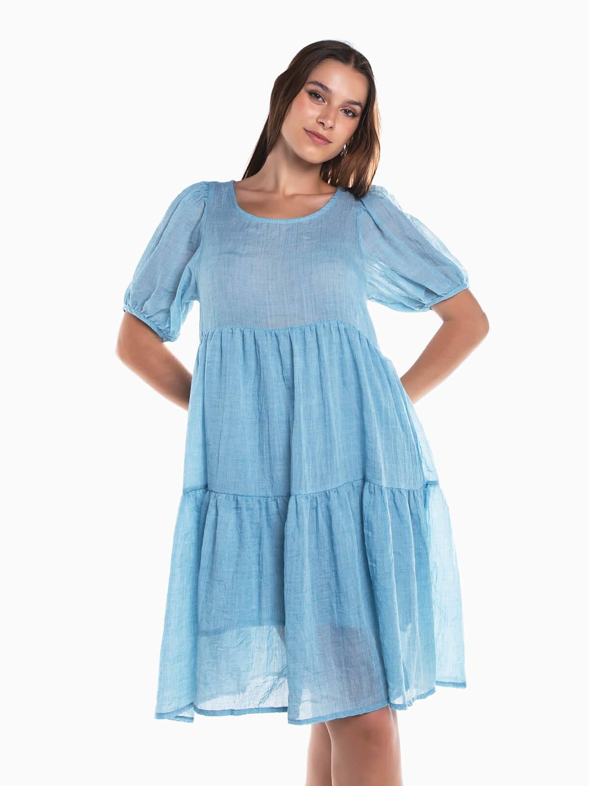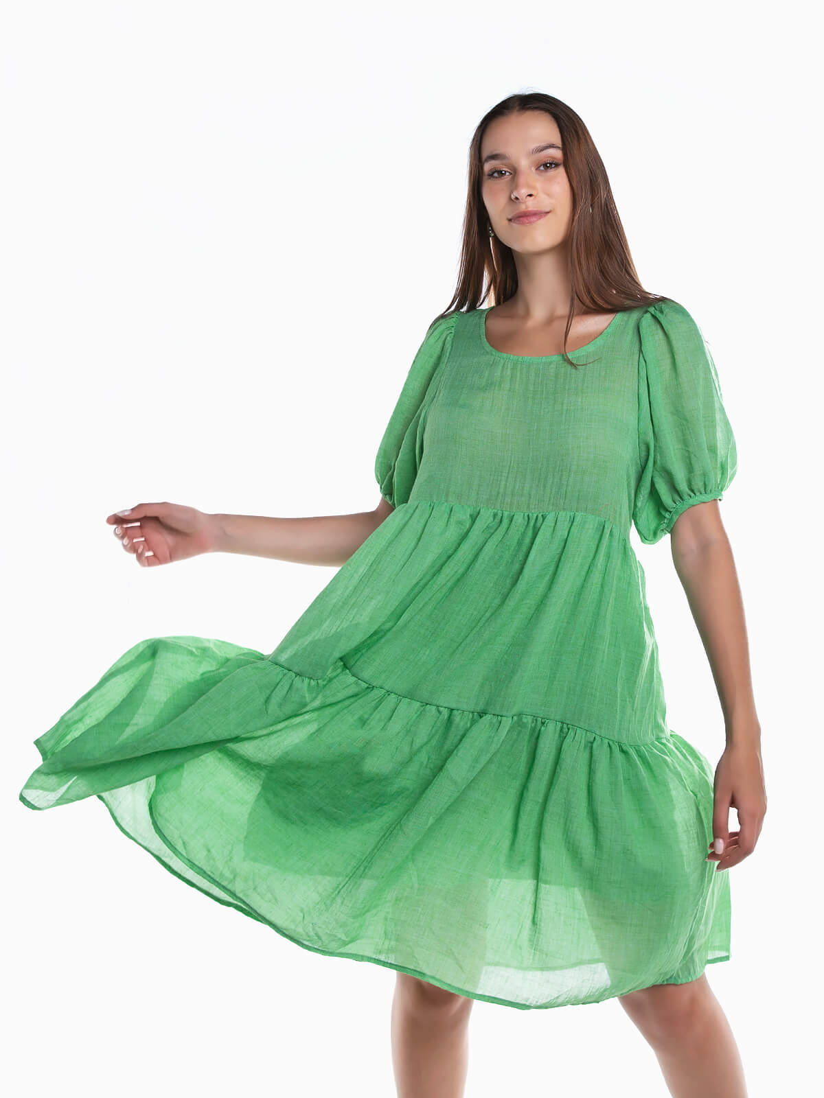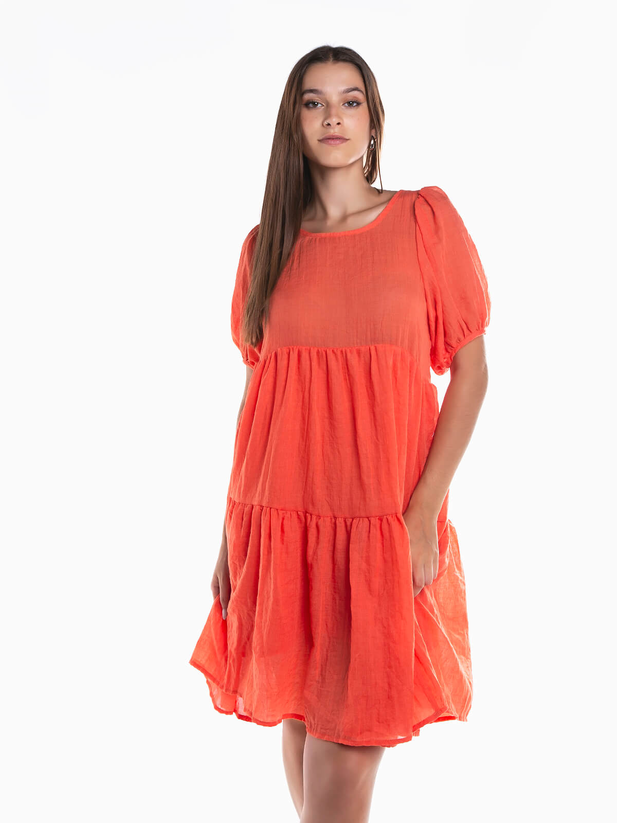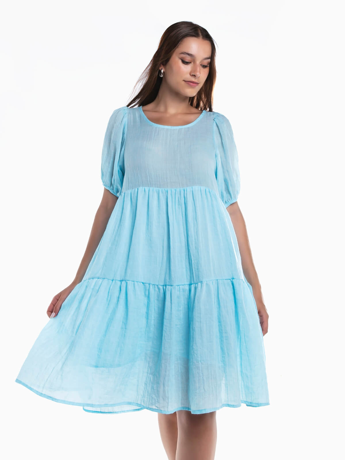 Vestido curto em tecido com transparência. Vestido manga curta abalonada com encaixe de folhos. Decote redondo e interior forrado.