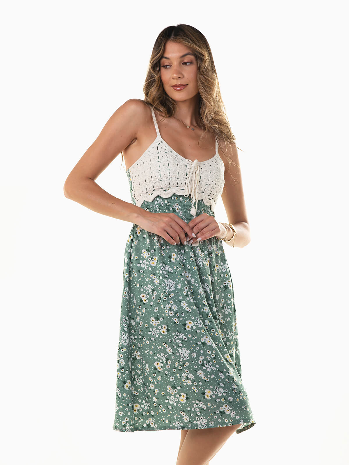 Vestido curto fluído verde com flores em contraste. Vestido de alças com parte superior em crochet e franzido smock. Decote em bico.