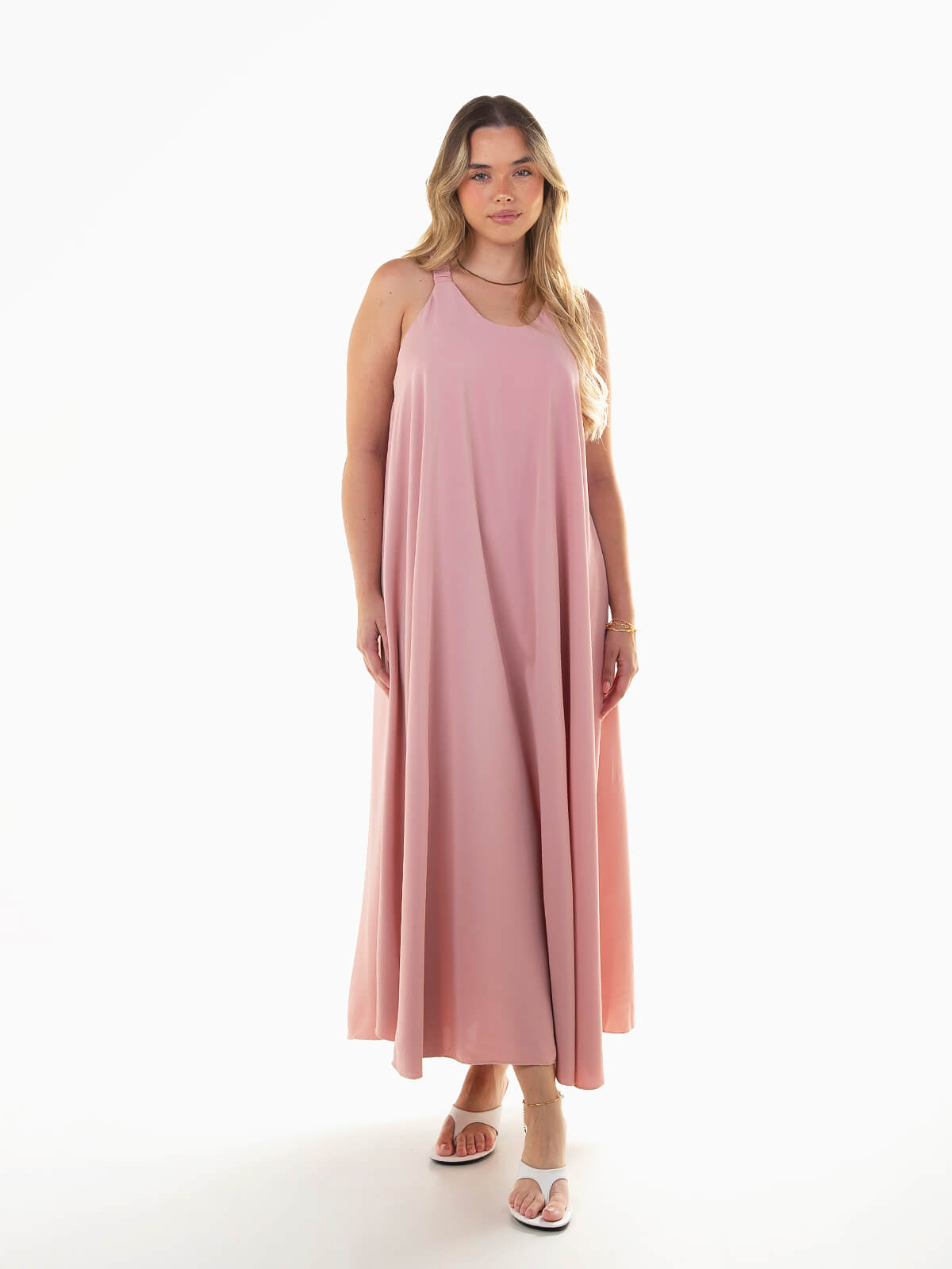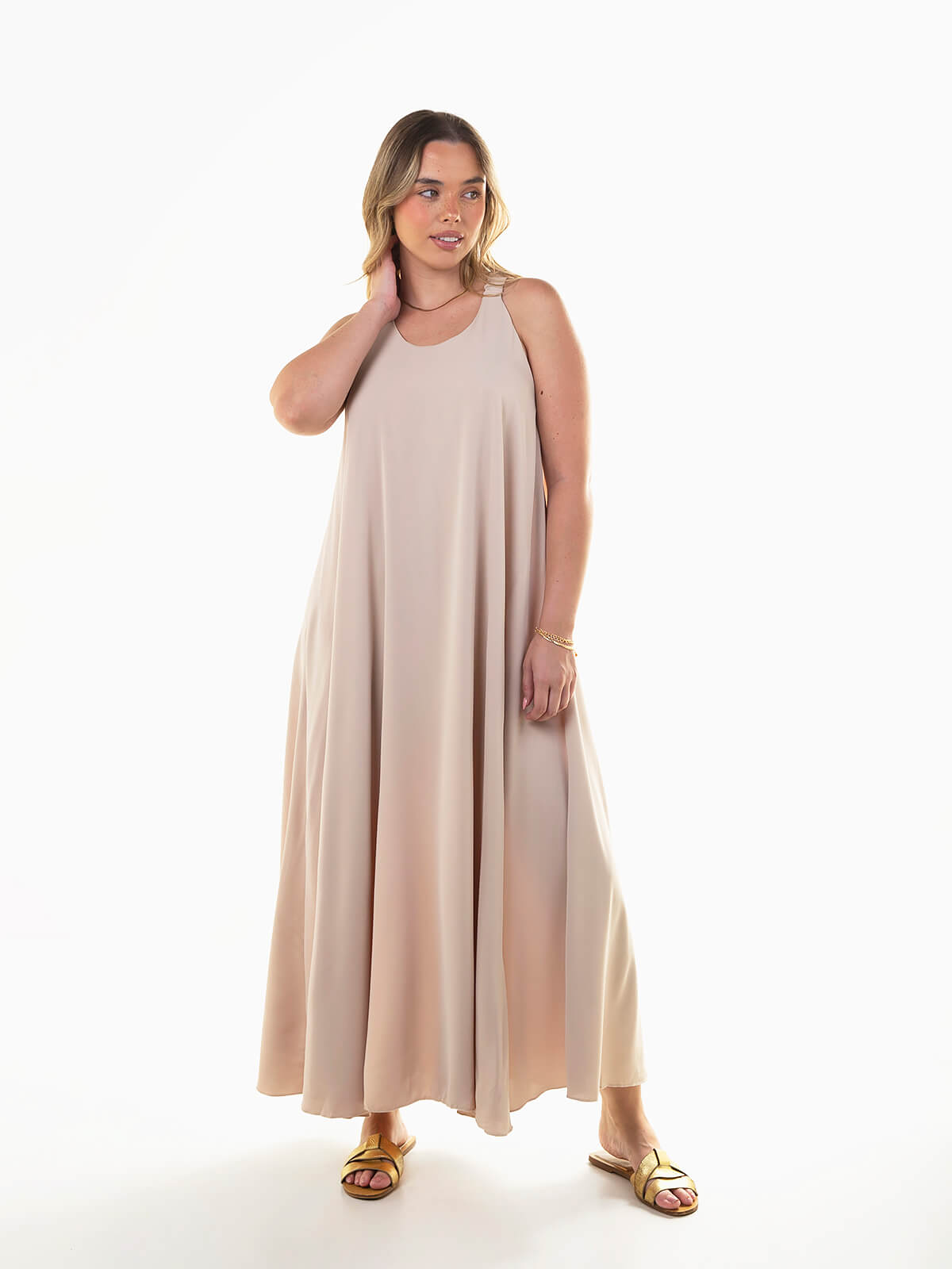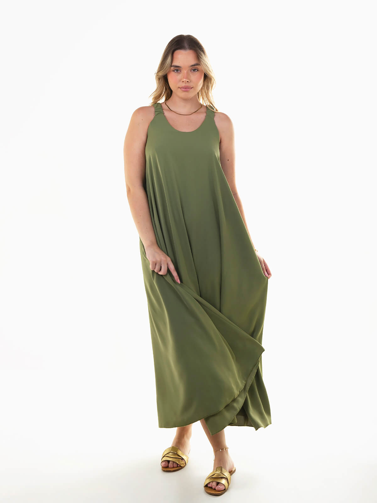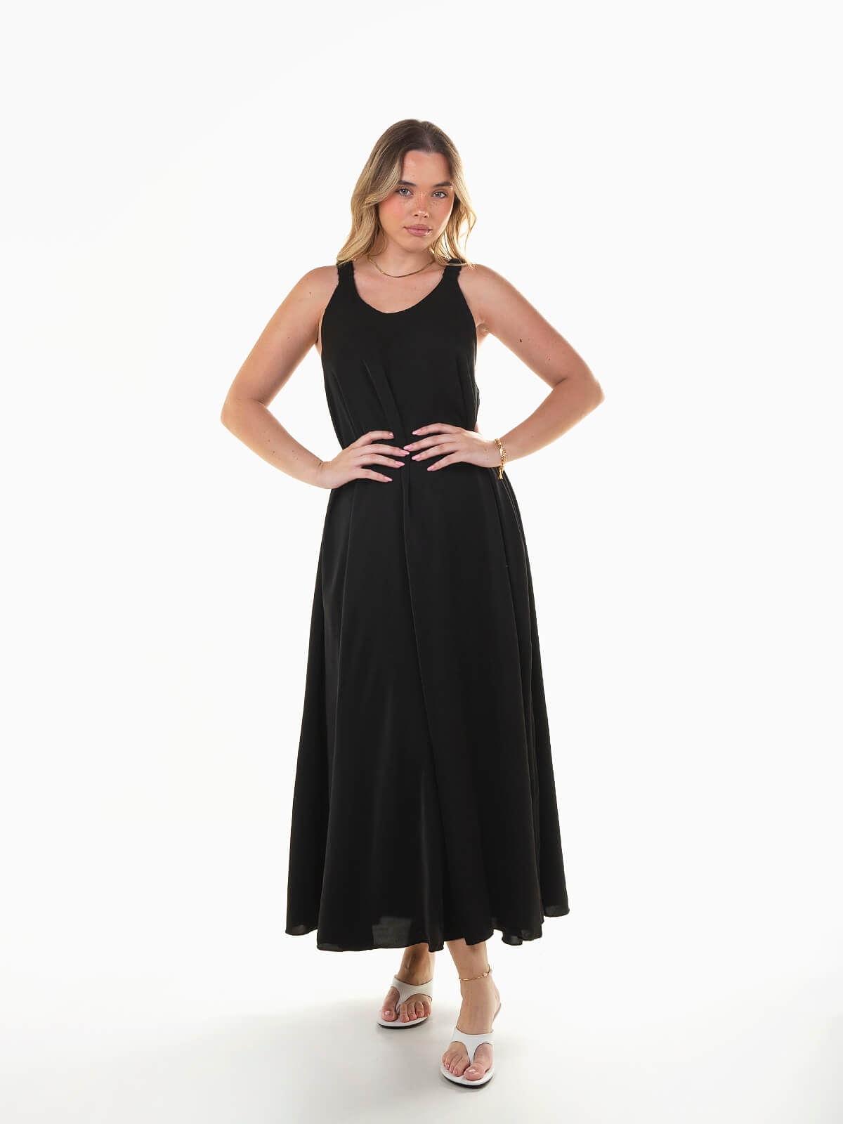 Vestido comprido com design minimalista e elegante. Modelo fluído com decote redondo, corte evasé e alças elásticas cruzadas nas costas. Uma peça versátil e confortável, perfeita para looks de verão descontraídos com um toque sofisticado.