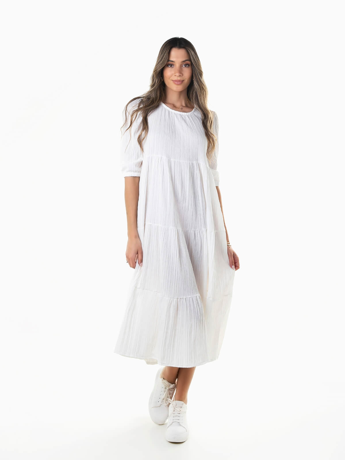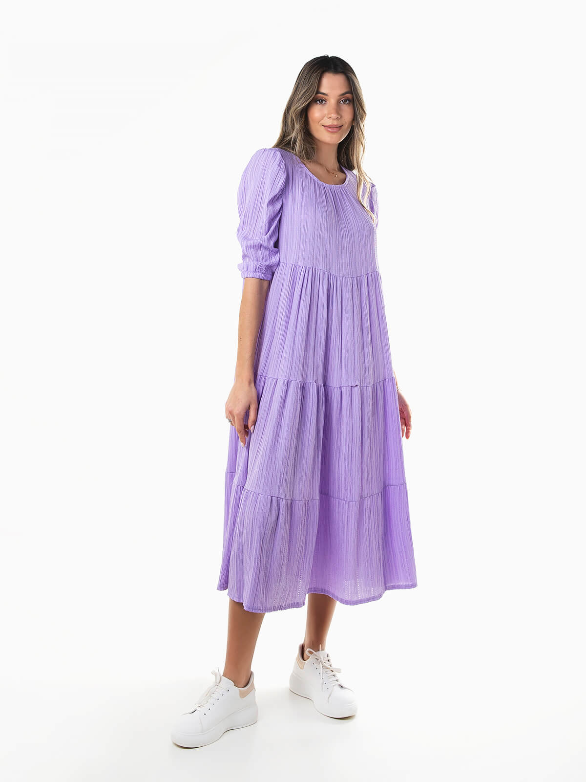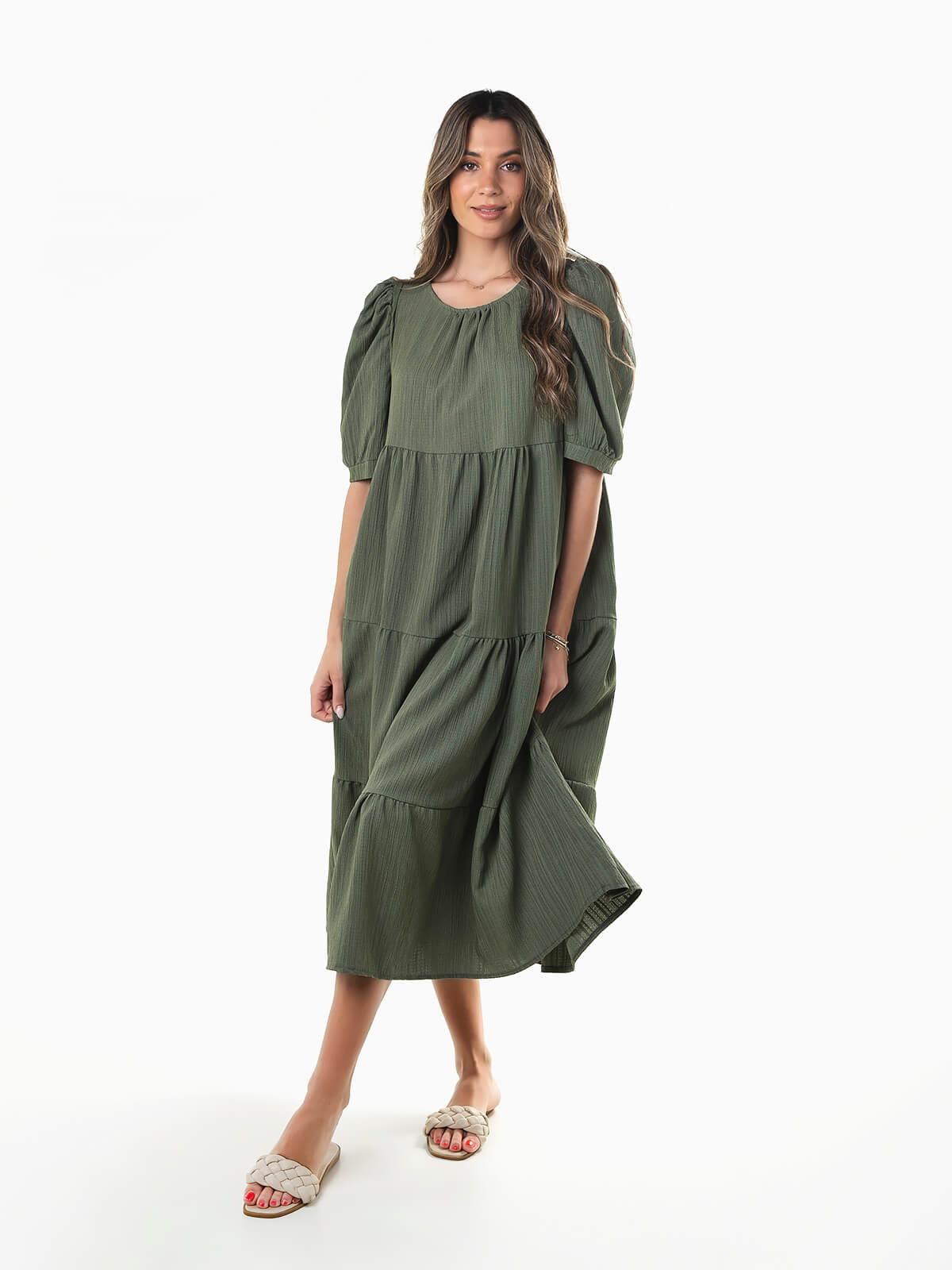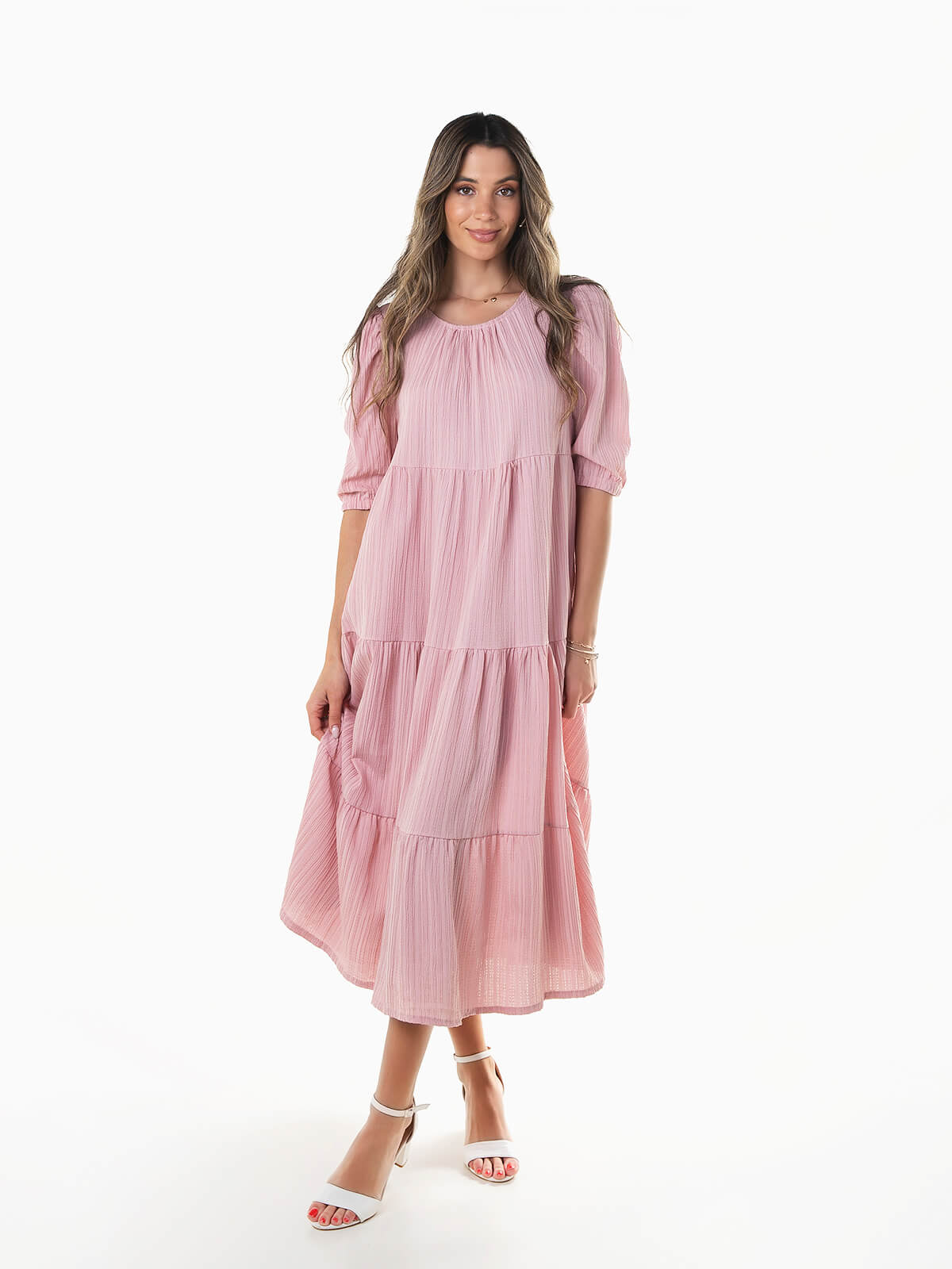 Vestido fluído midi com encaixe de folhos. Vestido de manga curta abalonada em tecido com relevo. Decote redondo e aperto posterior de botão.